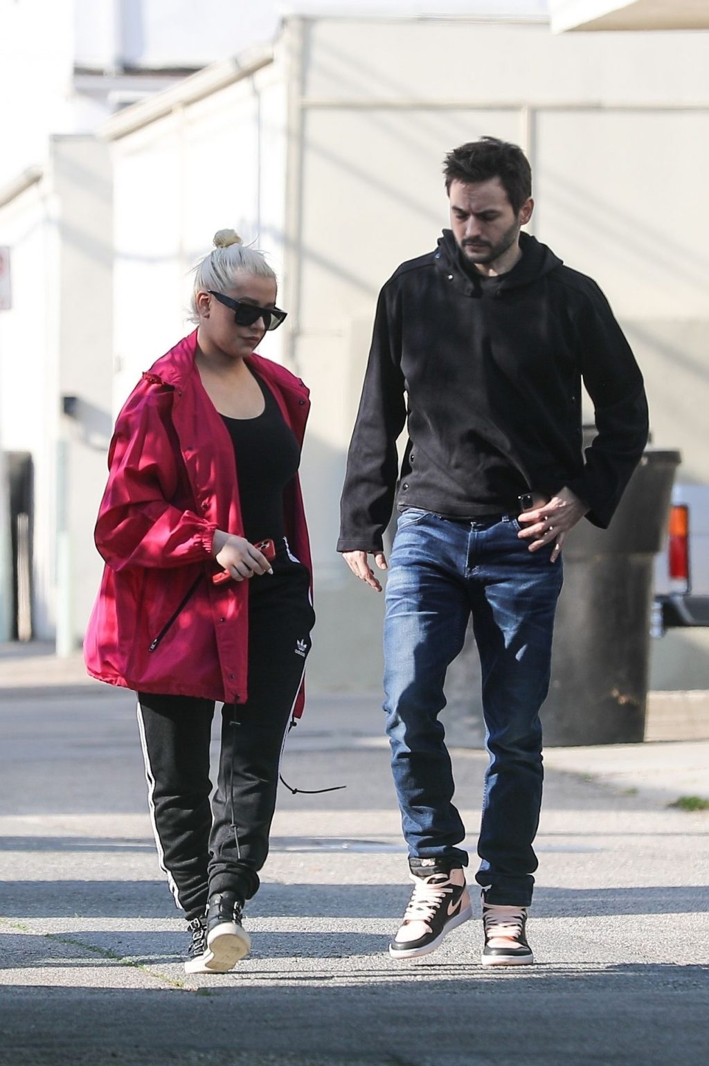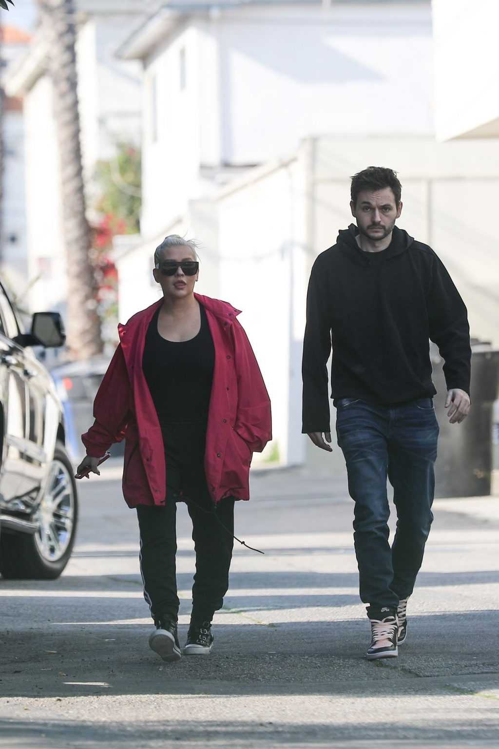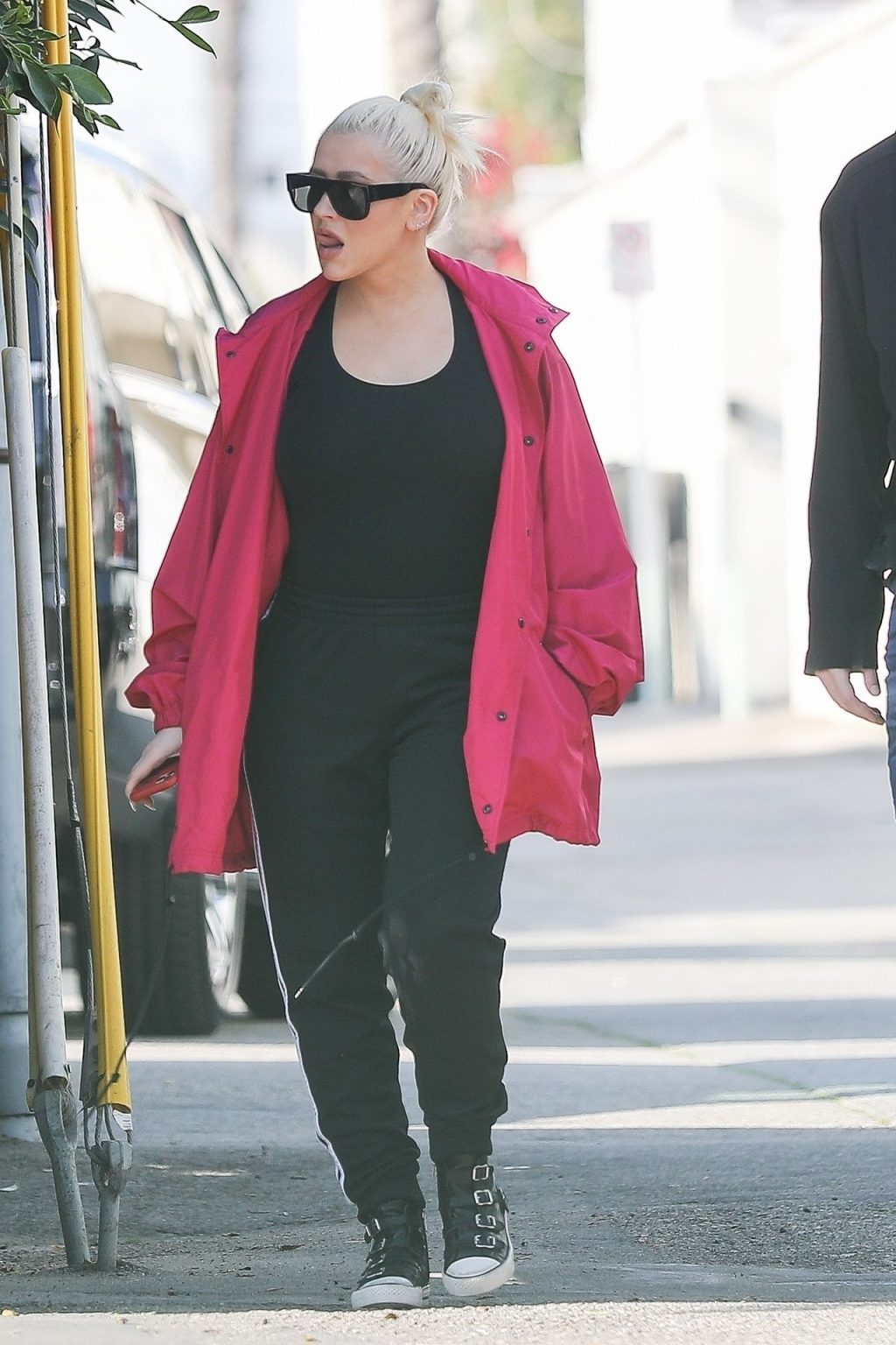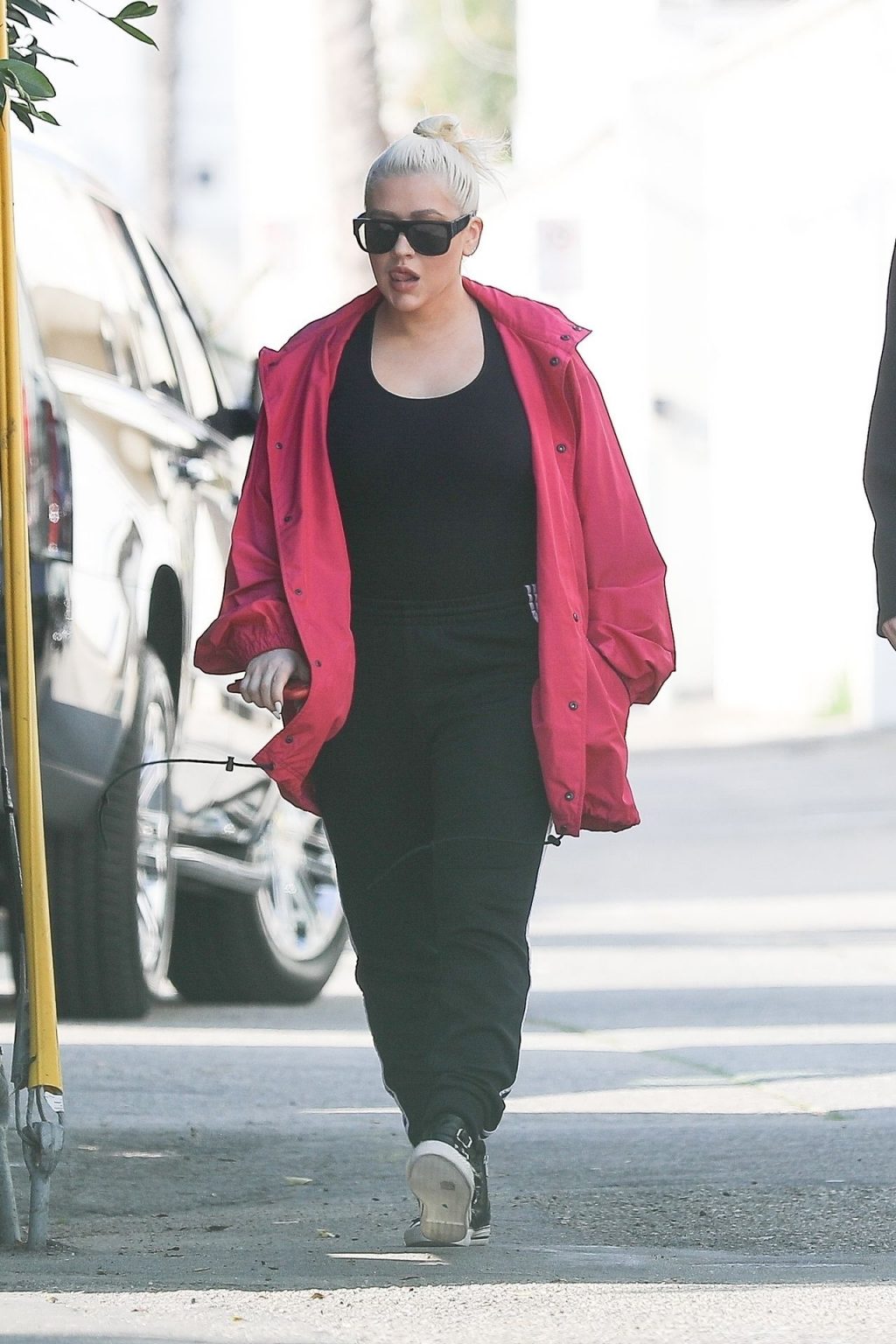 A cantora Christina Aguilera junto com seu parceiro Matthew Rutler chegam à escola de sua filha Summer Rain Rutler para buscá-la – Santa Monica, 14/01/2020. Christina veste um corta-vento Balenciaga rosa choque e óculos YSL. Ela exibe seu corpo em forma sem sutiã, revelando seus seios através de sua blusa preta transparente.