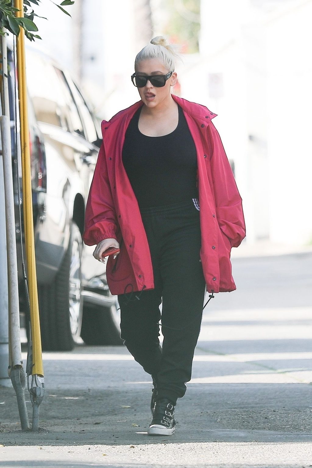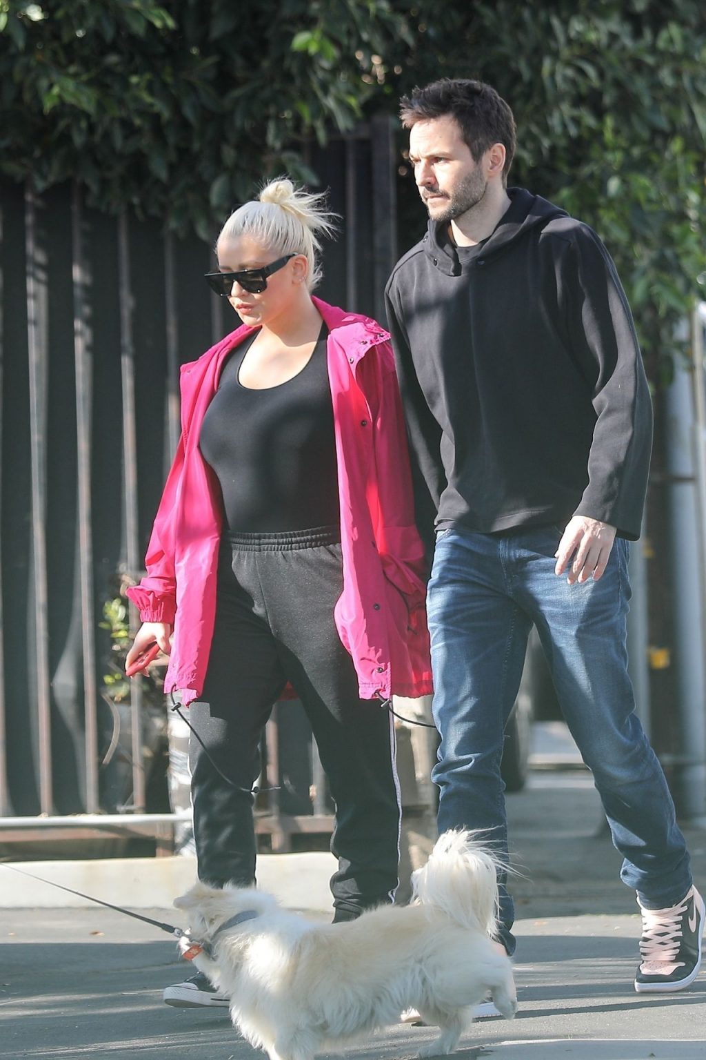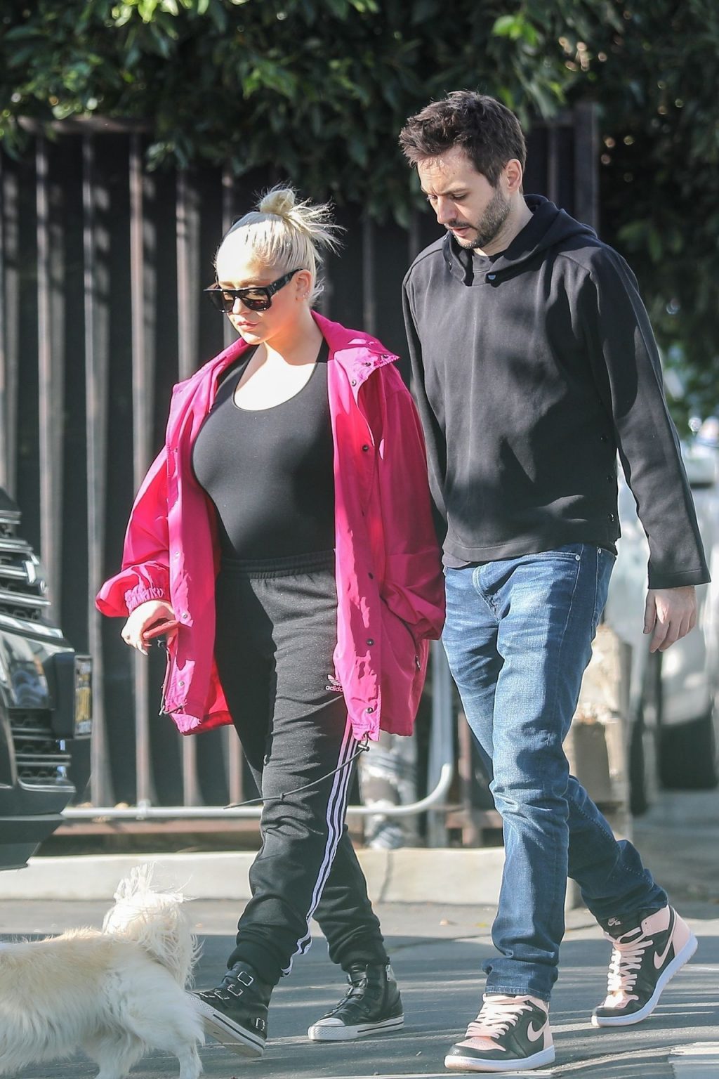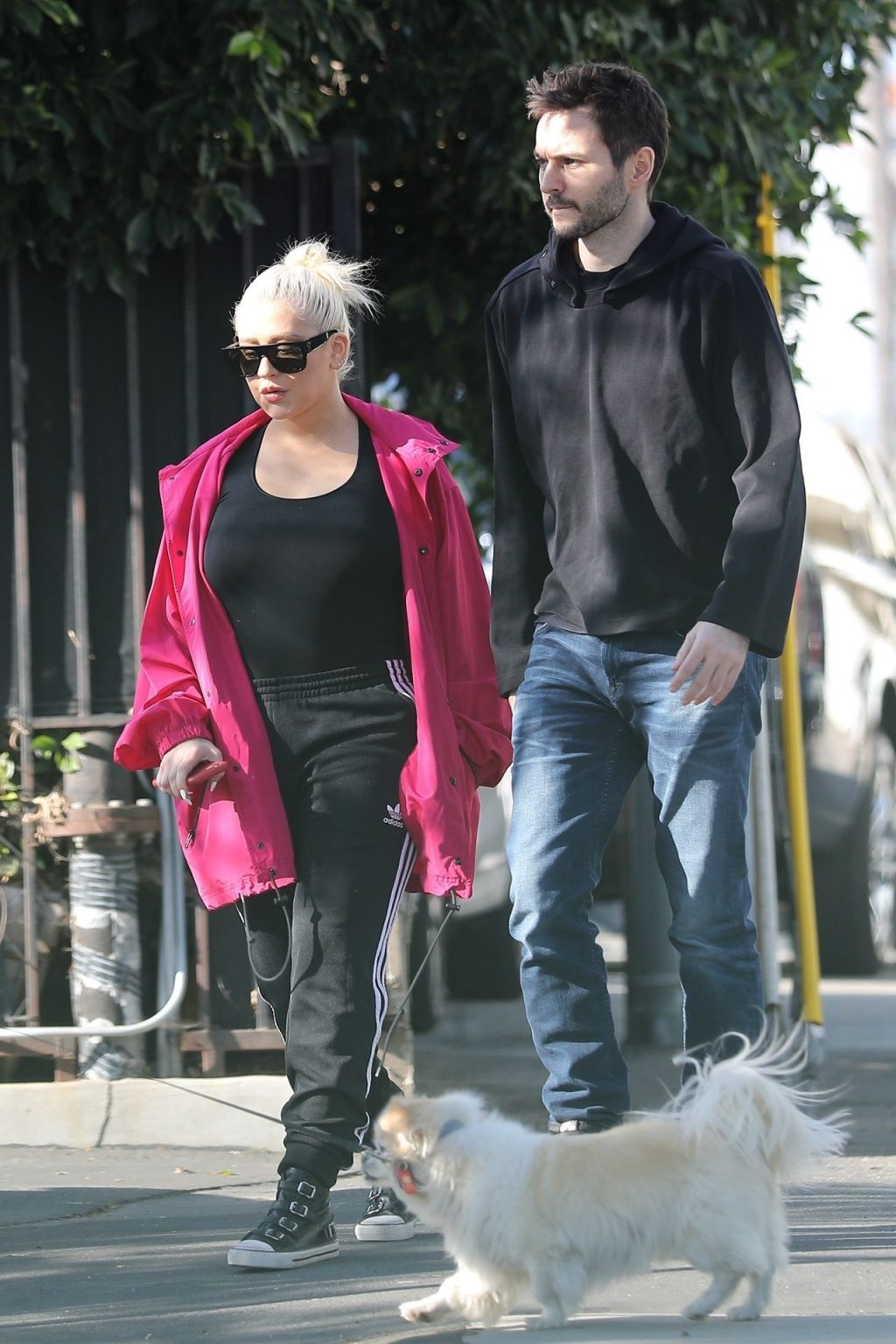 A cantora Christina Aguilera junto com seu parceiro Matthew Rutler chegam à escola de sua filha Summer Rain Rutler para buscá-la – Santa Monica, 14/01/2020. Christina veste um corta-vento Balenciaga rosa choque e óculos YSL. Ela exibe seu corpo em forma sem sutiã, revelando seus seios através de sua blusa preta transparente.