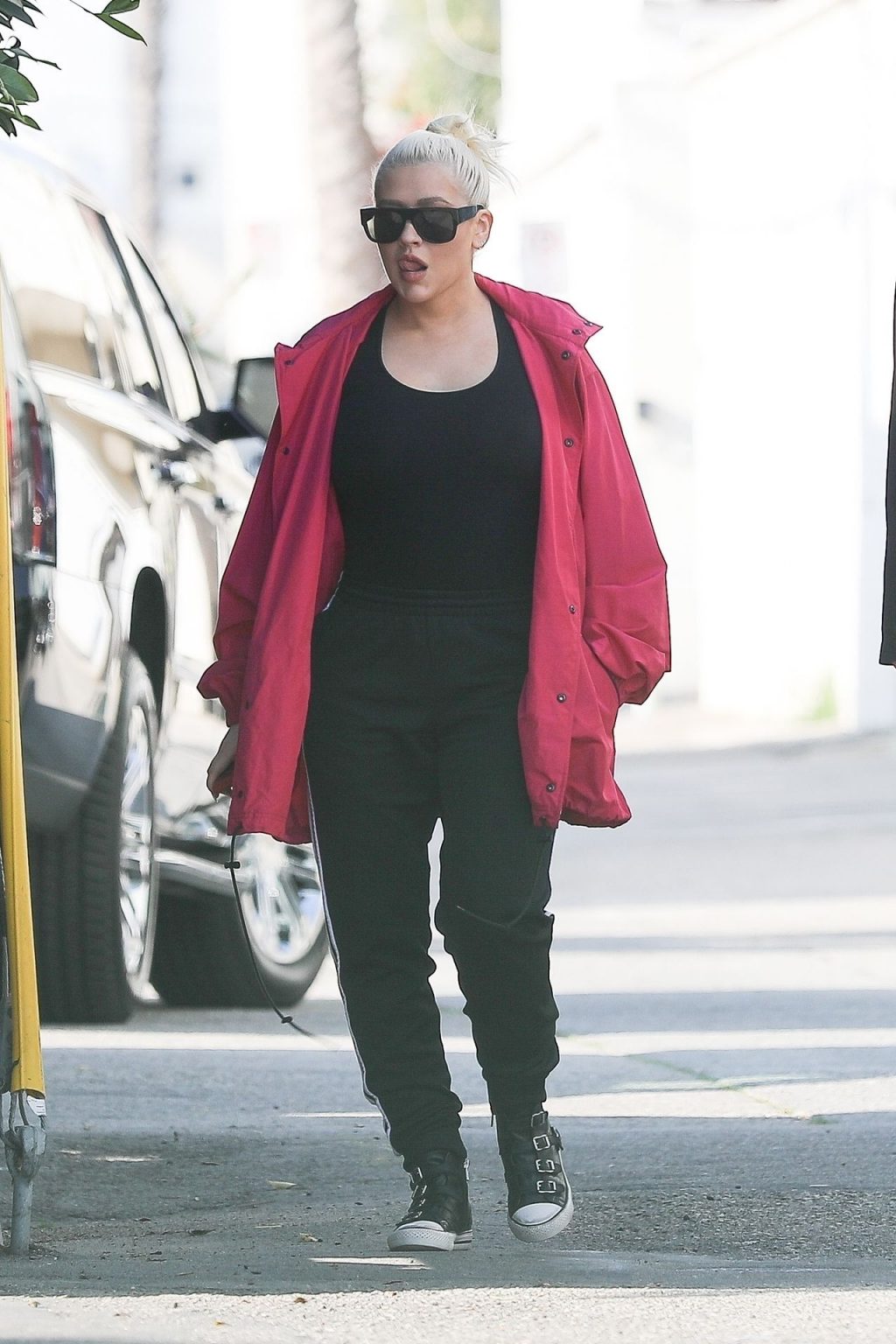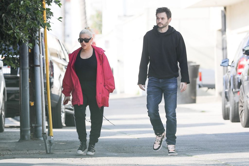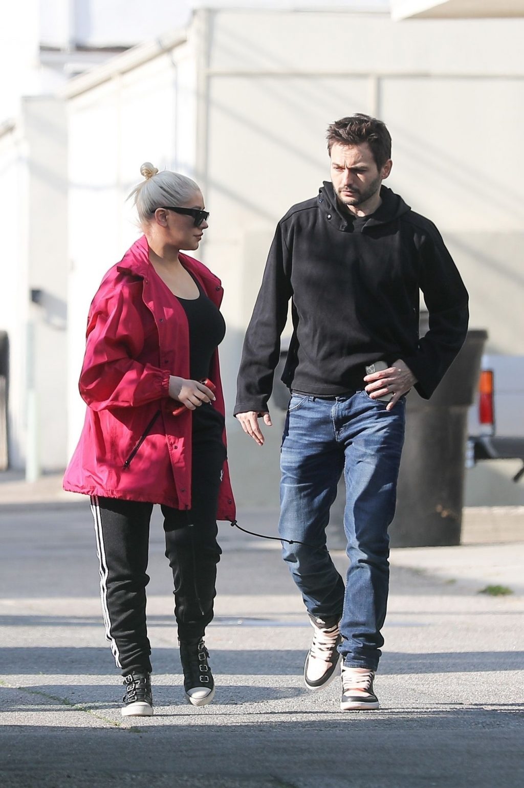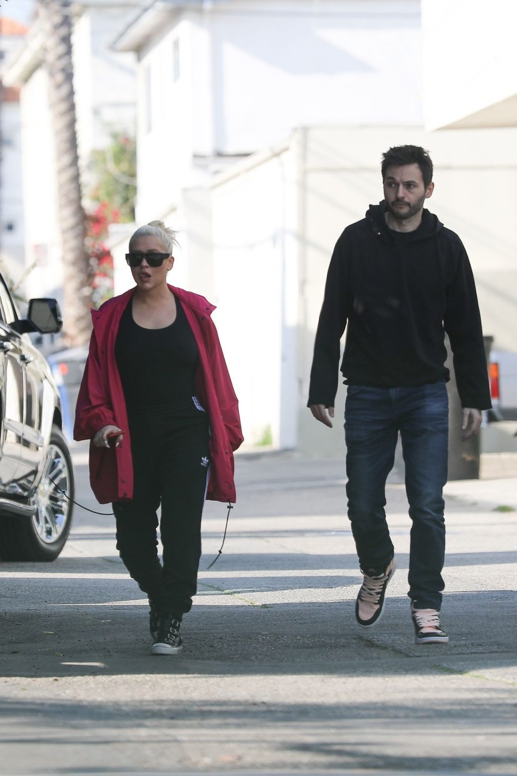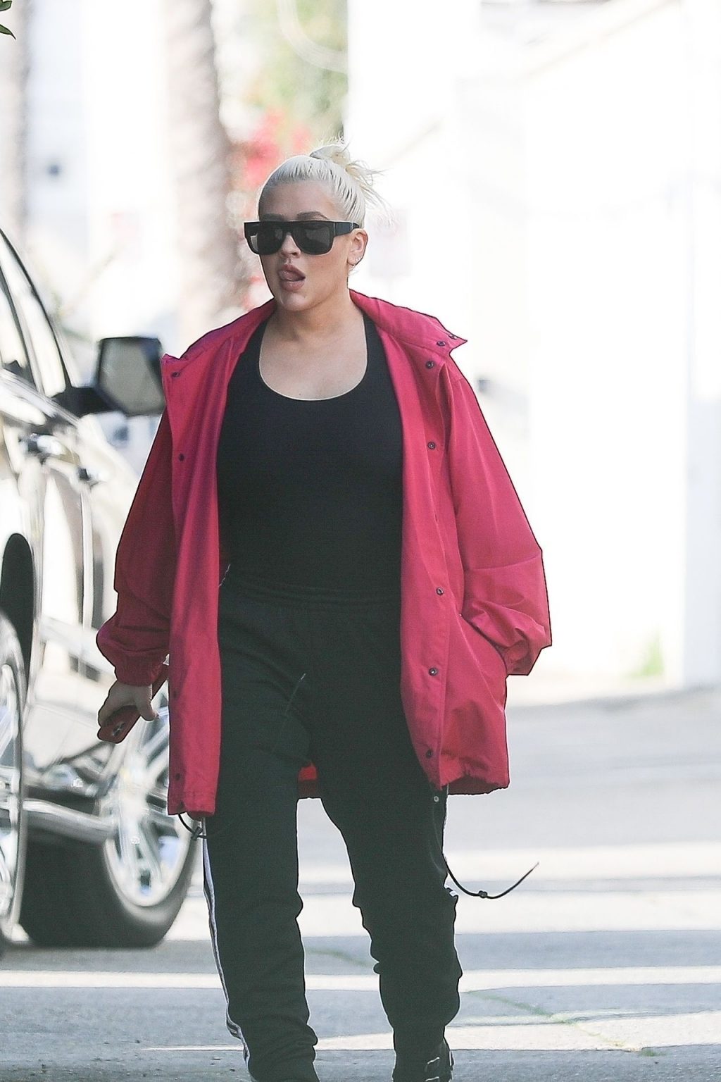 A cantora Christina Aguilera junto com seu parceiro Matthew Rutler chegam à escola de sua filha Summer Rain Rutler para buscá-la – Santa Monica, 14/01/2020. Christina veste um corta-vento Balenciaga rosa choque e óculos YSL. Ela exibe seu corpo em forma sem sutiã, revelando seus seios através de sua blusa preta transparente.
