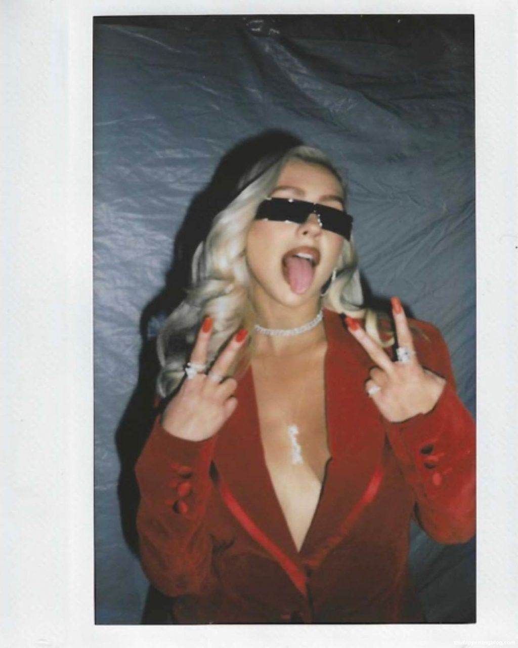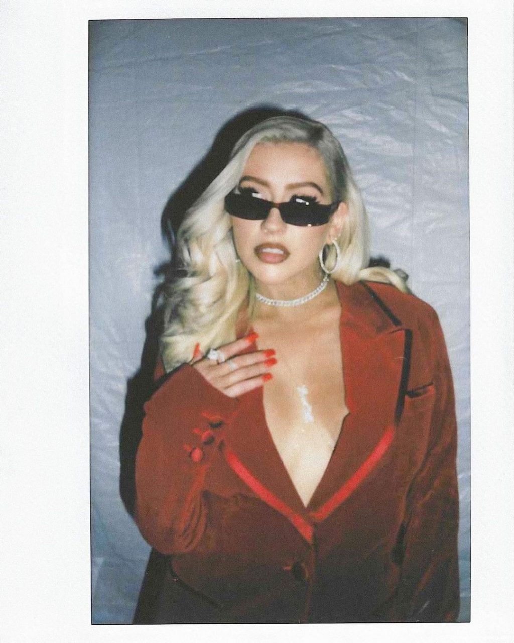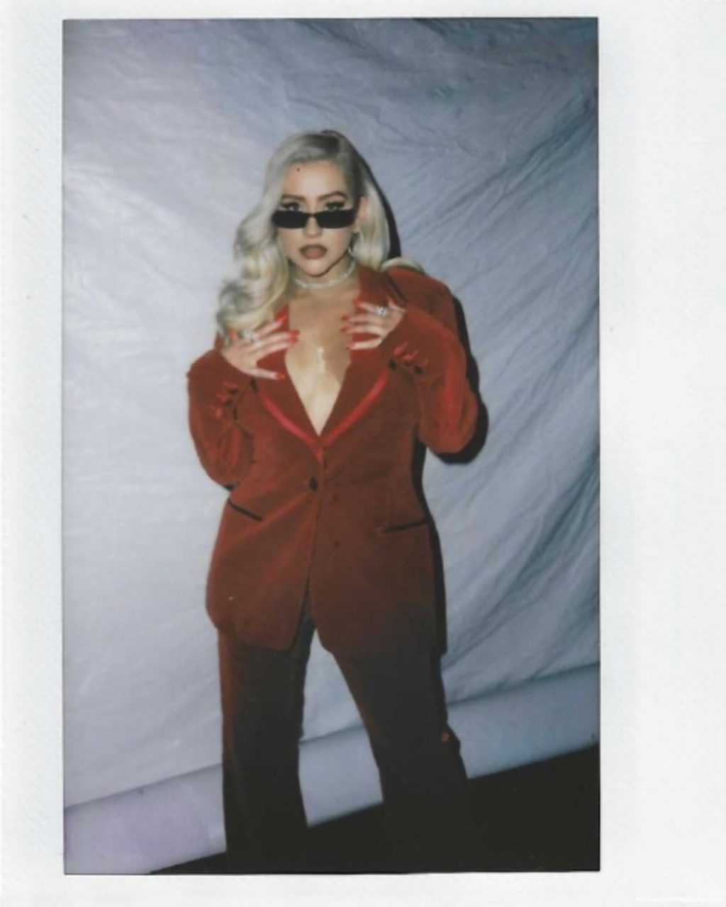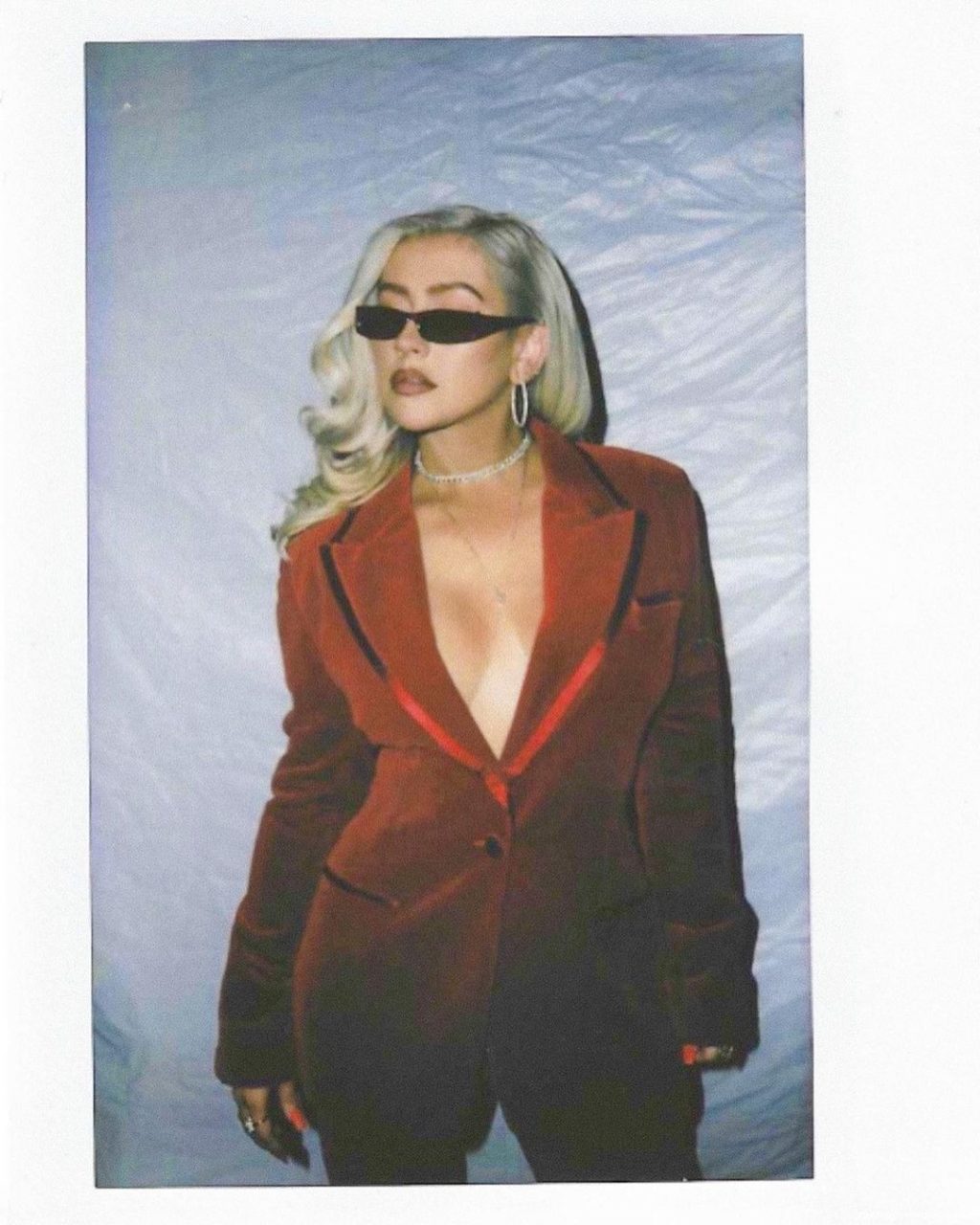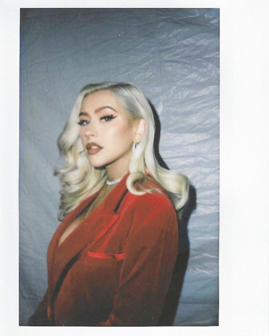 Cantora Christina Aguilera posa sem sutiã, mostrando um belo decote com seus grandes seios em um terno vermelho – Instagram, 28/08/2021.