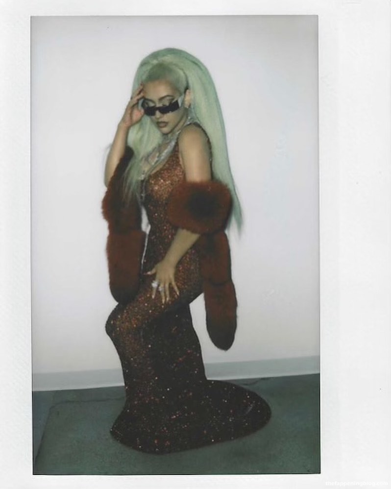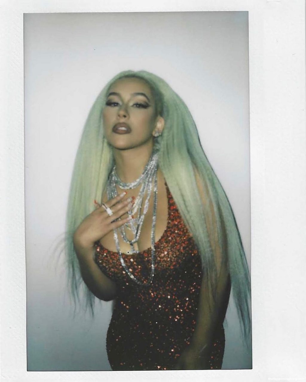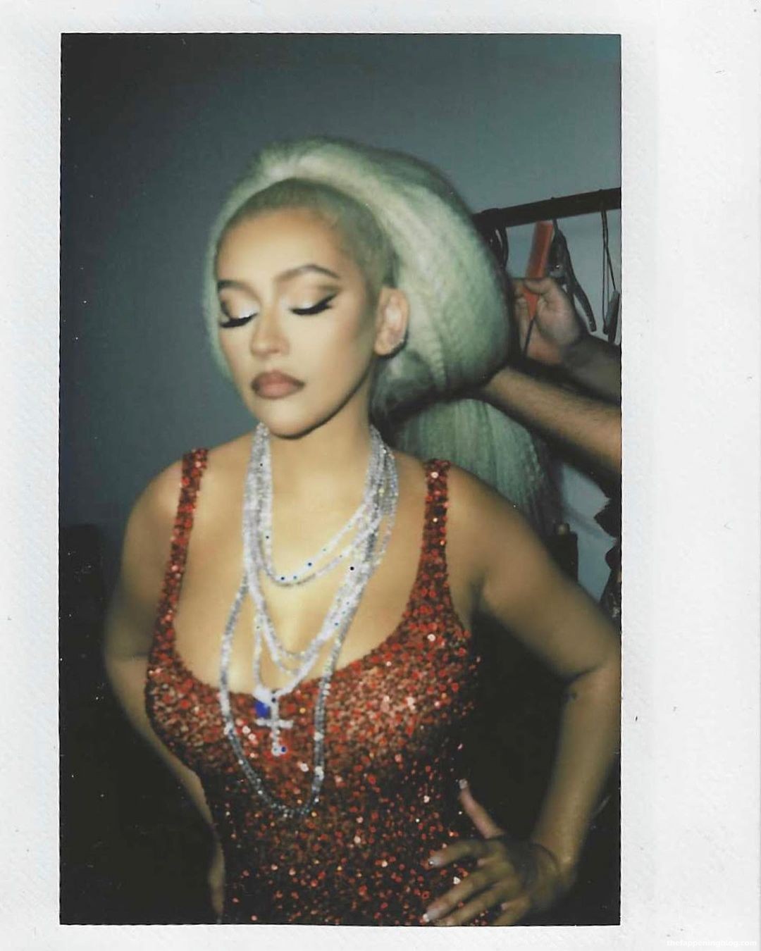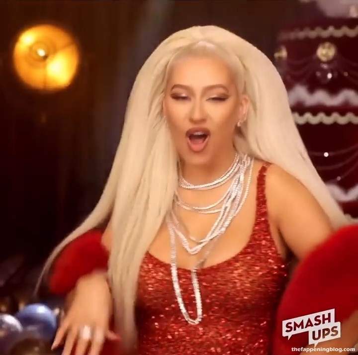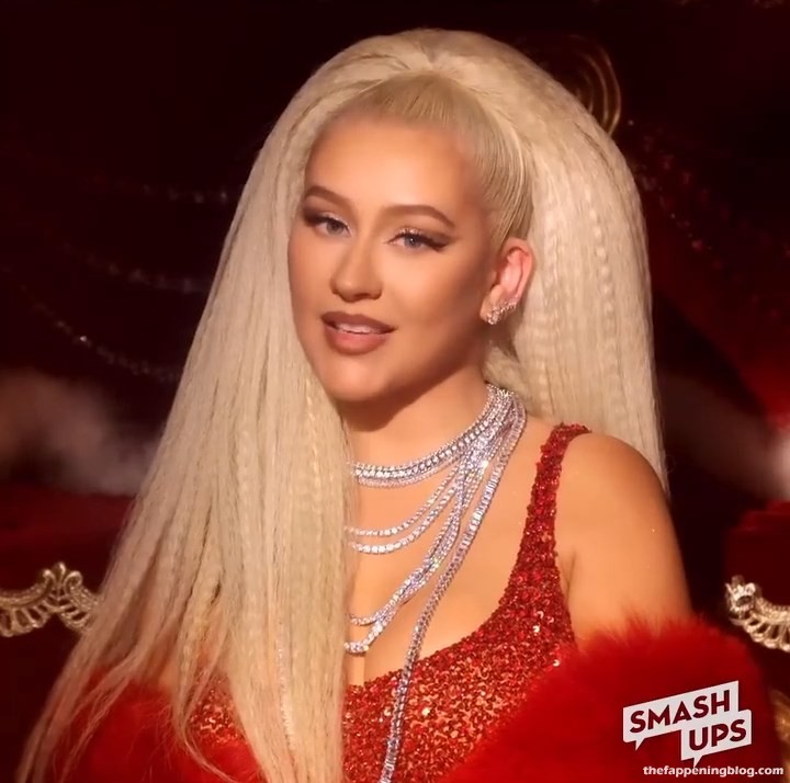 A cantora Christina Aguilera promove o serviço SmashUps, exibindo seu belo decote em um vestido vermelho – Instagram, 05/10/2021. Um bom presente são seus seios nus!