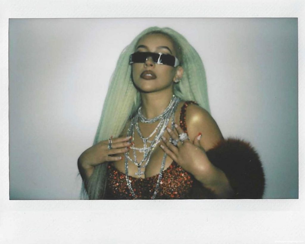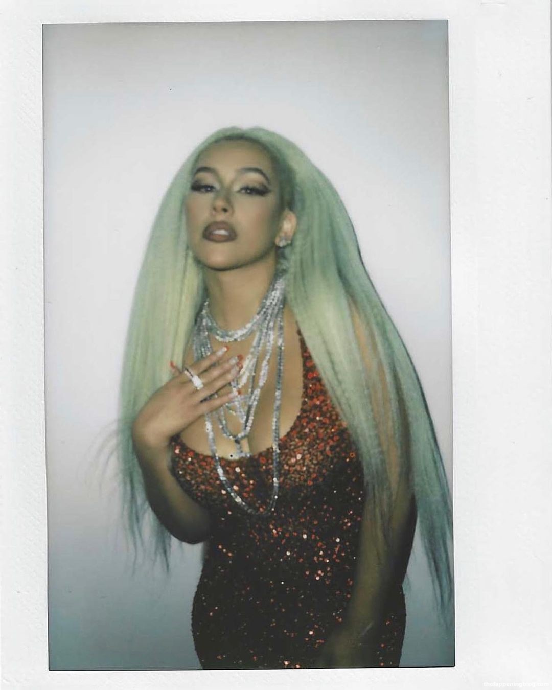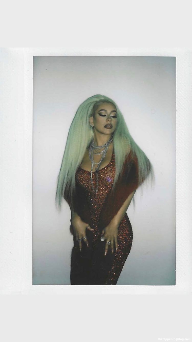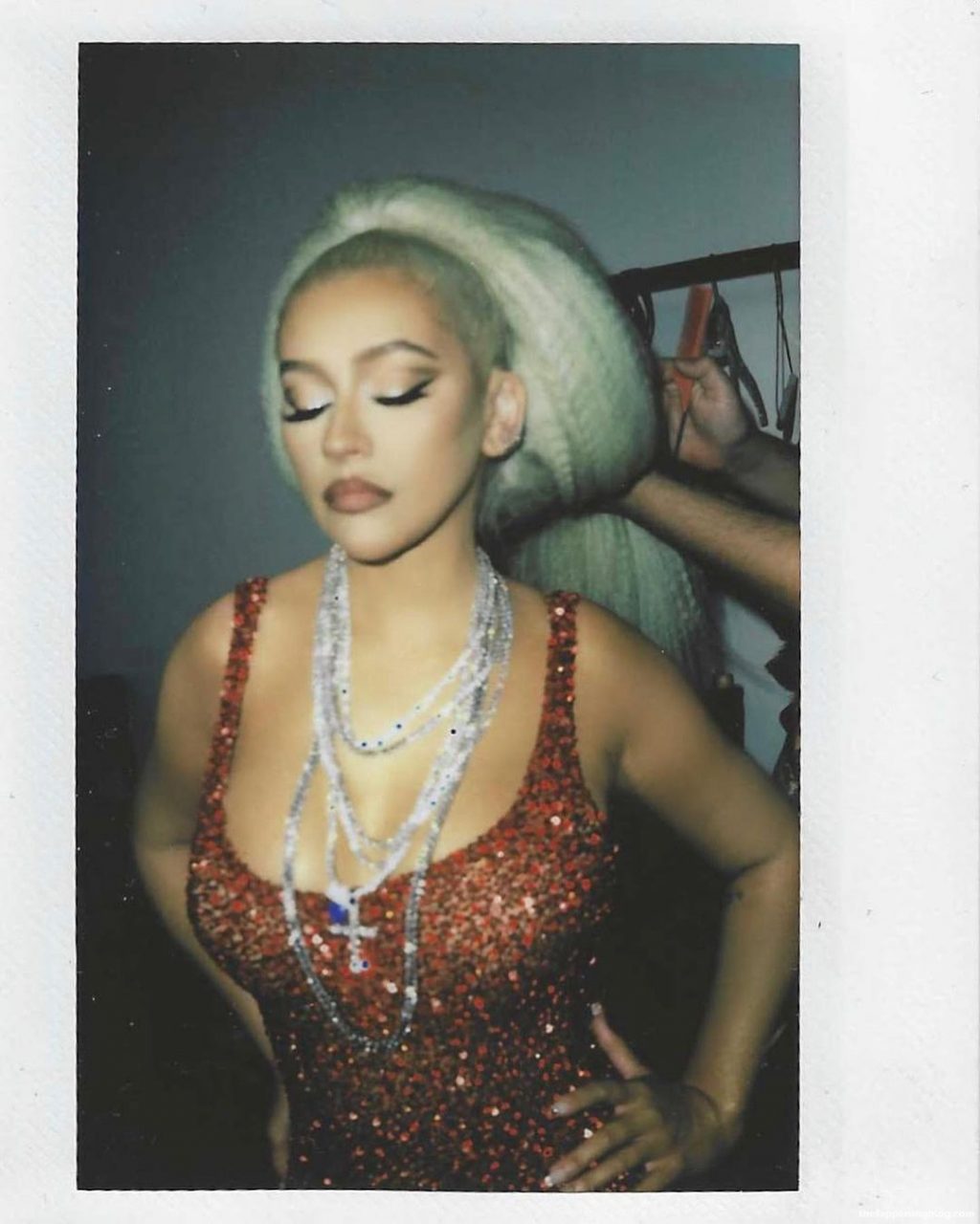 A cantora Christina Aguilera promove o serviço SmashUps, exibindo seu belo decote em um vestido vermelho – Instagram, 05/10/2021. Um bom presente são seus seios nus!