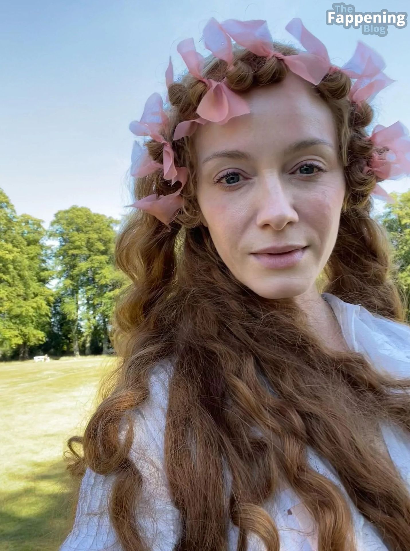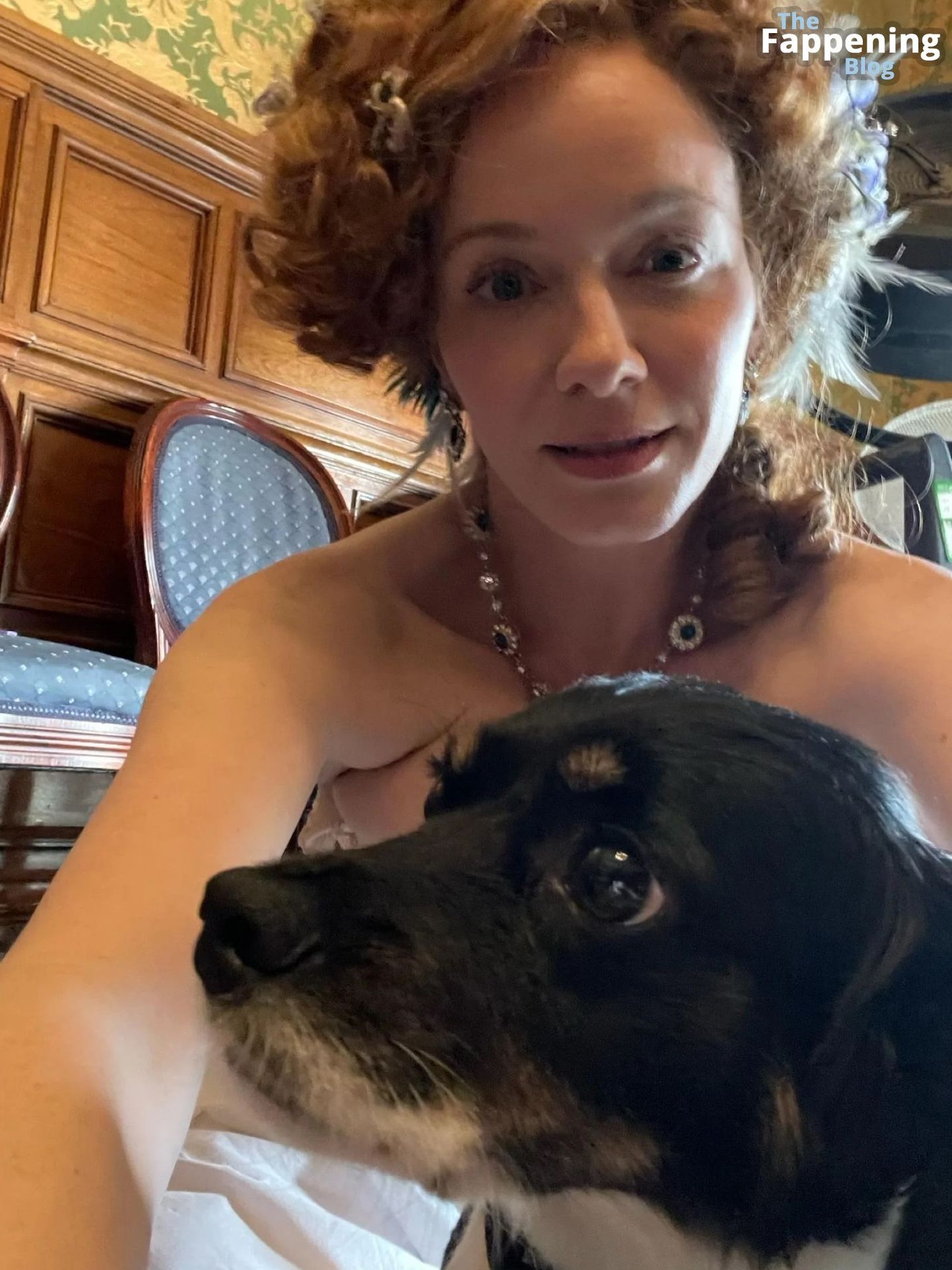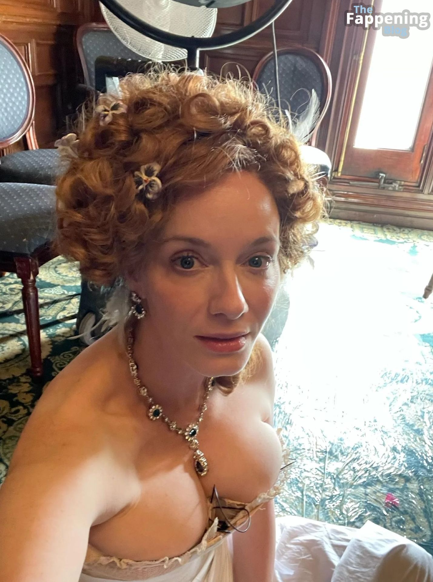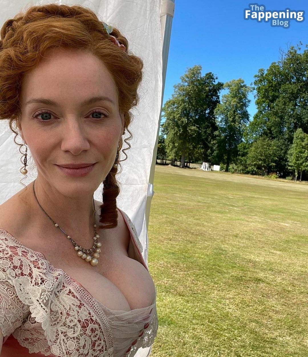 Christina Hendricks exibe seu famoso decote e seus grandes seios no set de “The Buccaneers”.