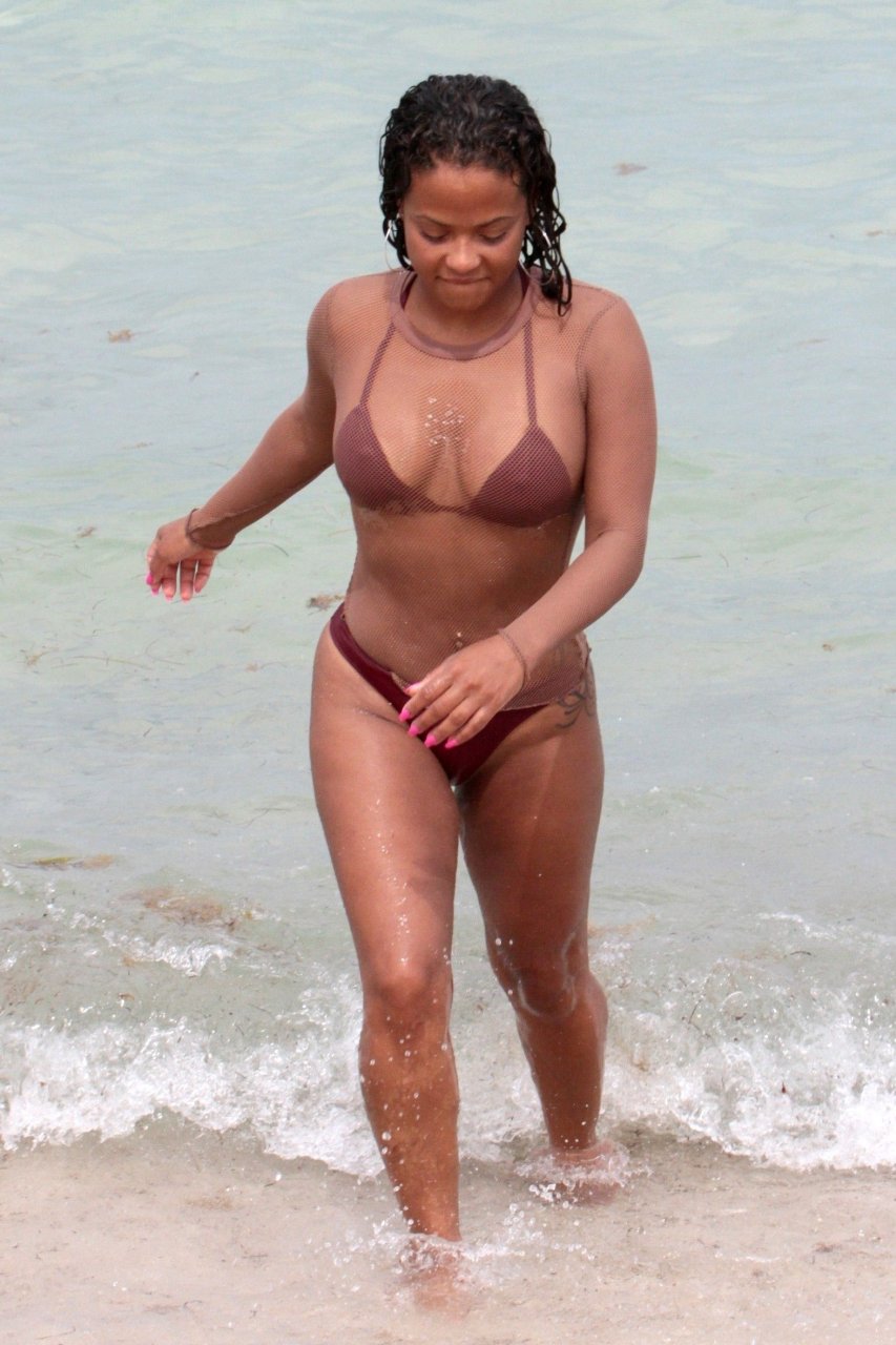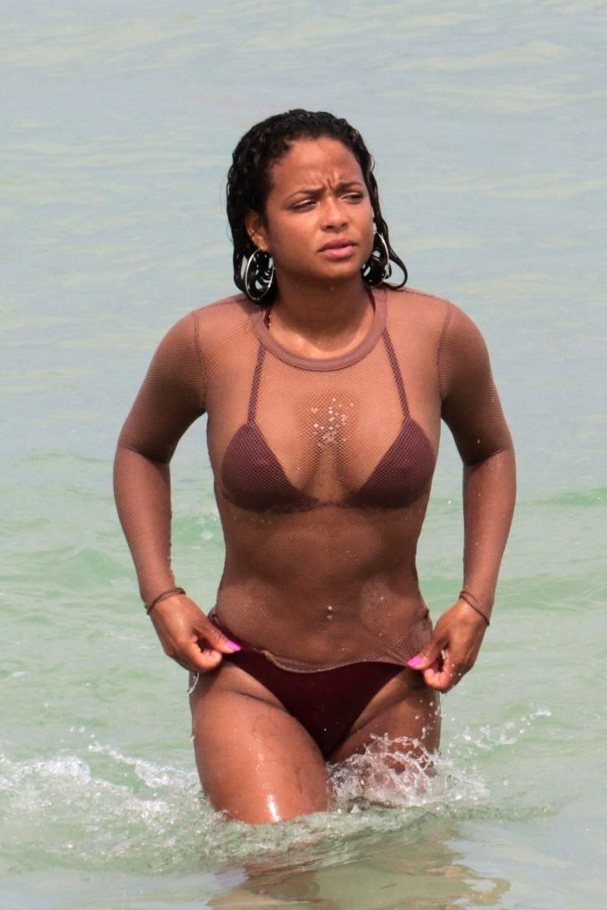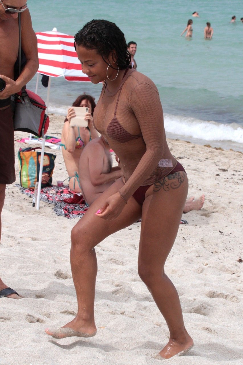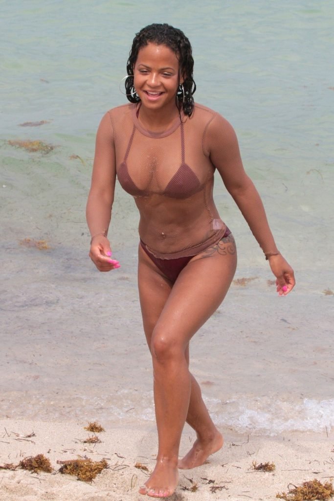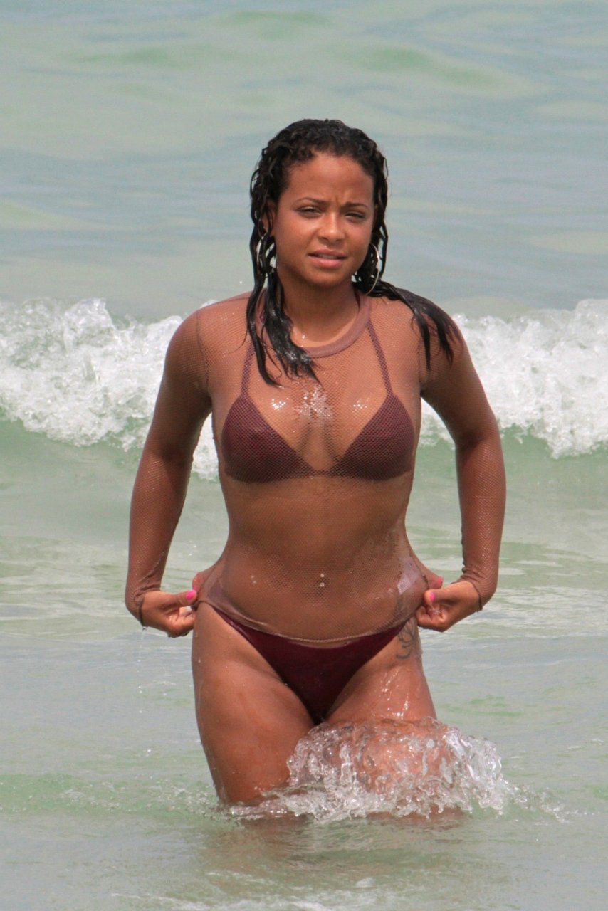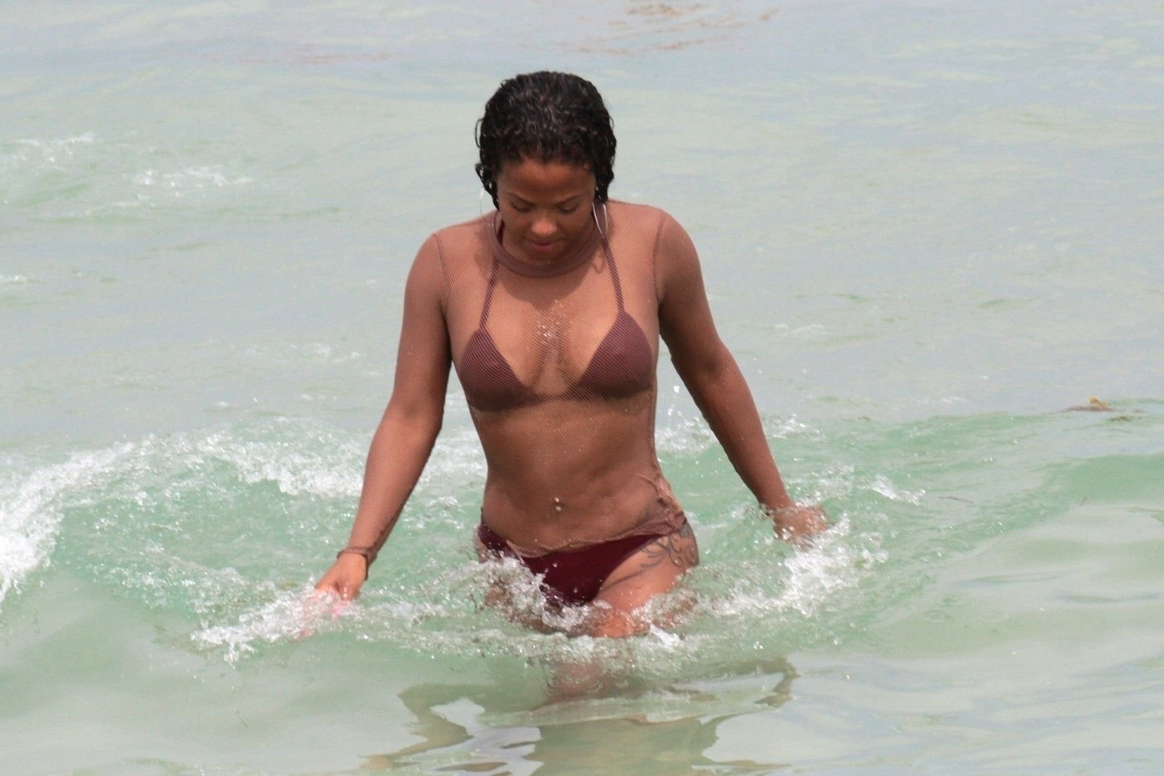Cantora, compositora e atriz americana Christina Milian aproveita a praia com um biquíni marrom, 22/07/2017.