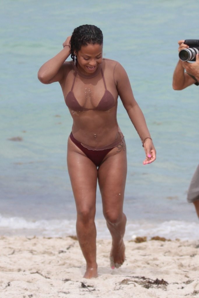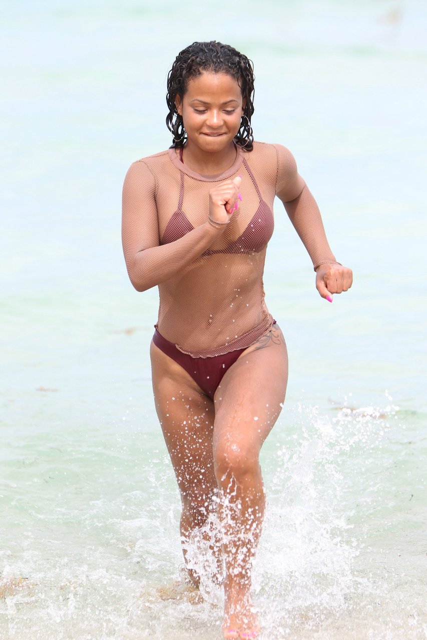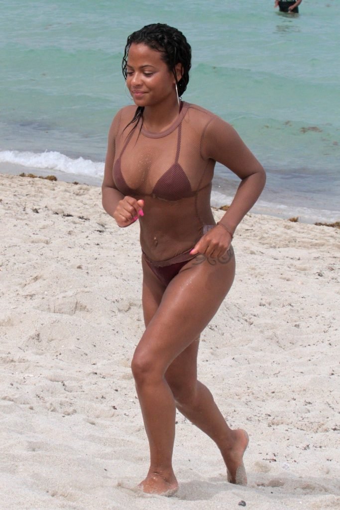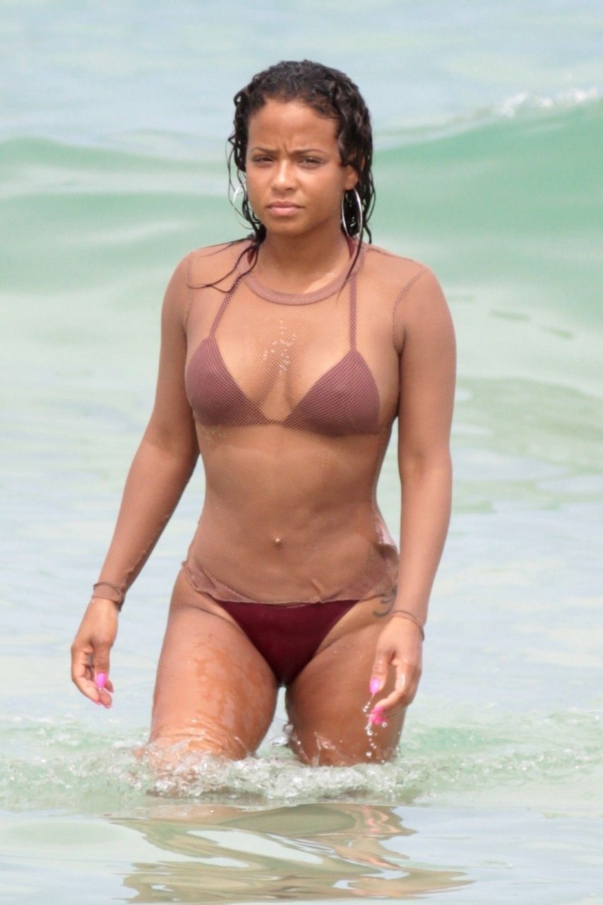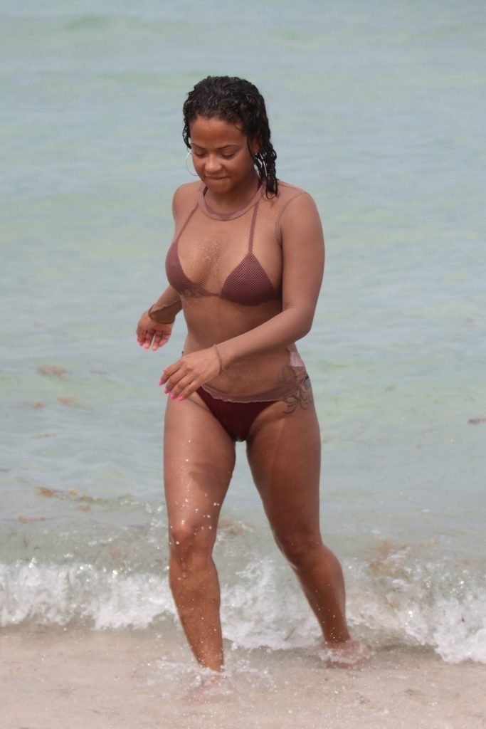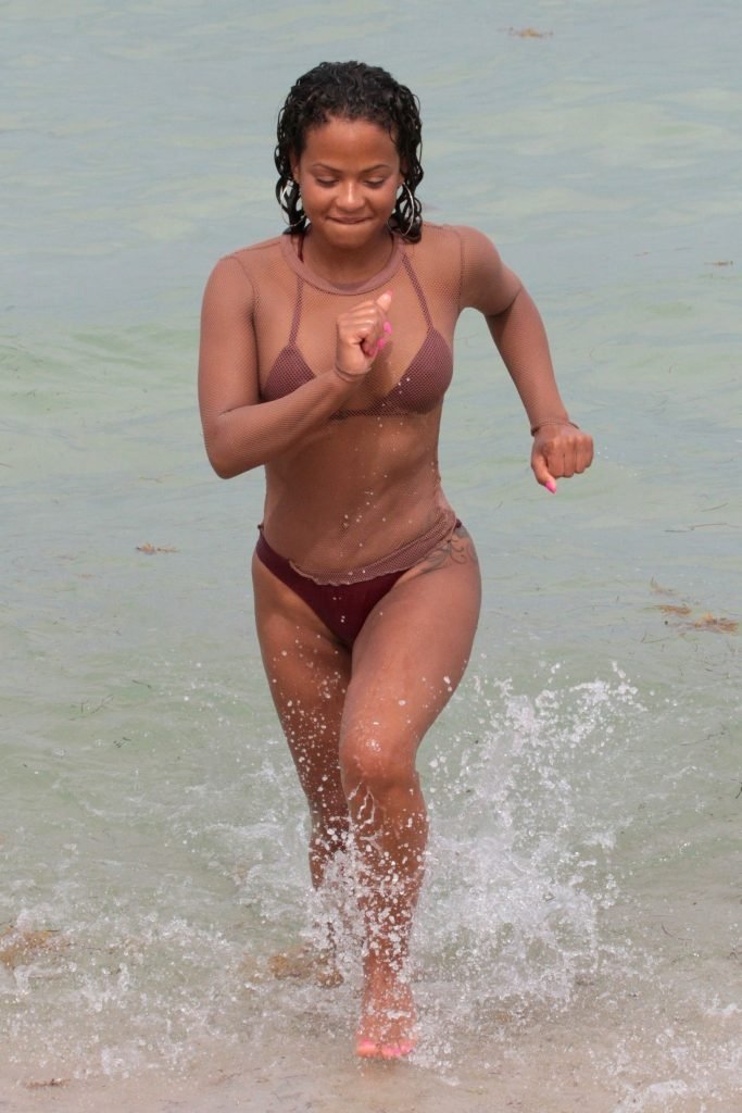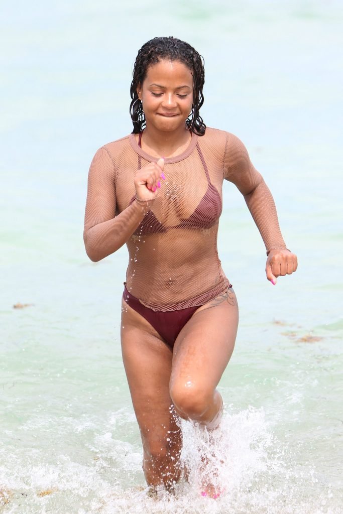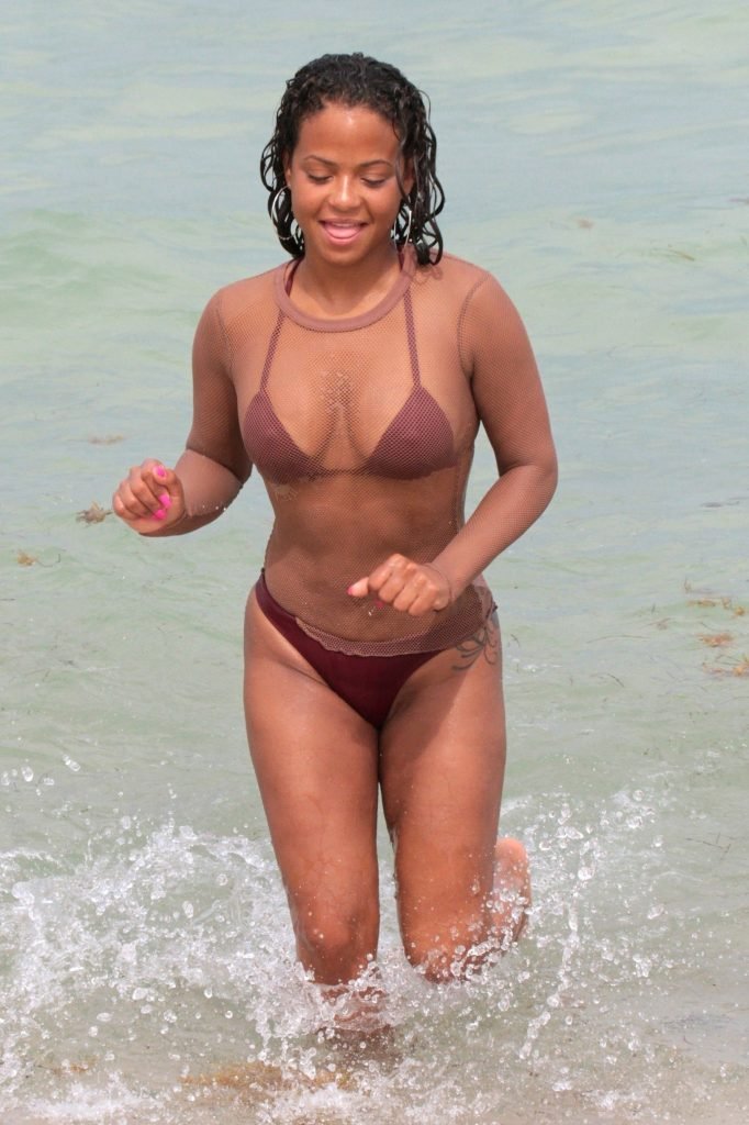 Cantora, compositora e atriz americana Christina Milian aproveita a praia com um biquíni marrom, 22/07/2017.