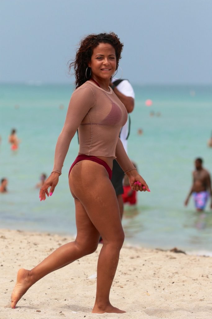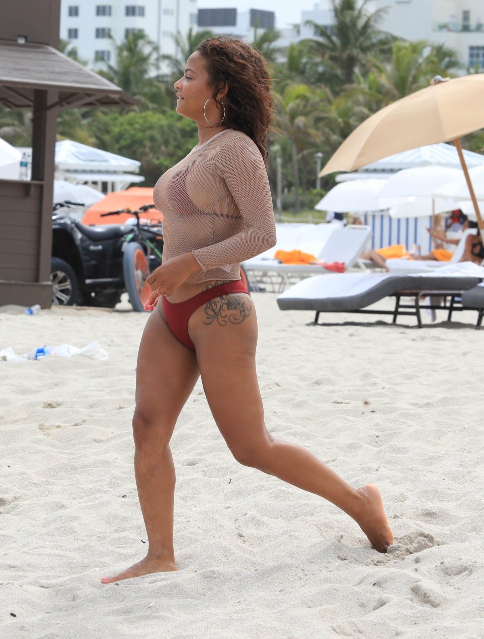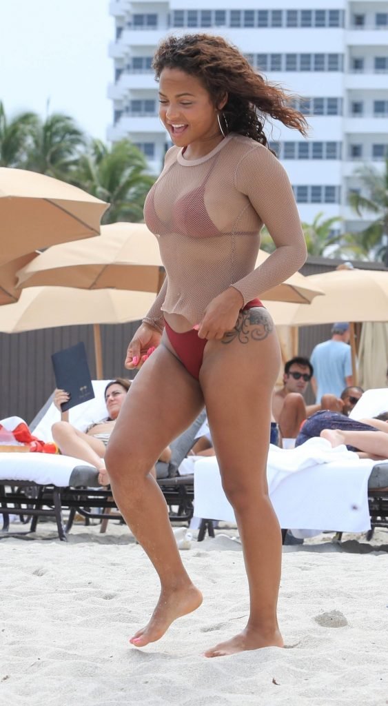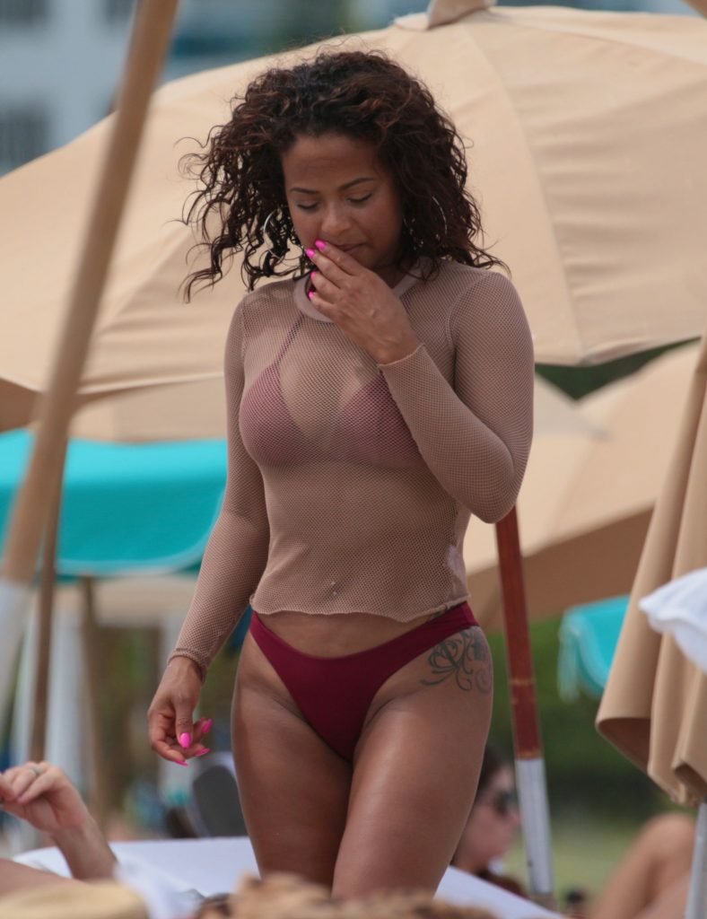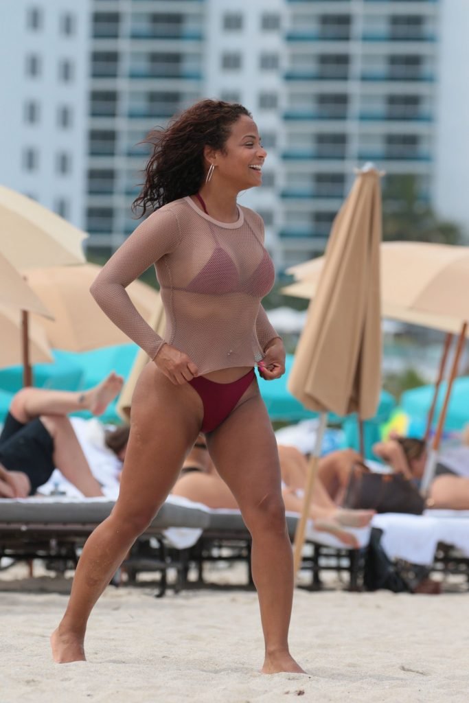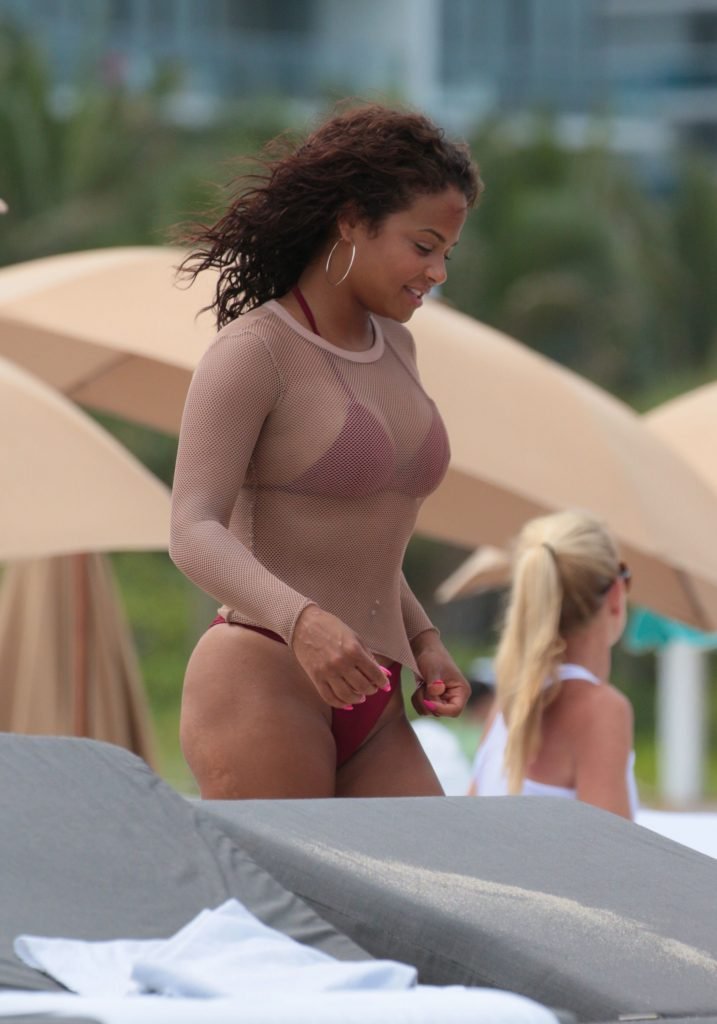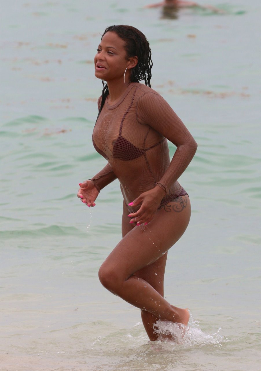Cantora, compositora e atriz americana Christina Milian aproveita a praia com um biquíni marrom, 22/07/2017.