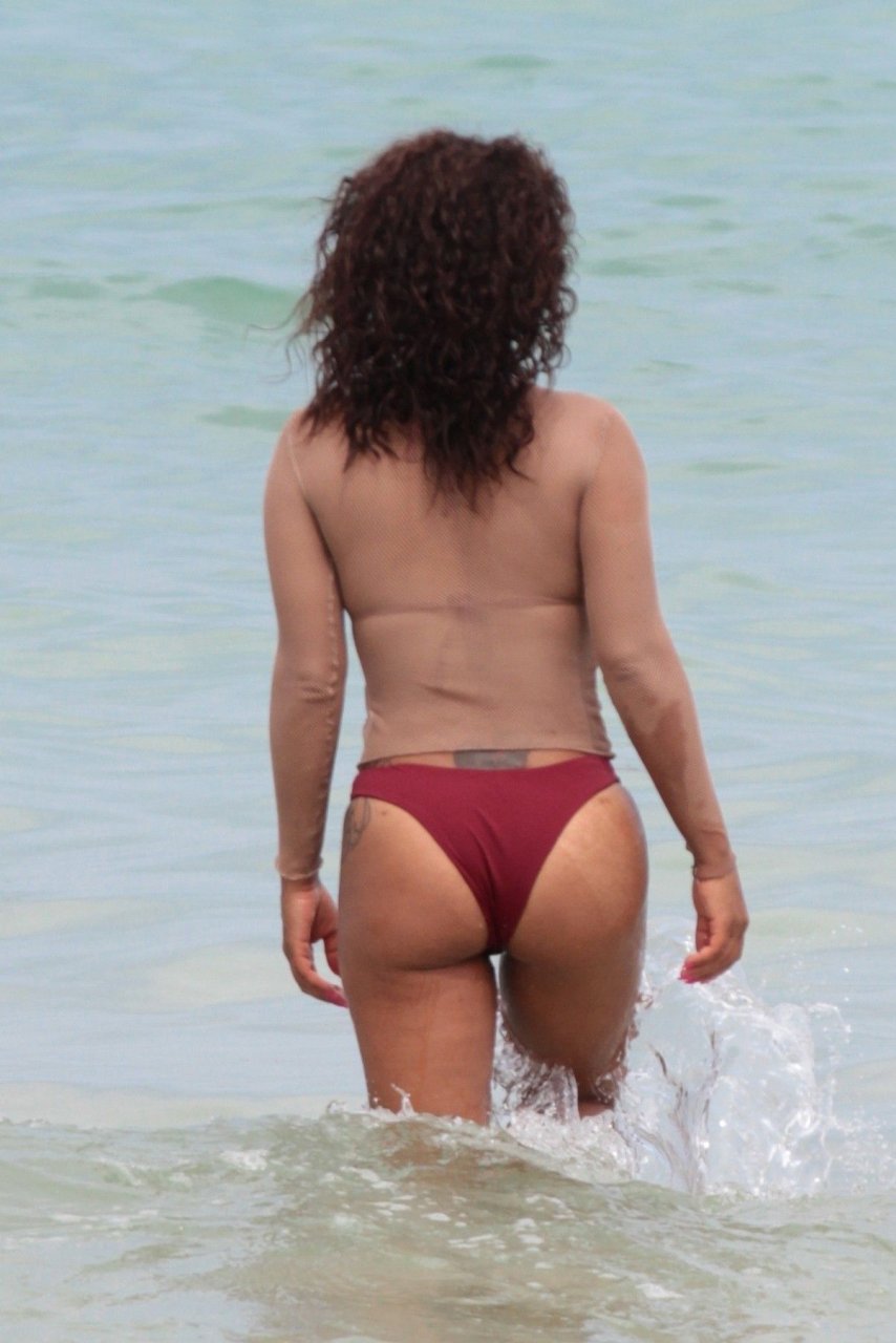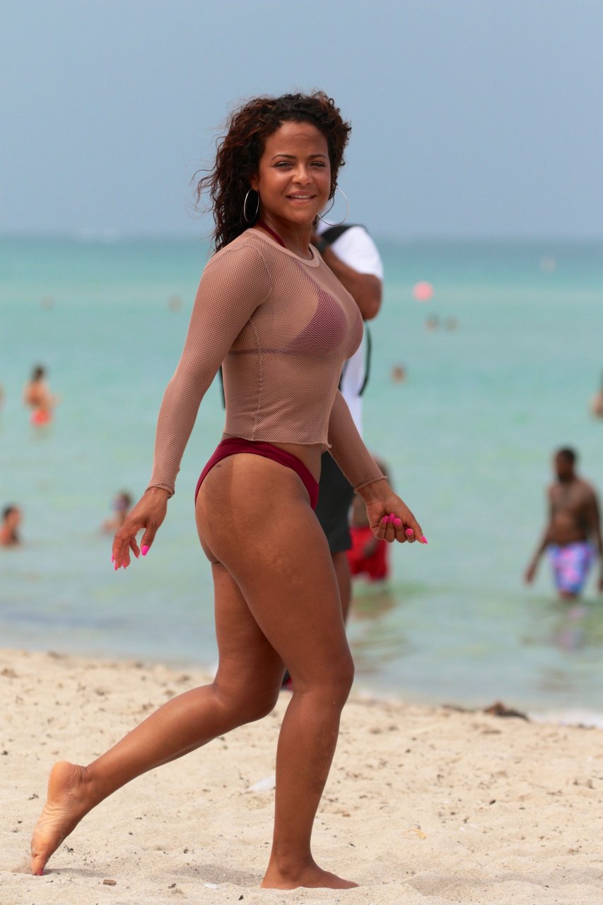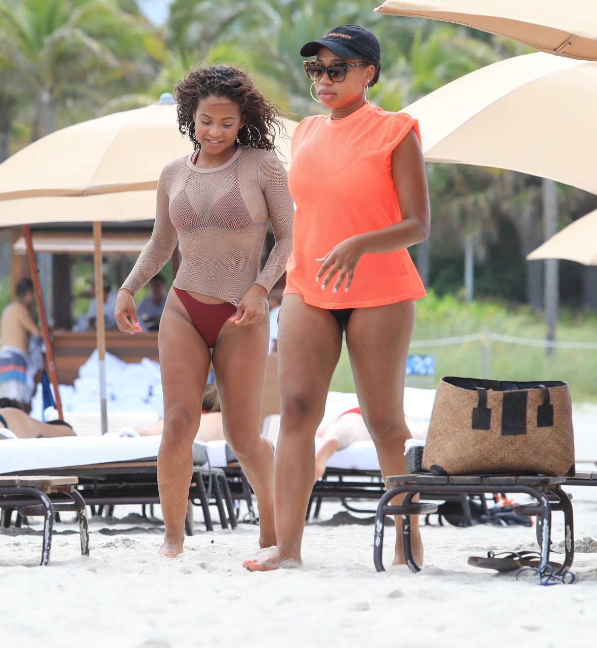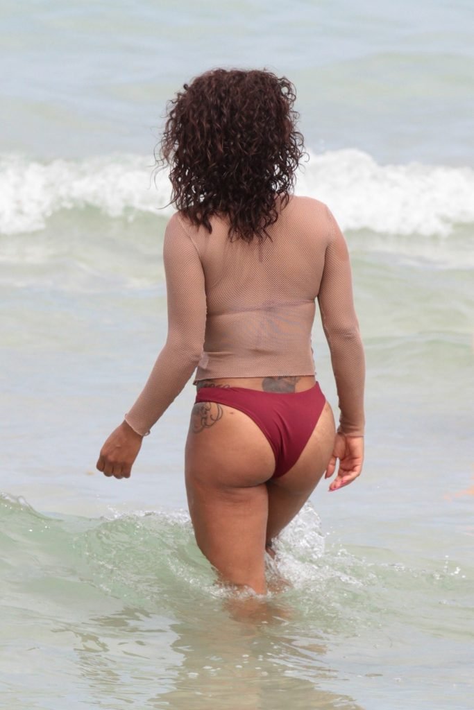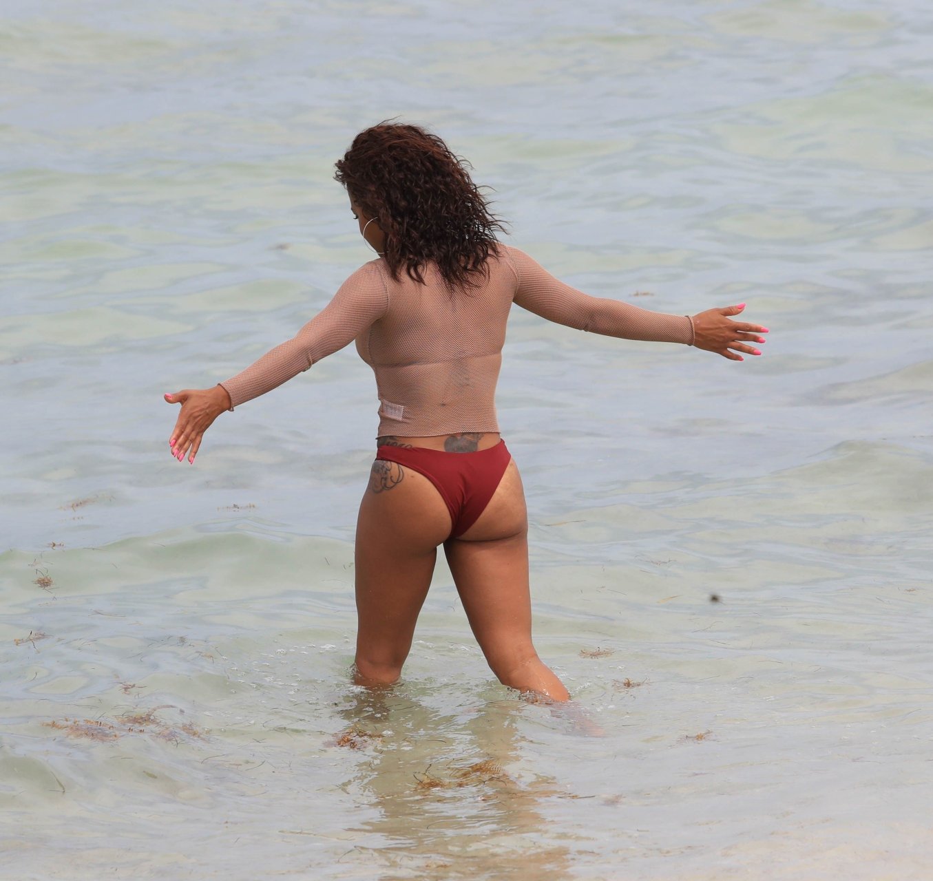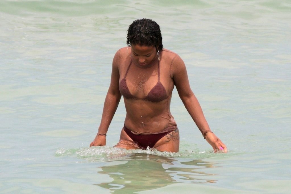 Cantora, compositora e atriz americana Christina Milian aproveita a praia com um biquíni marrom, 22/07/2017.
