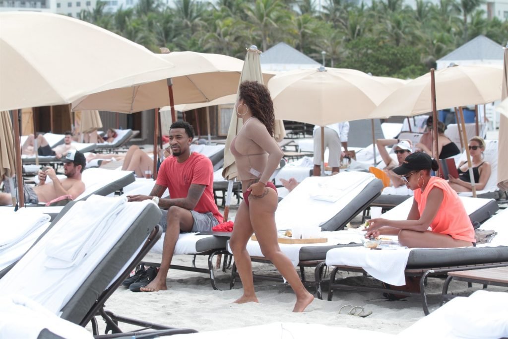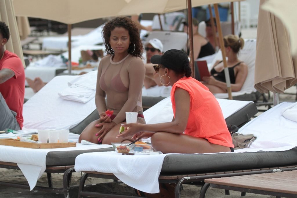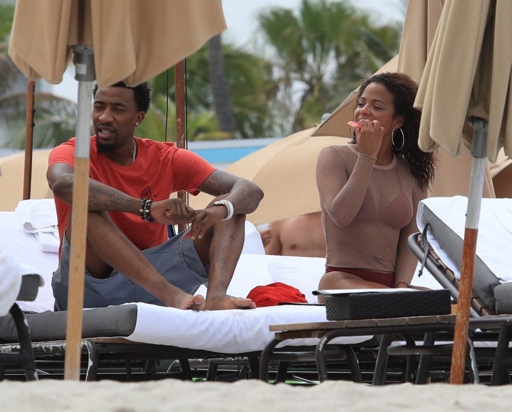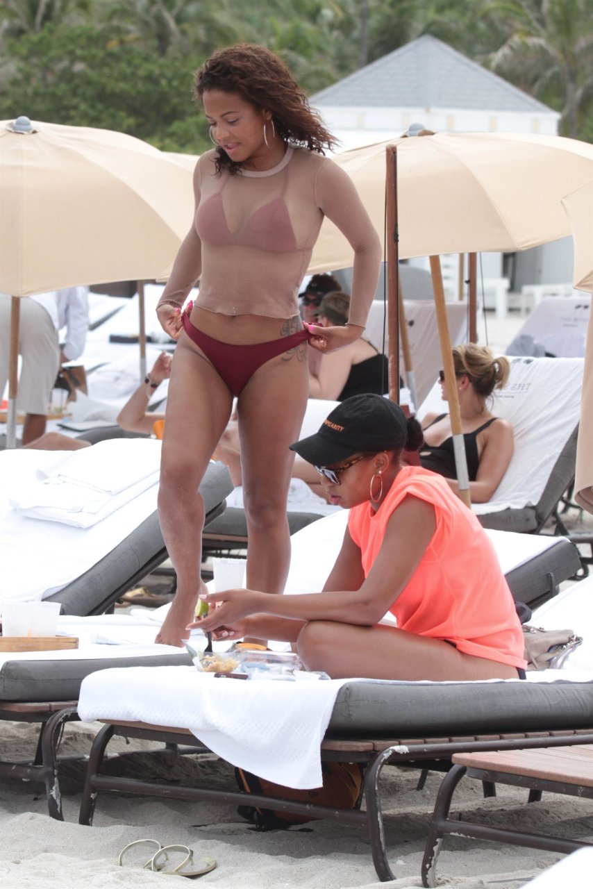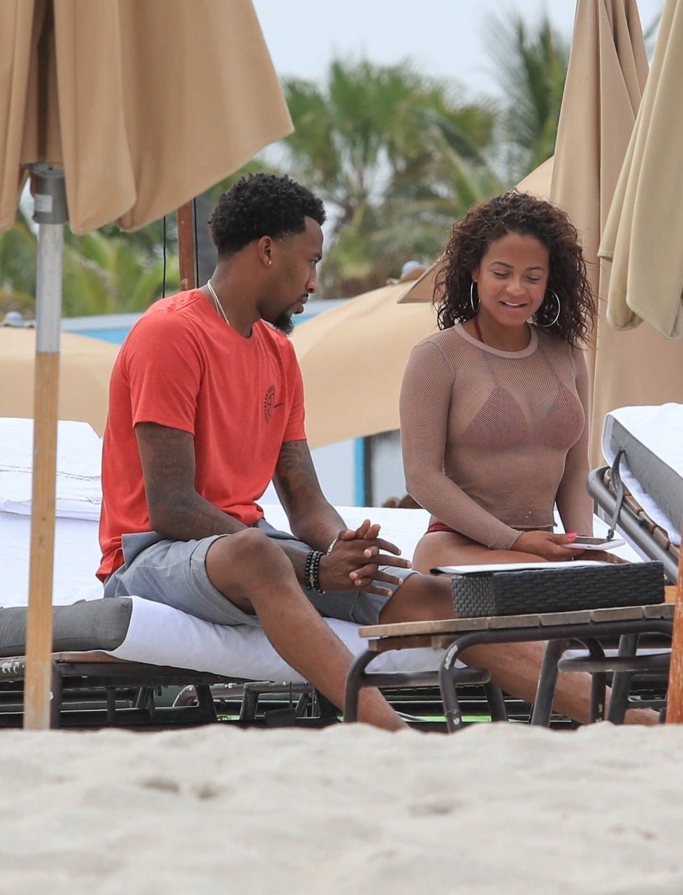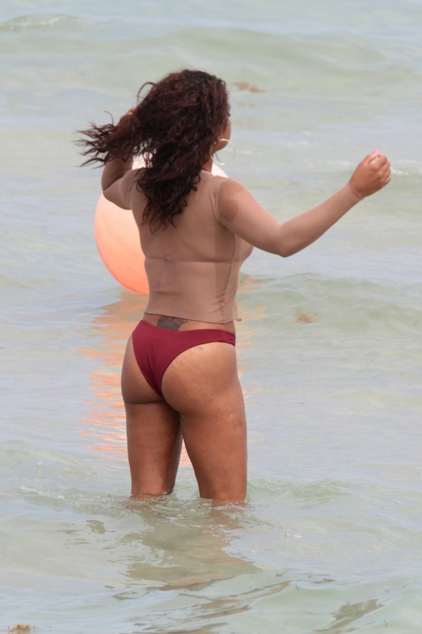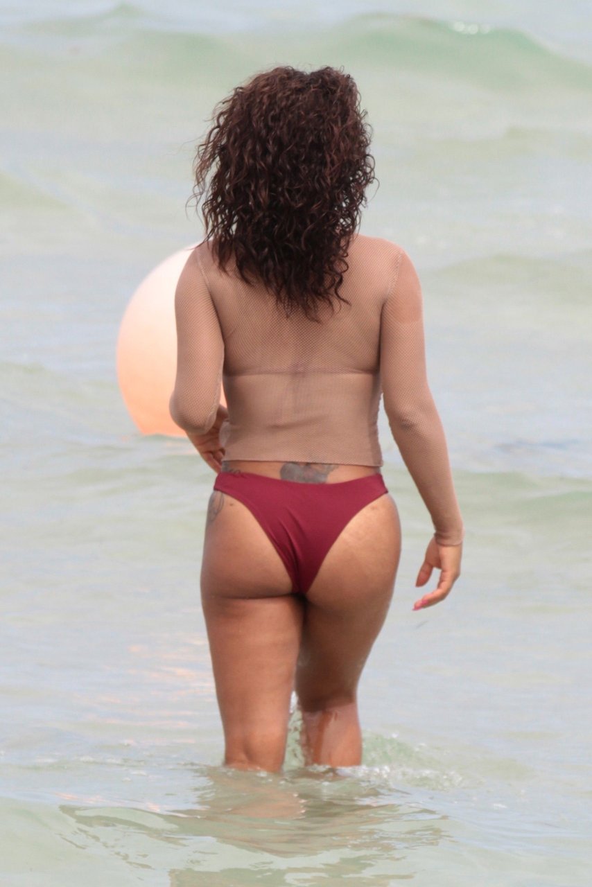 Cantora, compositora e atriz americana Christina Milian aproveita a praia com um biquíni marrom, 22/07/2017.