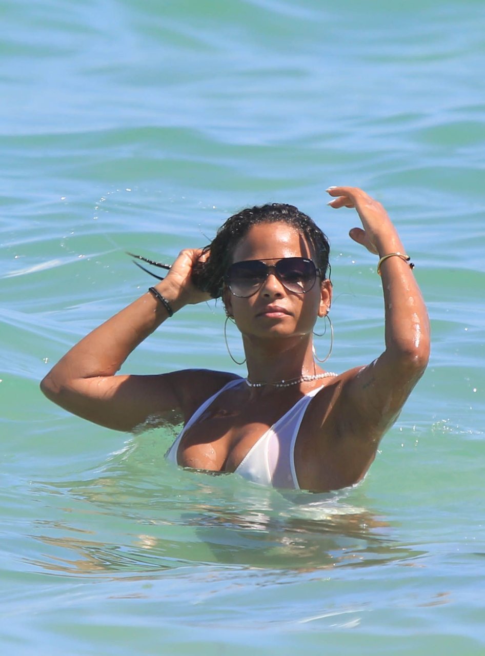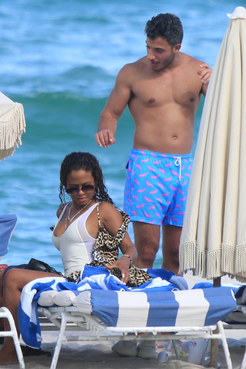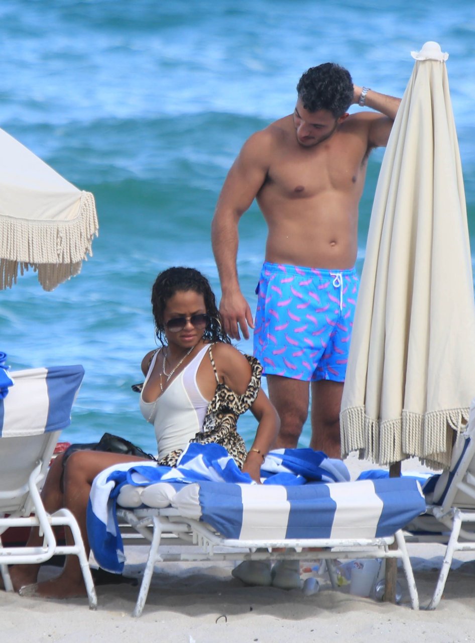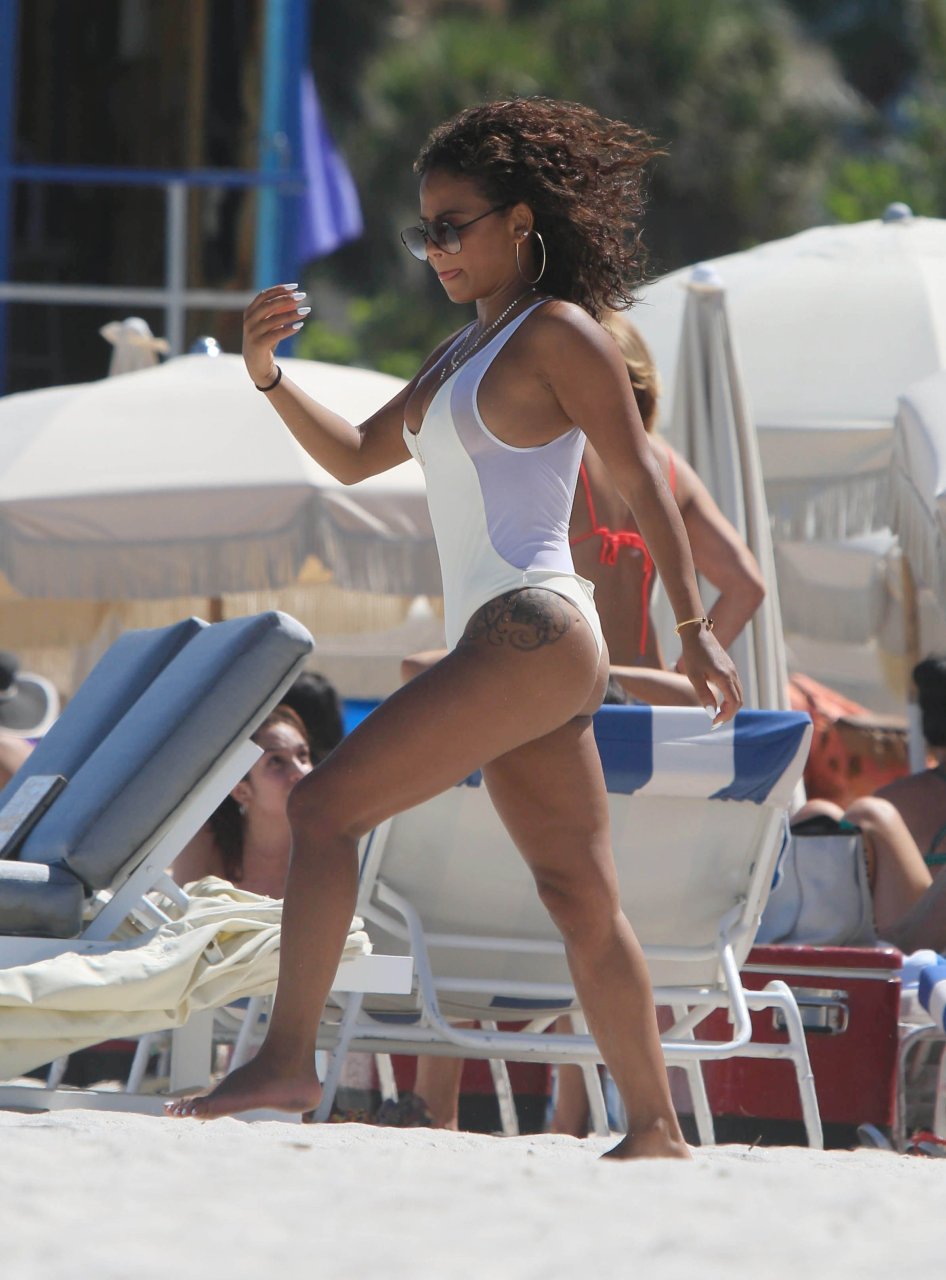 Christina Milian usa um maiô branco na praia em Miami, 18/08/2017. Christina Milian é uma cantora, compositora e atriz americana.