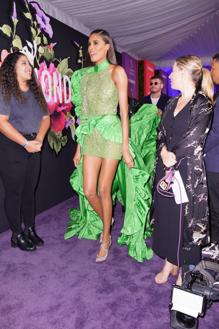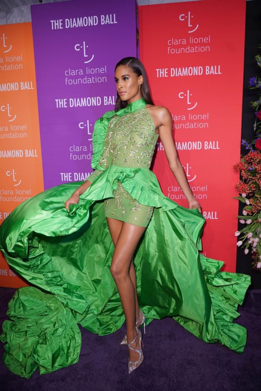 Model Cindy Bruna exibe suas pernas e seios sexy, vestindo um vestido verde enquanto participa do 5º Baile Anual do Diamante em benefício da Clara Lionel Foundation no Cipriani Wall Street em Nova York, 12/09/2019.