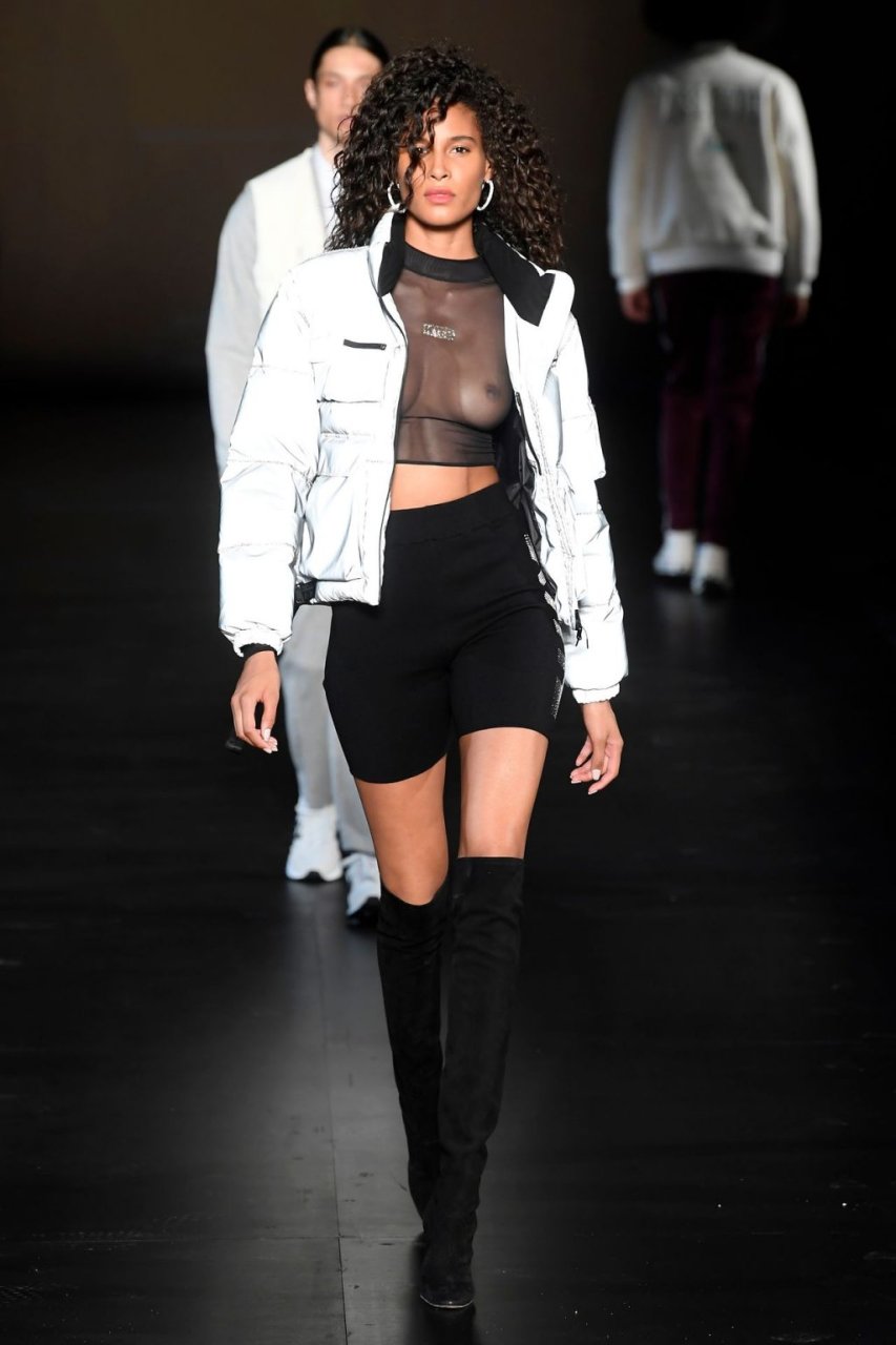 Model Cindy Bruna foi fotografada com uma blusa transparente sem sutiã na passarela do desfile Kith Primavera/Verão 2020 durante a New York Fashion Week, 05/09/2019.