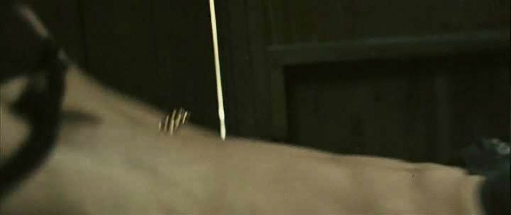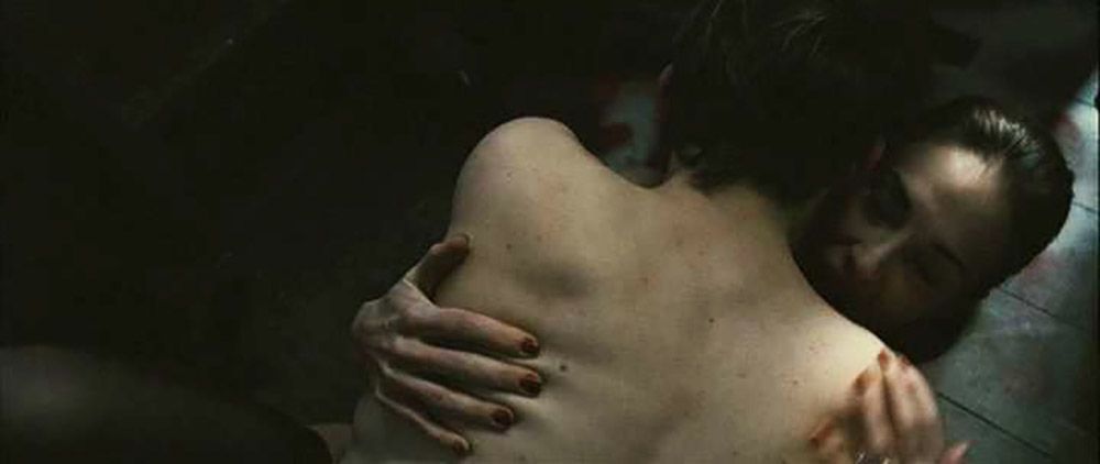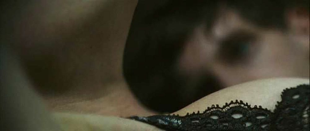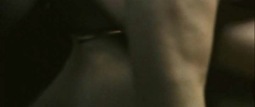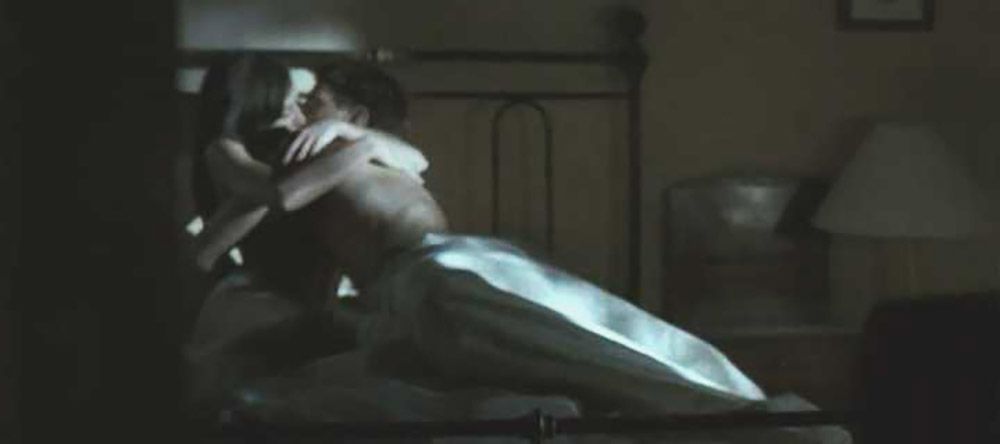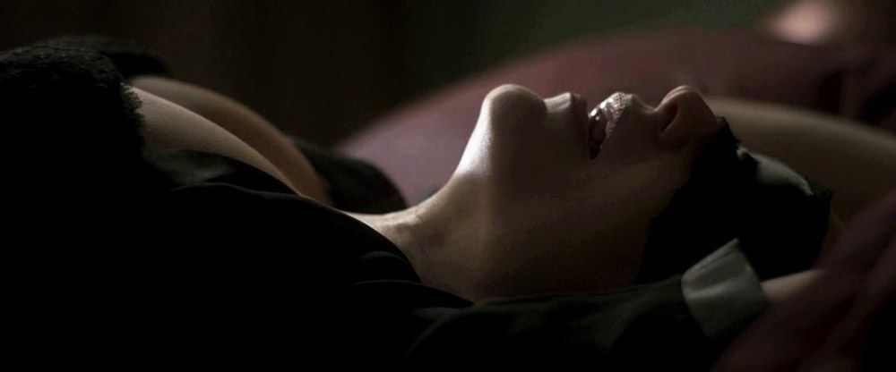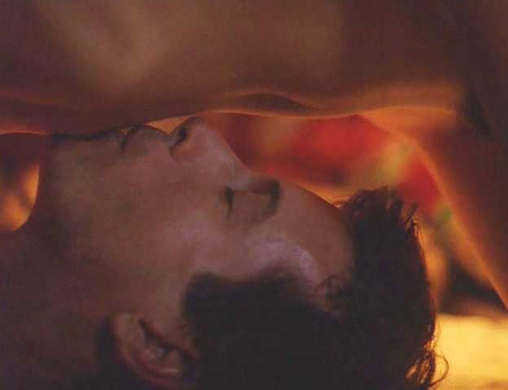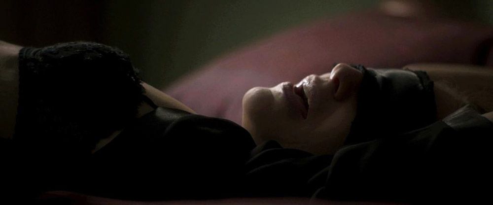 Claire Forlani is lying on her back on a bed wearing a bra and panties. She is blindfolded, and her wrists chained to the bed frame behind her head. After a bit, a guy enters the room and runs his hands over her body. He’s sliding Claire’s panties off before he flips her over and has sex with her from behind.