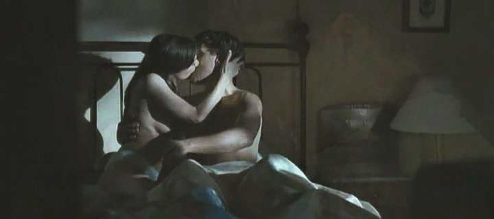 Hot Forlani is again making out with a guy in bed while topless in porn scene. Her arms partially covering her boobs but letting out a quick view of left nipple.