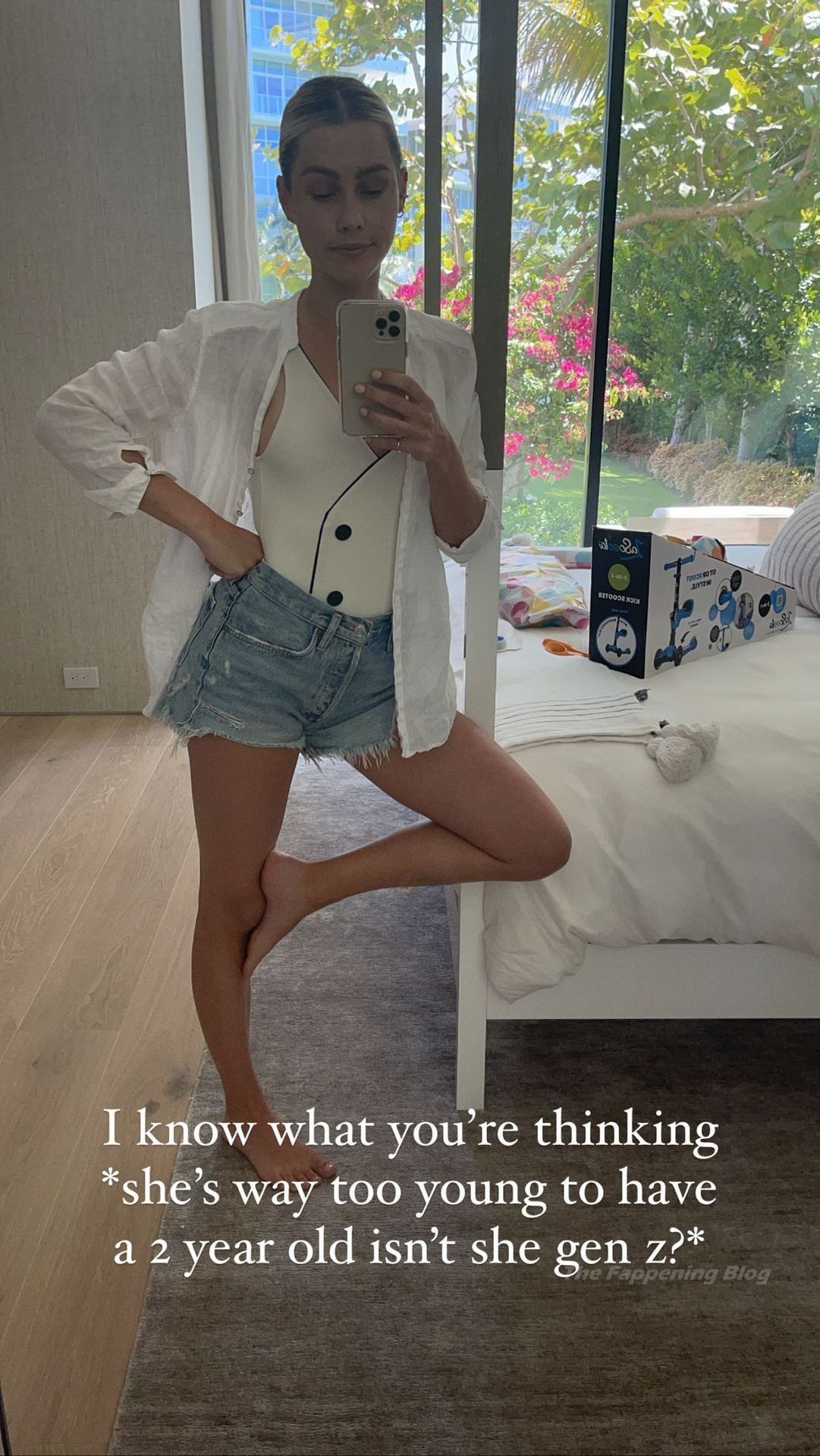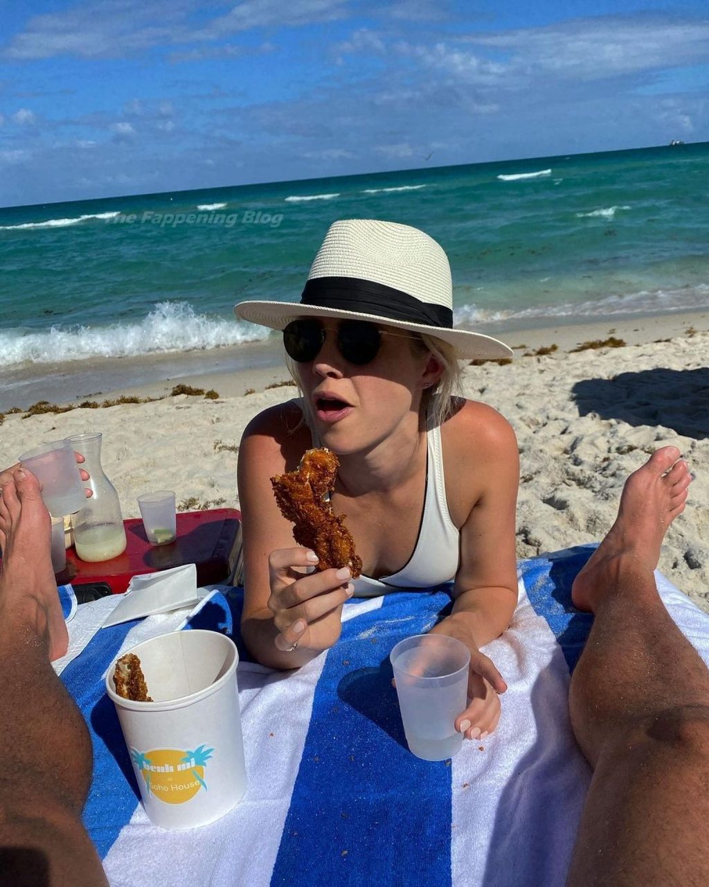 Atriz Claire Holt (32) usa um maiô branco de uma peça enquanto mergulha no oceano durante um dia de praia em Miami, 27/03/2021.