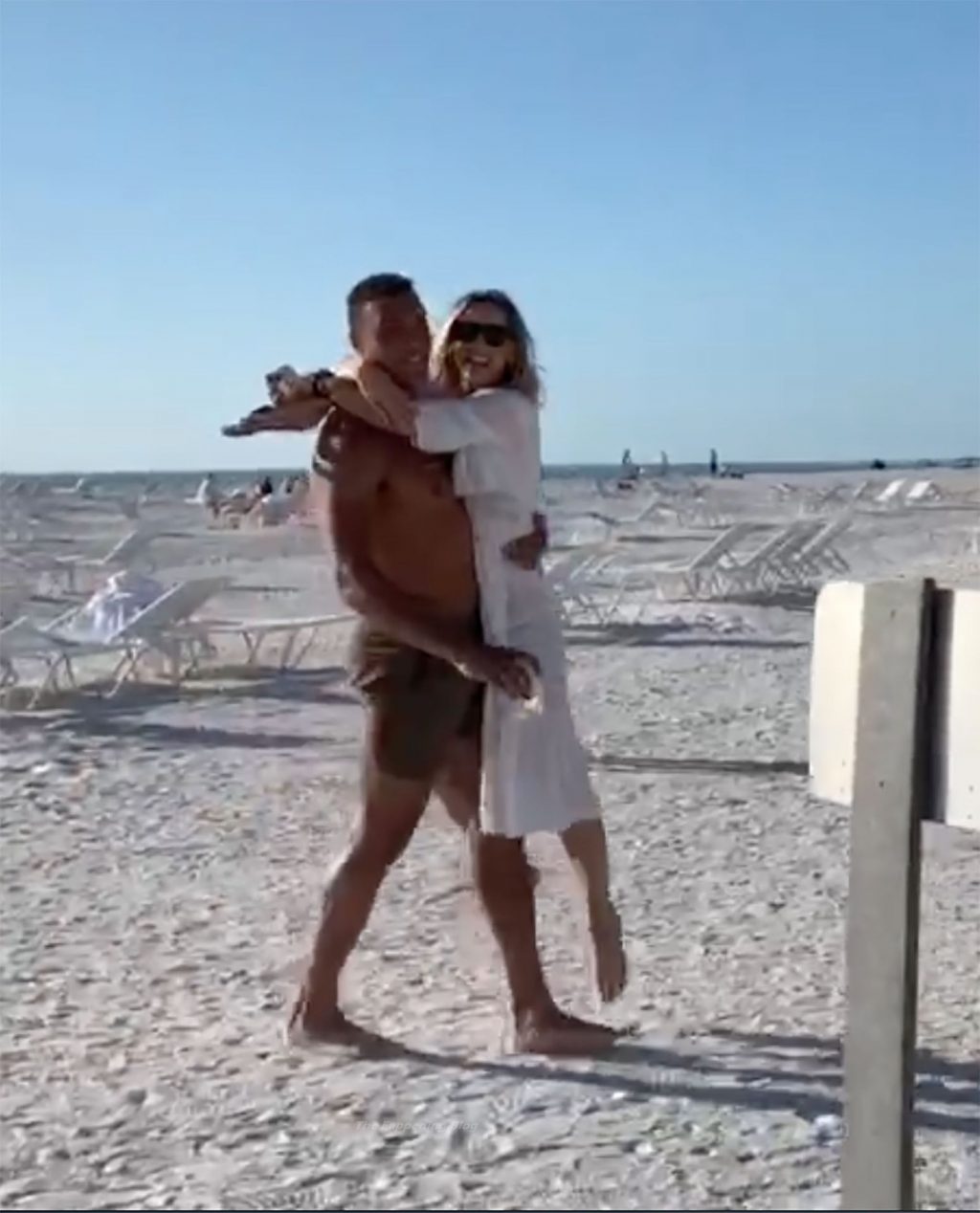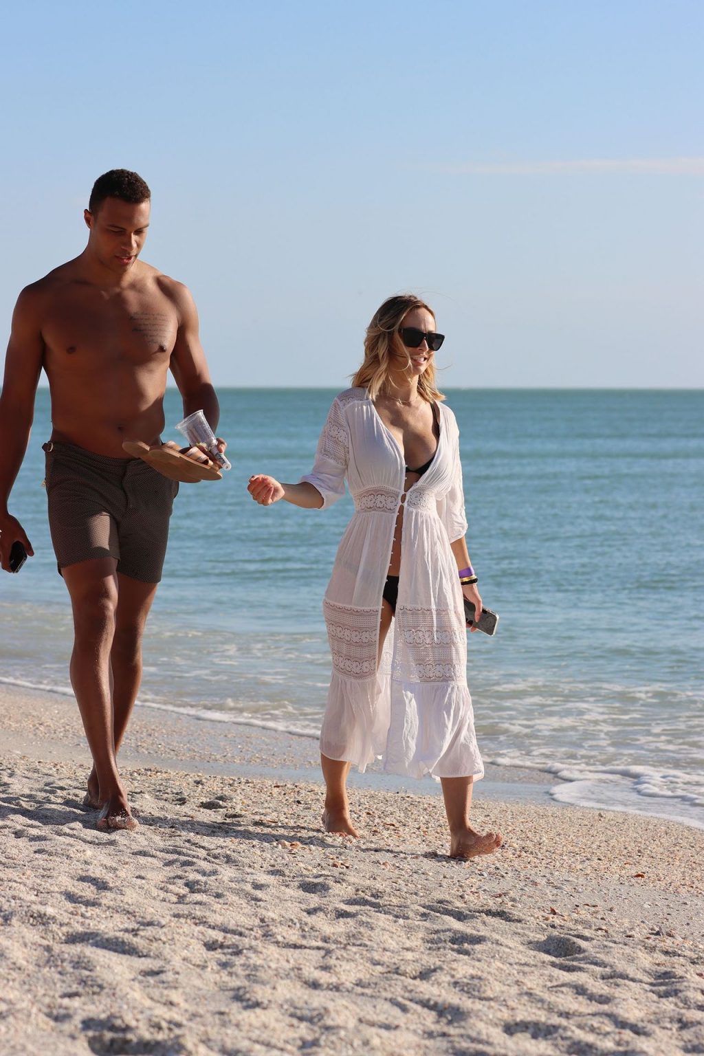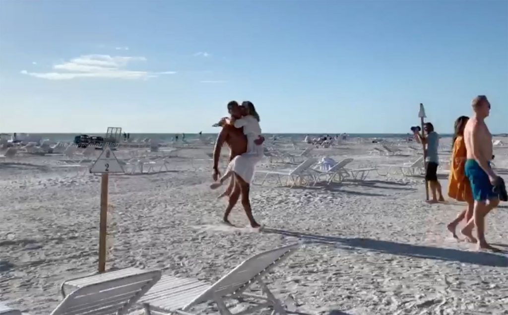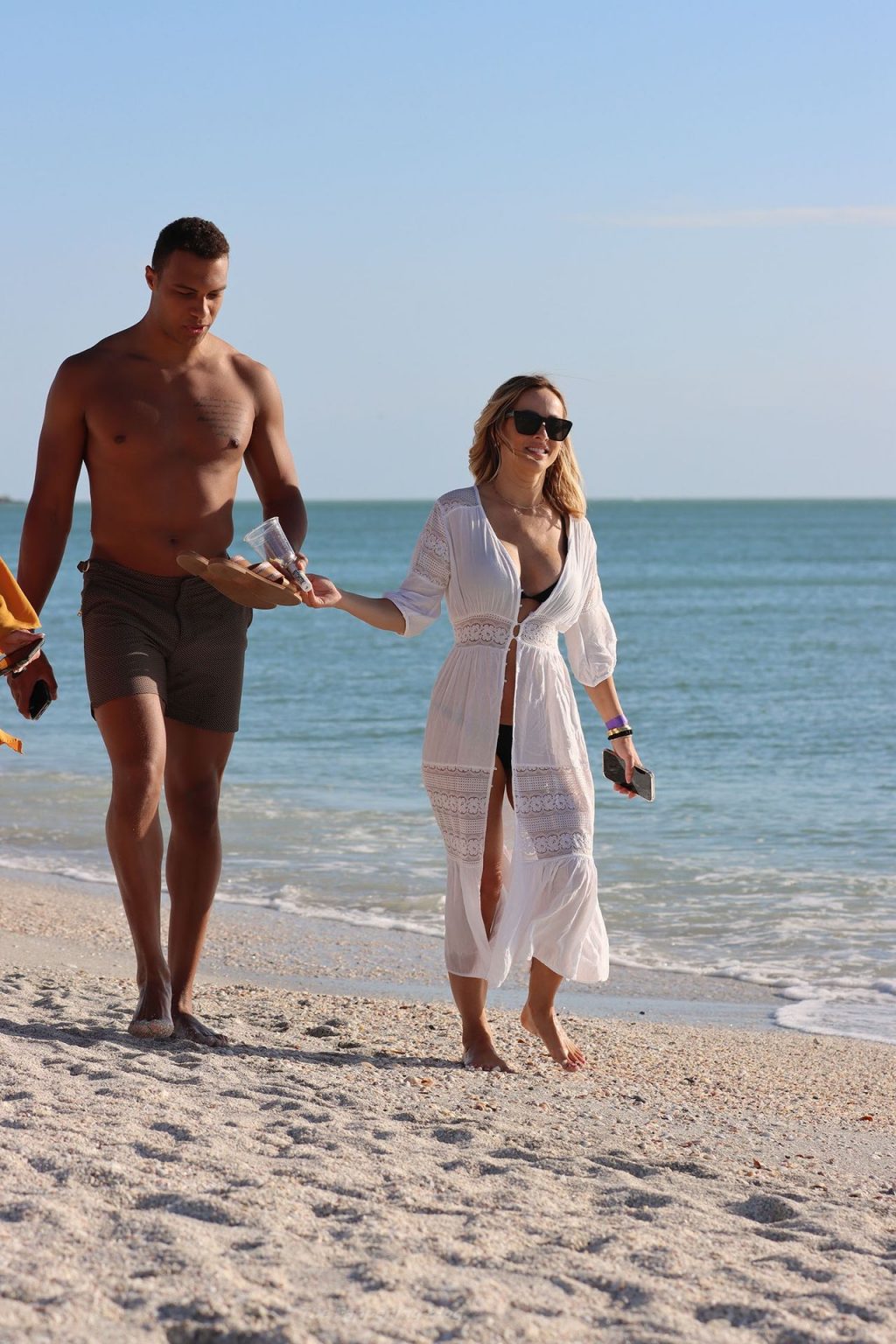 Os pombinhos relaxaram com amigos em Nokomis durante o fim de semana, aproveitando o sol descalços e curtindo coquetéis. De mãos dadas, pareciam encantados e compartilharam um beijo enquanto seus amigos tiravam fotos ao lado do idílico oceano.