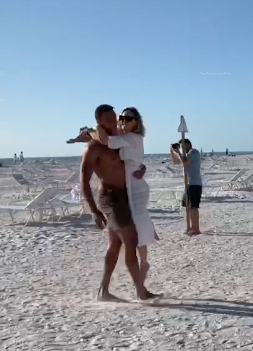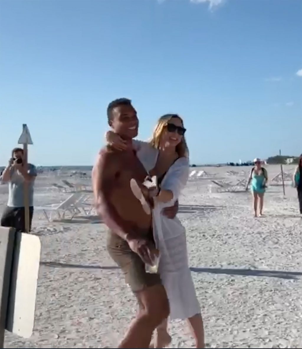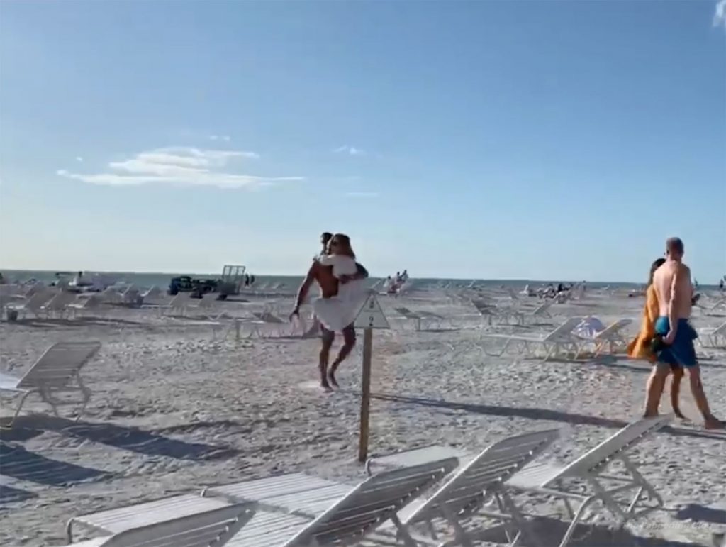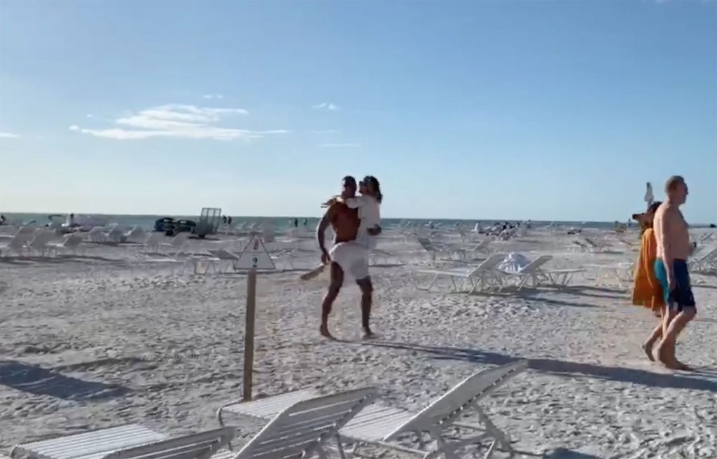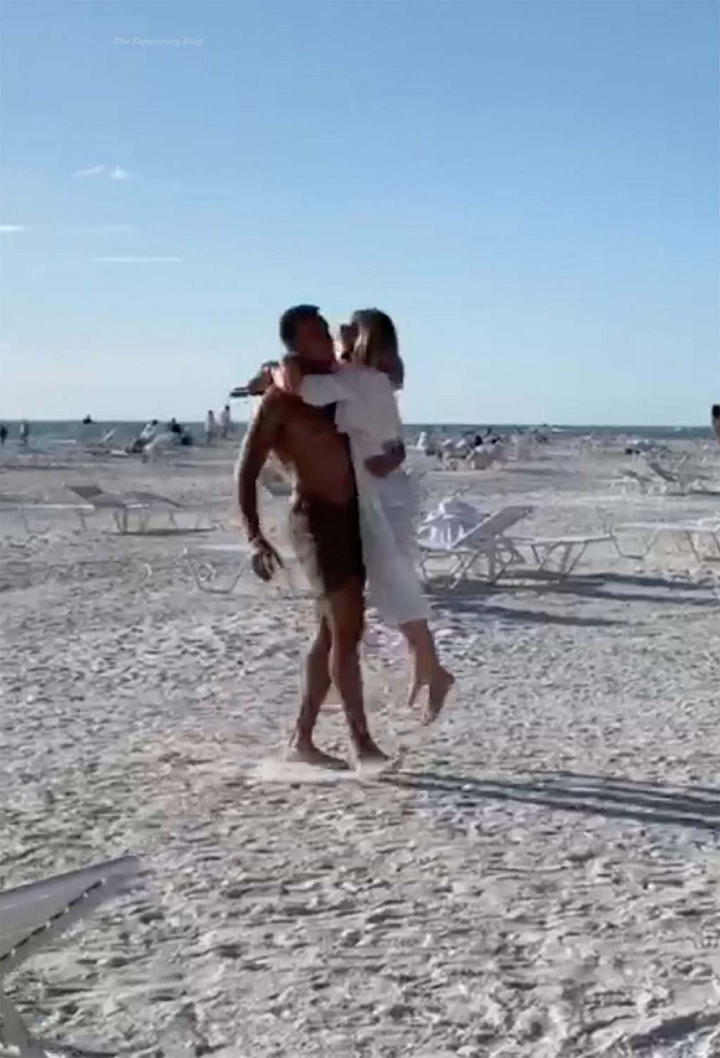 Os pombinhos relaxaram com amigos em Nokomis durante o fim de semana, aproveitando o sol descalços e curtindo coquetéis. De mãos dadas, pareciam encantados e compartilharam um beijo enquanto seus amigos tiravam fotos ao lado do idílico oceano.