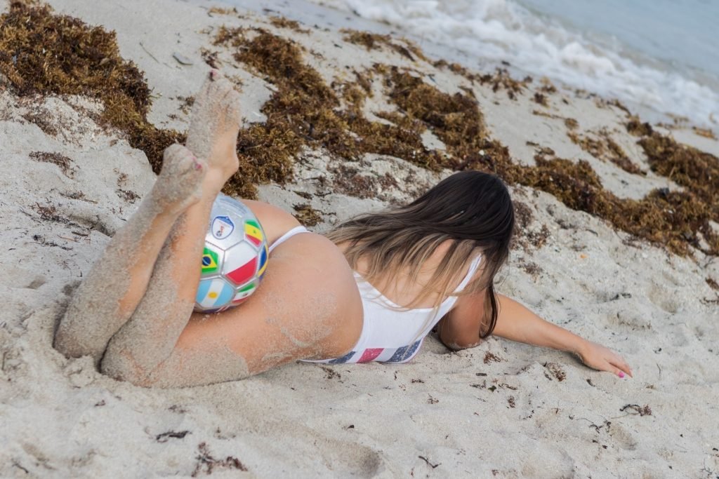 Modelo italiana de maiô, árbitra e estrela de reality show Claudia Romani quer que saibamos que ela está torcendo pela Inglaterra na Copa do Mundo de 2018, 21/06/2018. Ela estava em South Beach com um novo maiô sexy de uma peça.