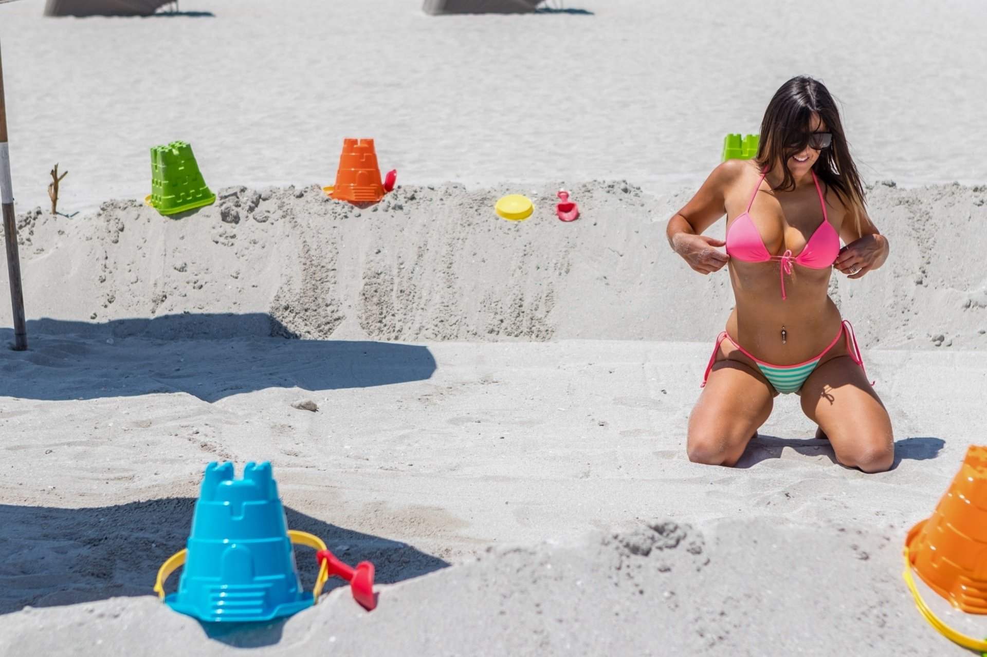A personalidade da televisão italiana e modelo Claudia Romani (36) aproveita um dia de sol em South Beach, 14/08/2018. Claudia usa um biquíni de corda neon, enquanto bronzeia em uma espreguiçadeira e constrói castelos de areia ao sol.