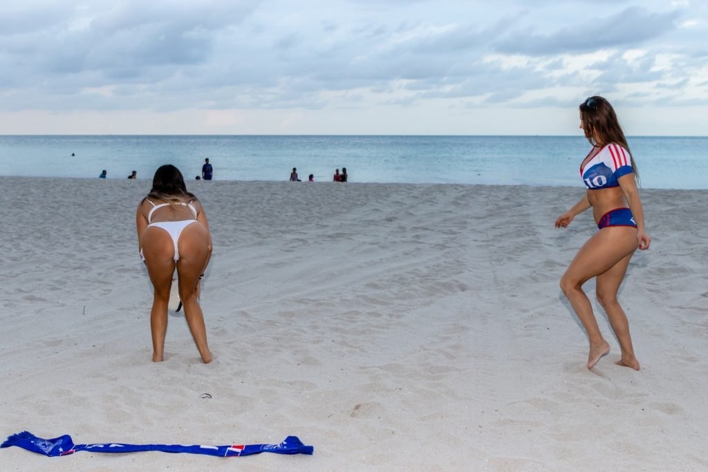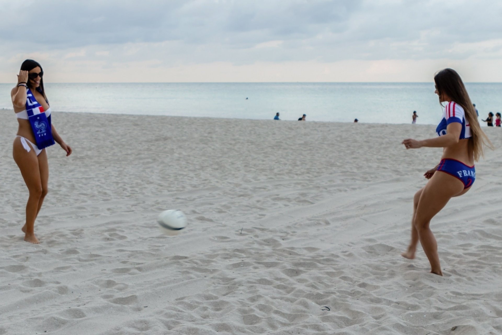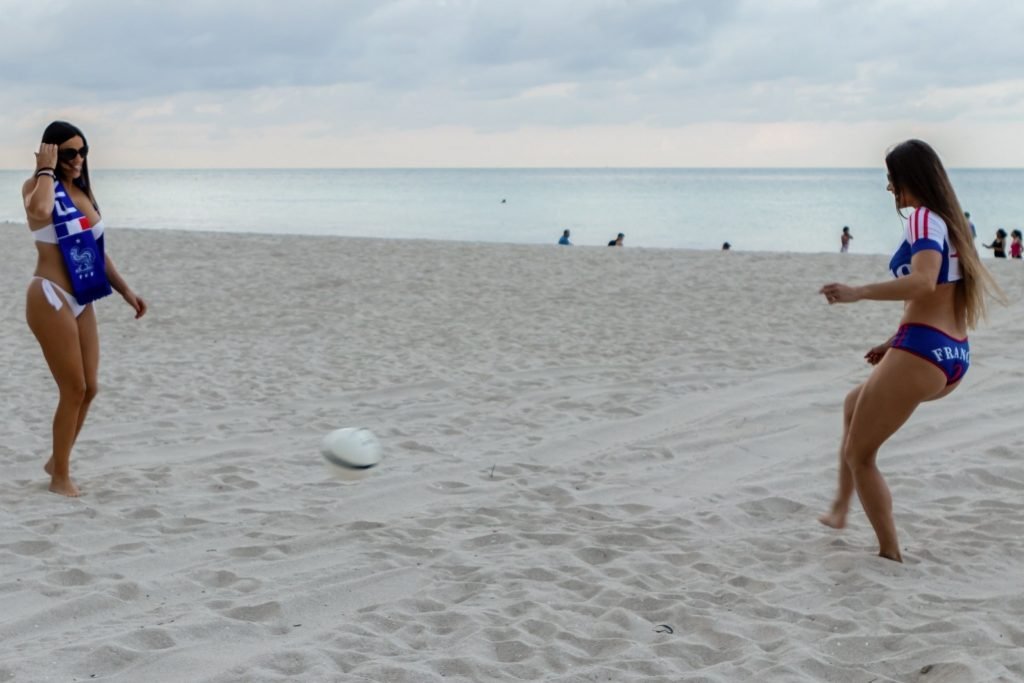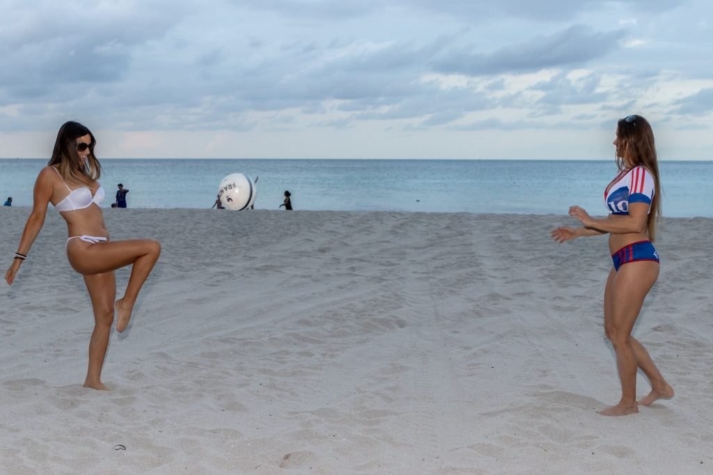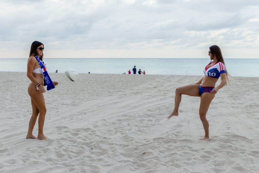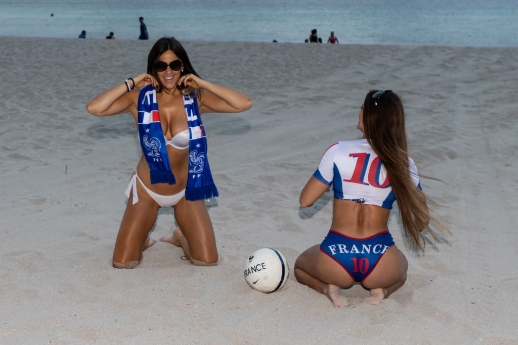 Models Claudia Romani and Anais Zanotti mostram amor pela França antes do grande jogo. Treinadora física, dublê, paraquedista e modelo, Anais é francesa, enquanto sua amiga Claudia participou do reality show francês “Secret Story.” Ambas estavam na praia brincando com uma bola e exibindo suas curvas conquistadas com esforço, 07/05/2018.
