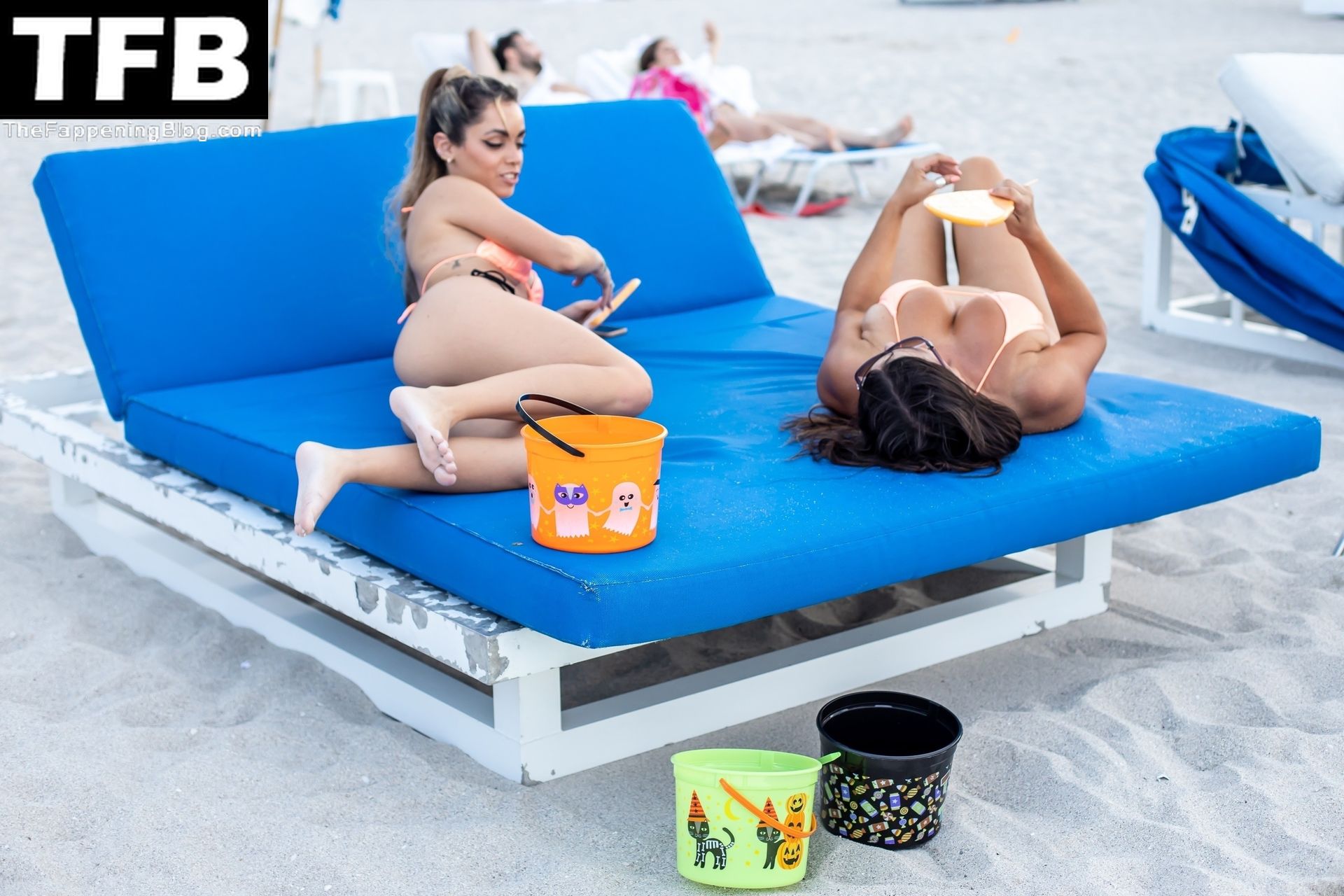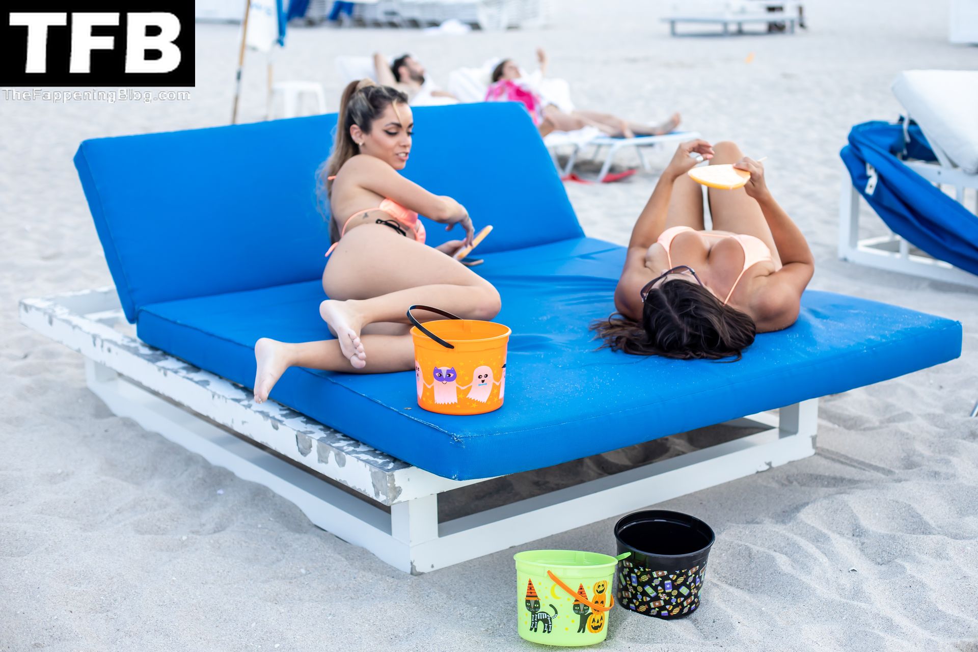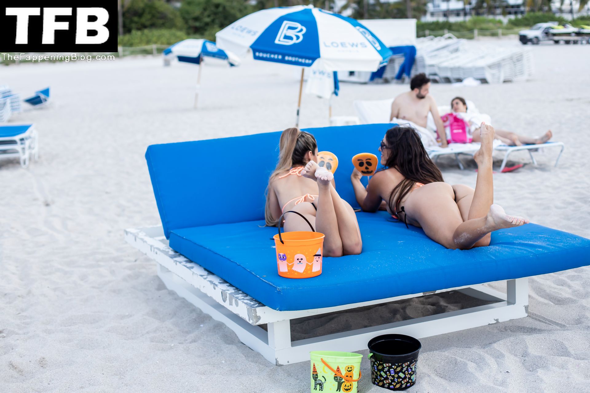A modelo ítalo-americana Claudia Romani e a influenciadora argentina Cloe Greco foram vistas juntas novamente em South Beach, 28/10/2021. Mais sexy e assustadoras do que nunca, com biquínis combinando de tanga de abóbora ao redor de alguns adereços de Halloween.