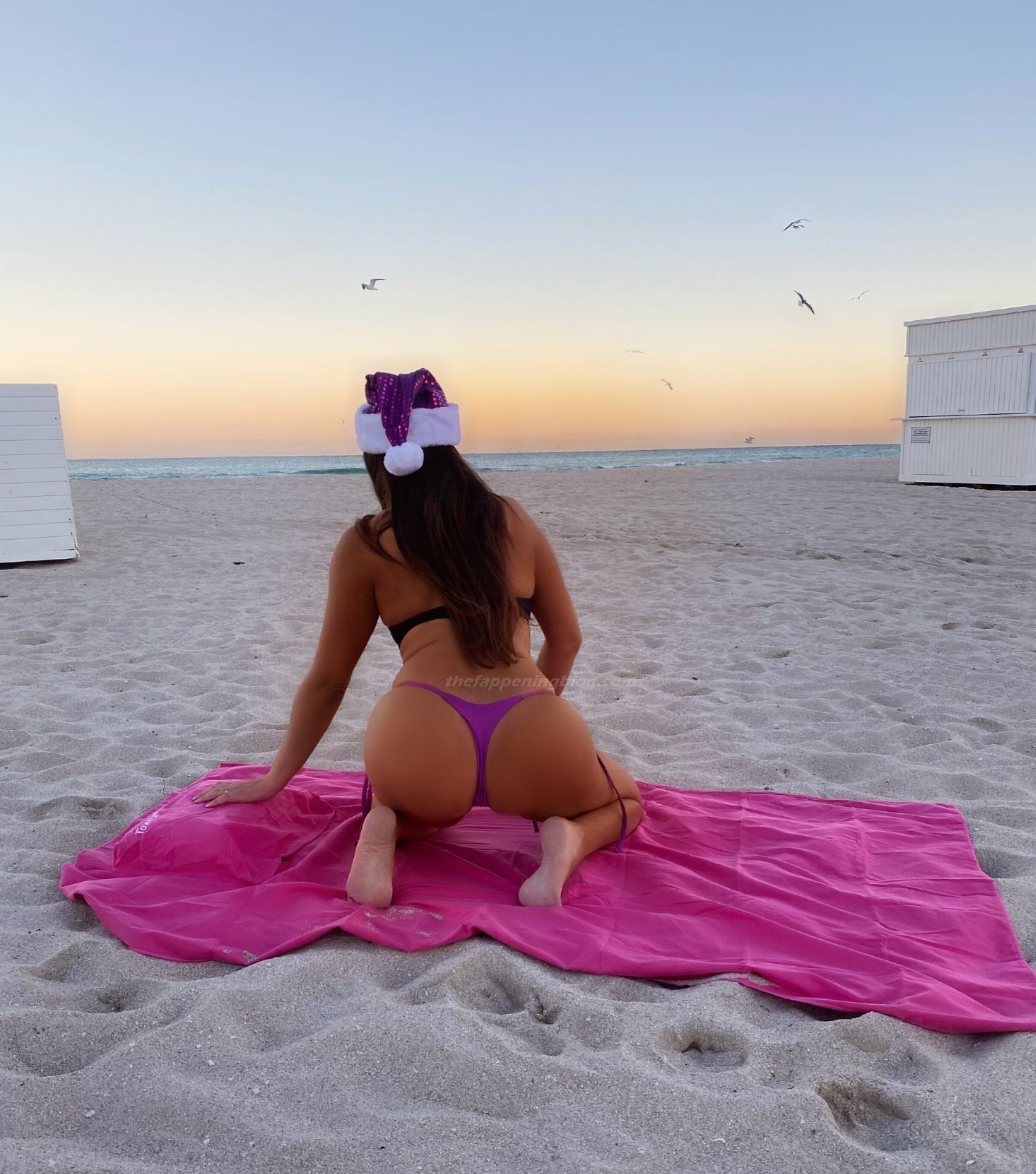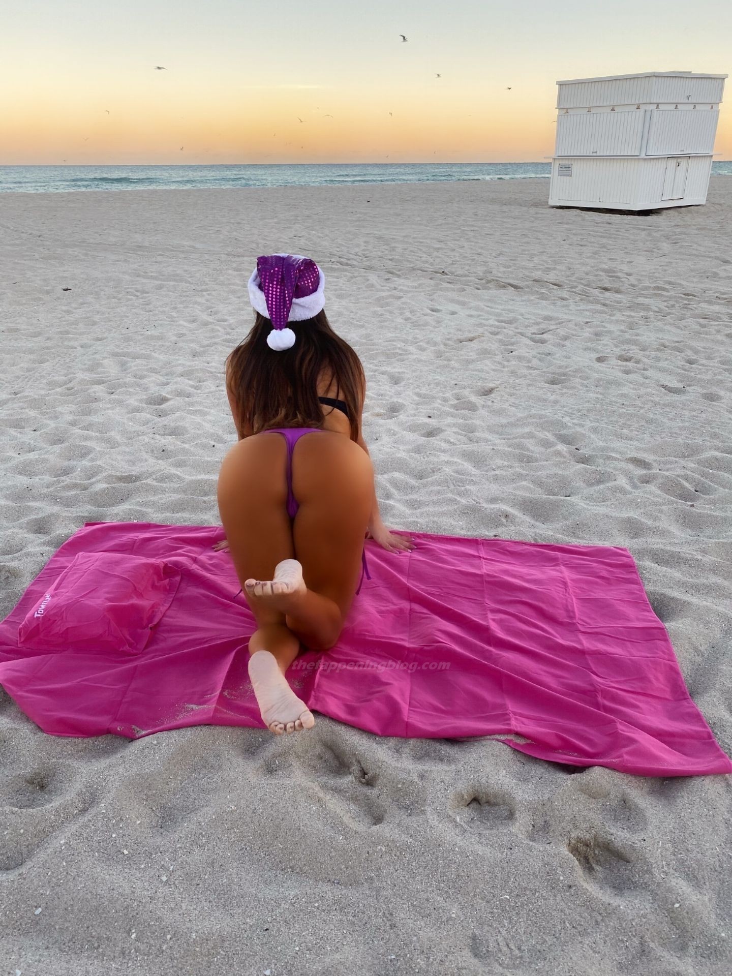 A modelo escolheu um estilo único de Mamãe Noel lilás e parecia sexy enquanto aproveitava um pôr do sol tranquilo na praia!