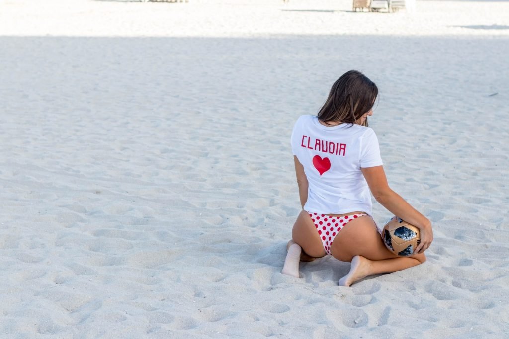 Claudia Romani em South Beach pouco antes da final da Copa do Mundo usando uma camiseta personalizada Rússia 2018 e calcinha de biquíni com bolinhas, 14/07/2018. A modelo de 36 anos e personalidade de reality show estava sorridente e mostrando suas curvas, se divertindo.