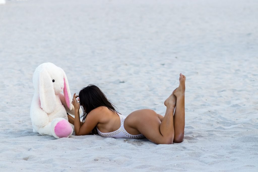 Modelo ítalo-americana e personalidade de reality show celebrou a Páscoa do seu jeito, com um enorme coelho e um biquíni fio dental minúsculo – Miami, FL, 21/04/2019. Ela estava mostrando bastante bumbum e um pouco de lateral do seio.