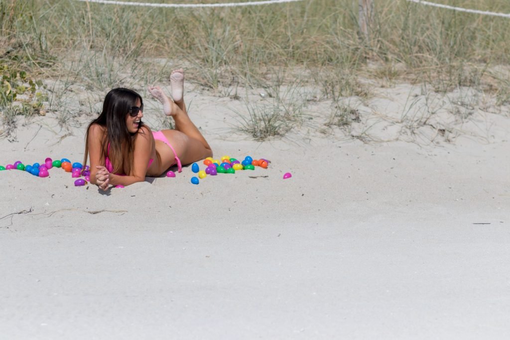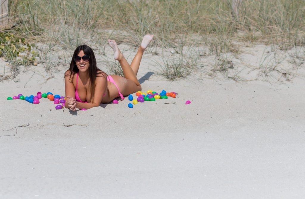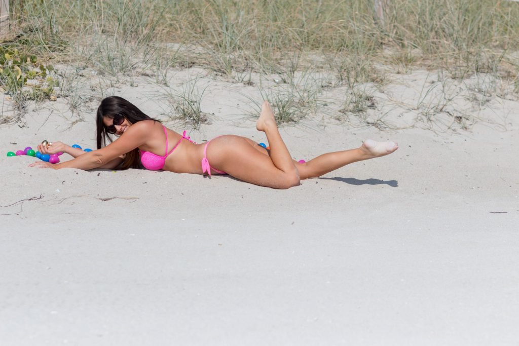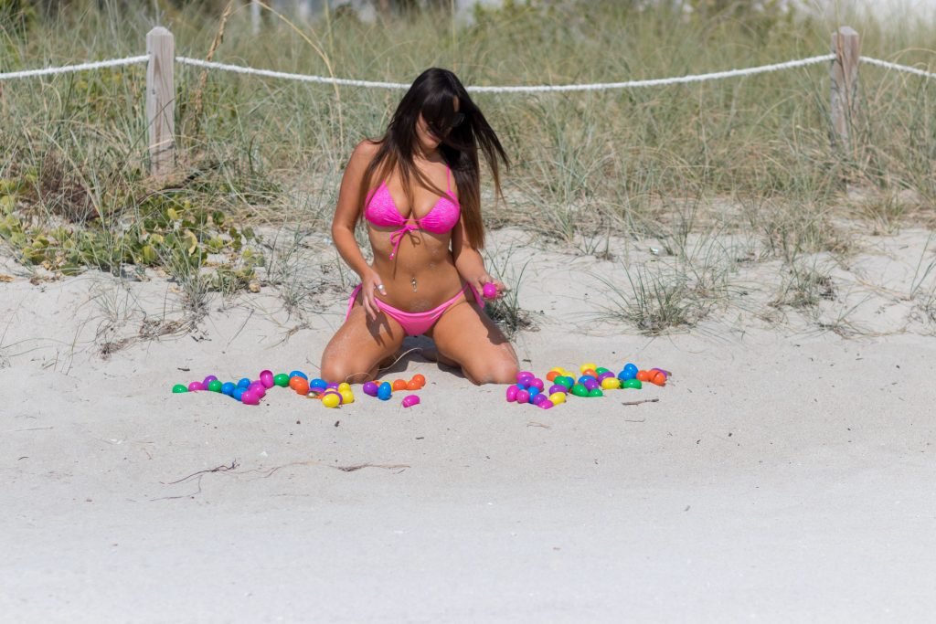 Reality television star, model and soccer referee Claudia Romani, 35, celebrando a Páscoa em um biquíni fio dental rosa sexy na South Beach com alguns ovos de Páscoa realmente brilhantes, 29/03/2018. Ela estava sorrindo enquanto posava.