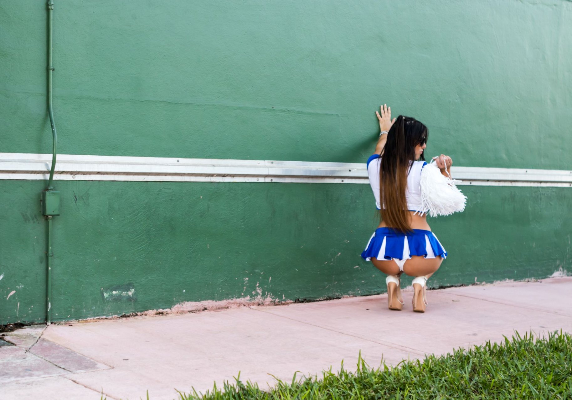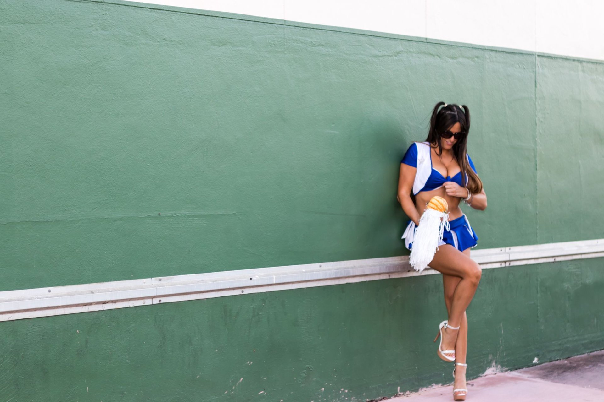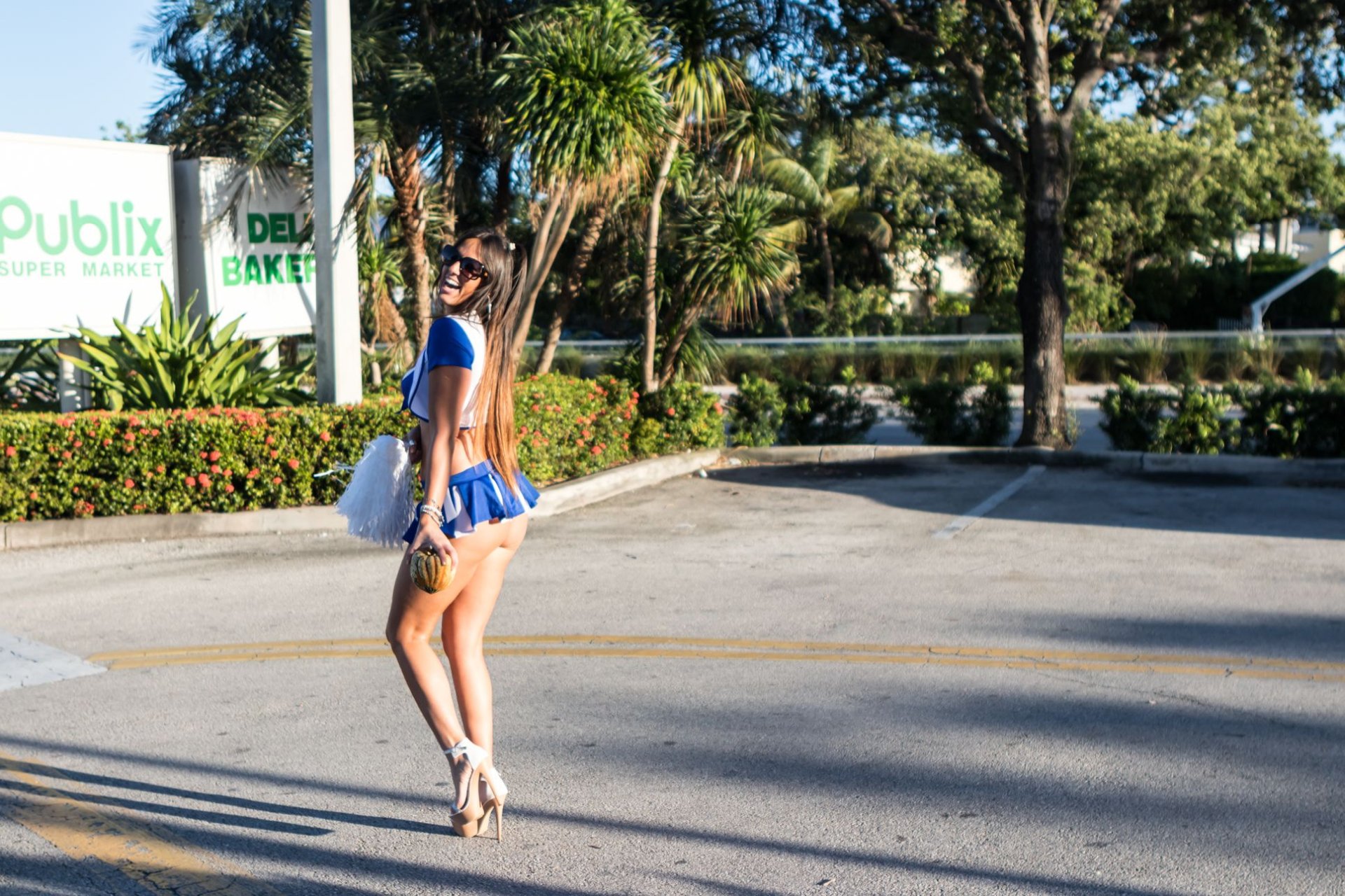 Modelo italiana e estrela de reality TV Claudia Romani (35) no Publix em South Beach atraindo olhares e roubando corações com uma fantasia de Halloween de líder de torcida super pequena, 29/10/2017. Saia curta que não esconde realmente a calcinha branca por baixo.