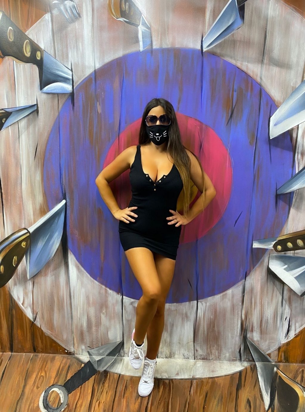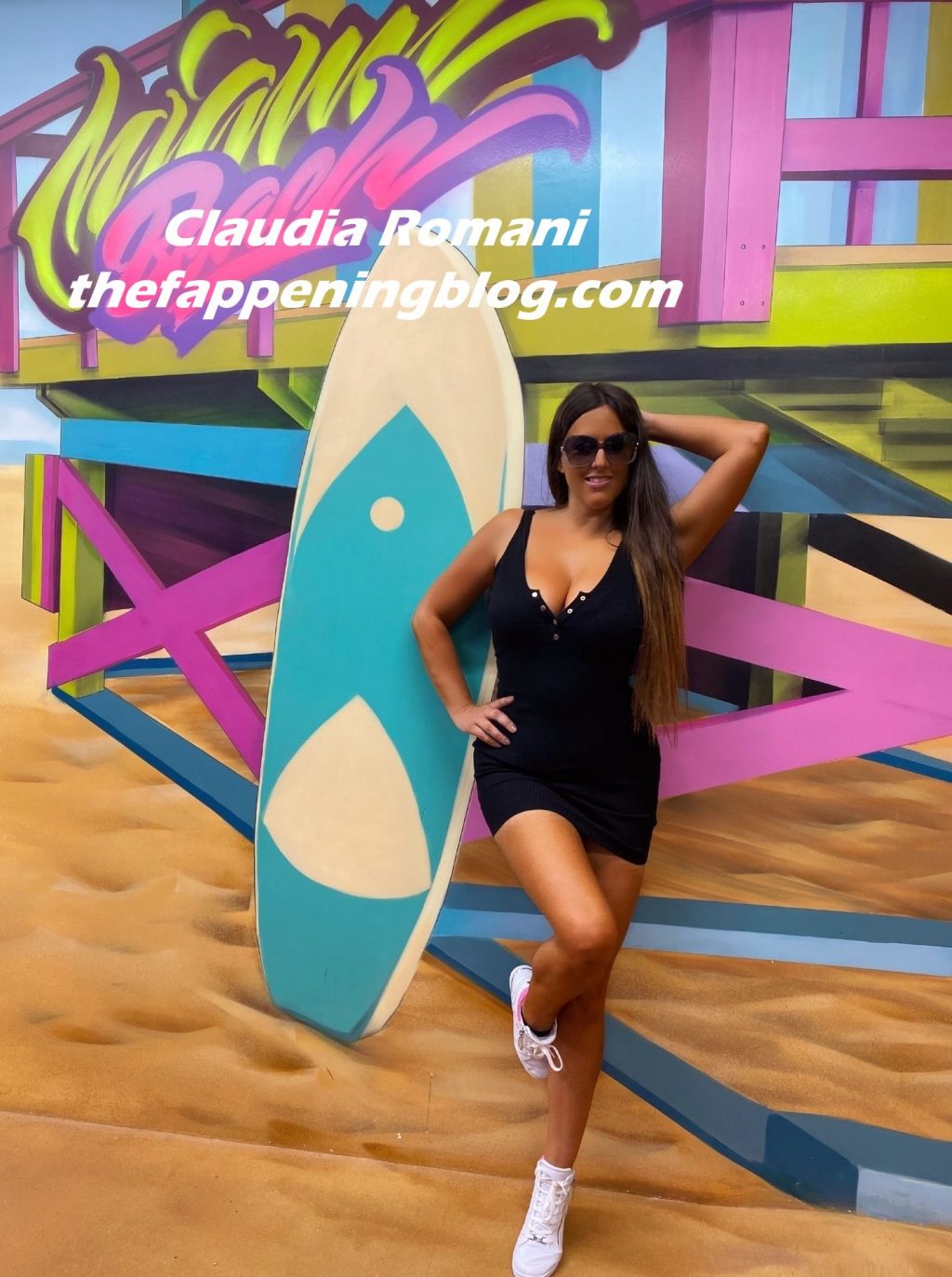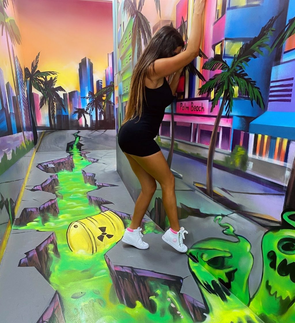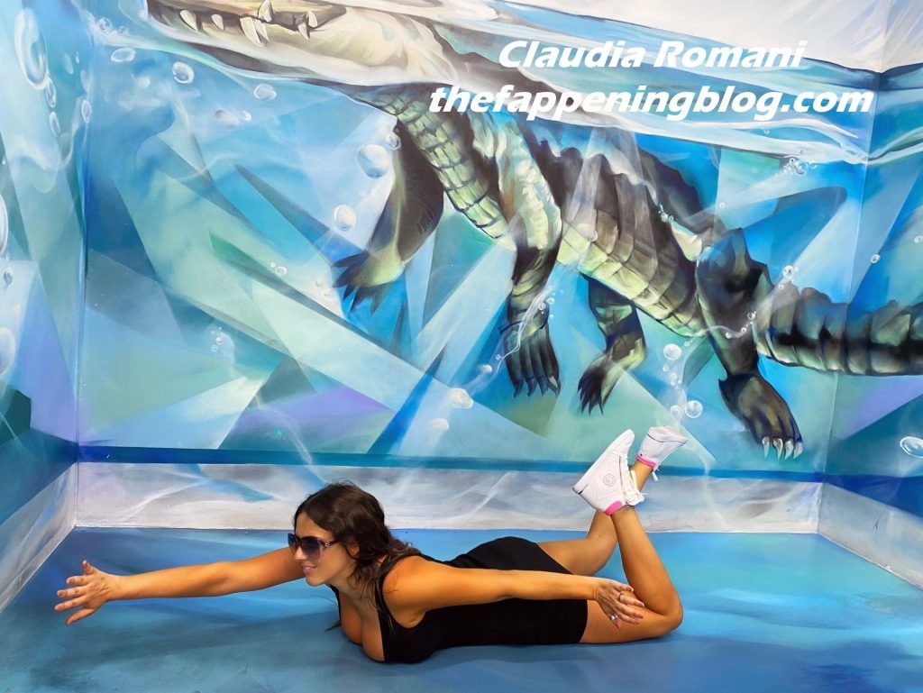 A personalidade de TV ítalo-americana Claudia Romani foi vista se divertindo muito com seu namorado durante uma visita ao Museu das Ilusões na Lincoln Road – Miami Beach, 12/08/2020. A modelo usava um vestidinho preto e tênis brancos e posou para fotos divertidas.