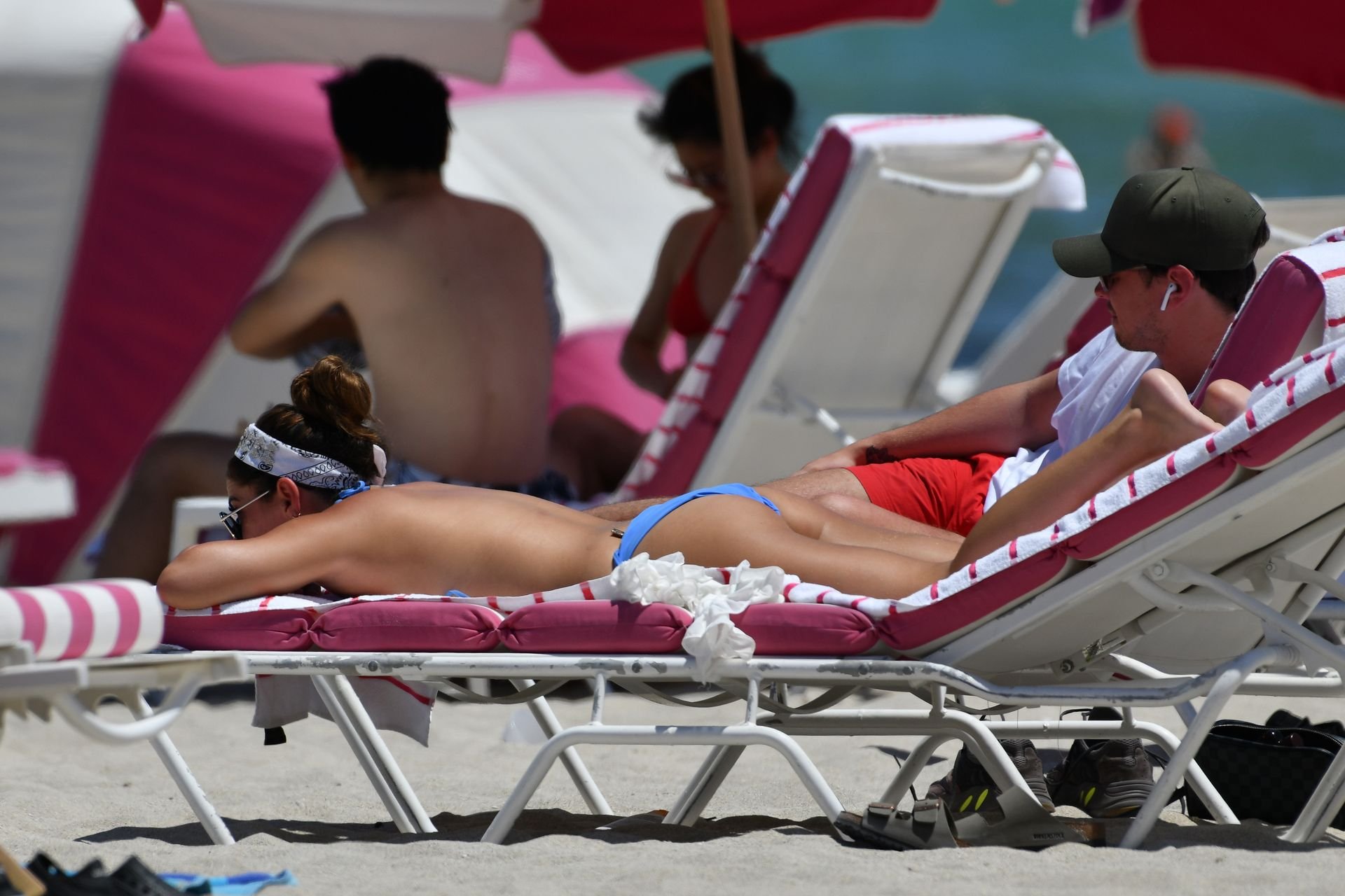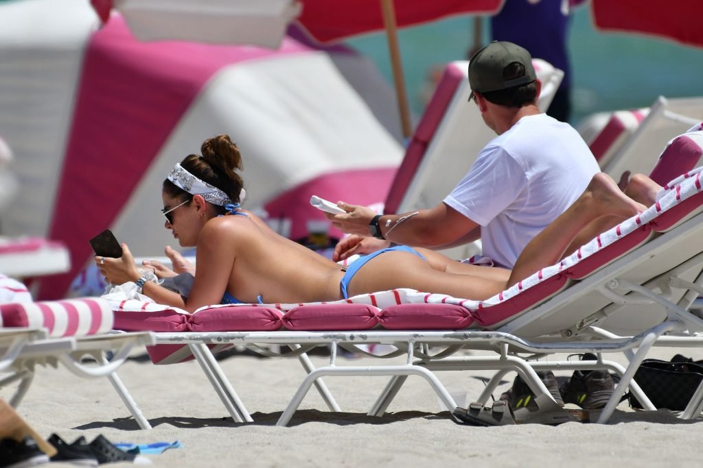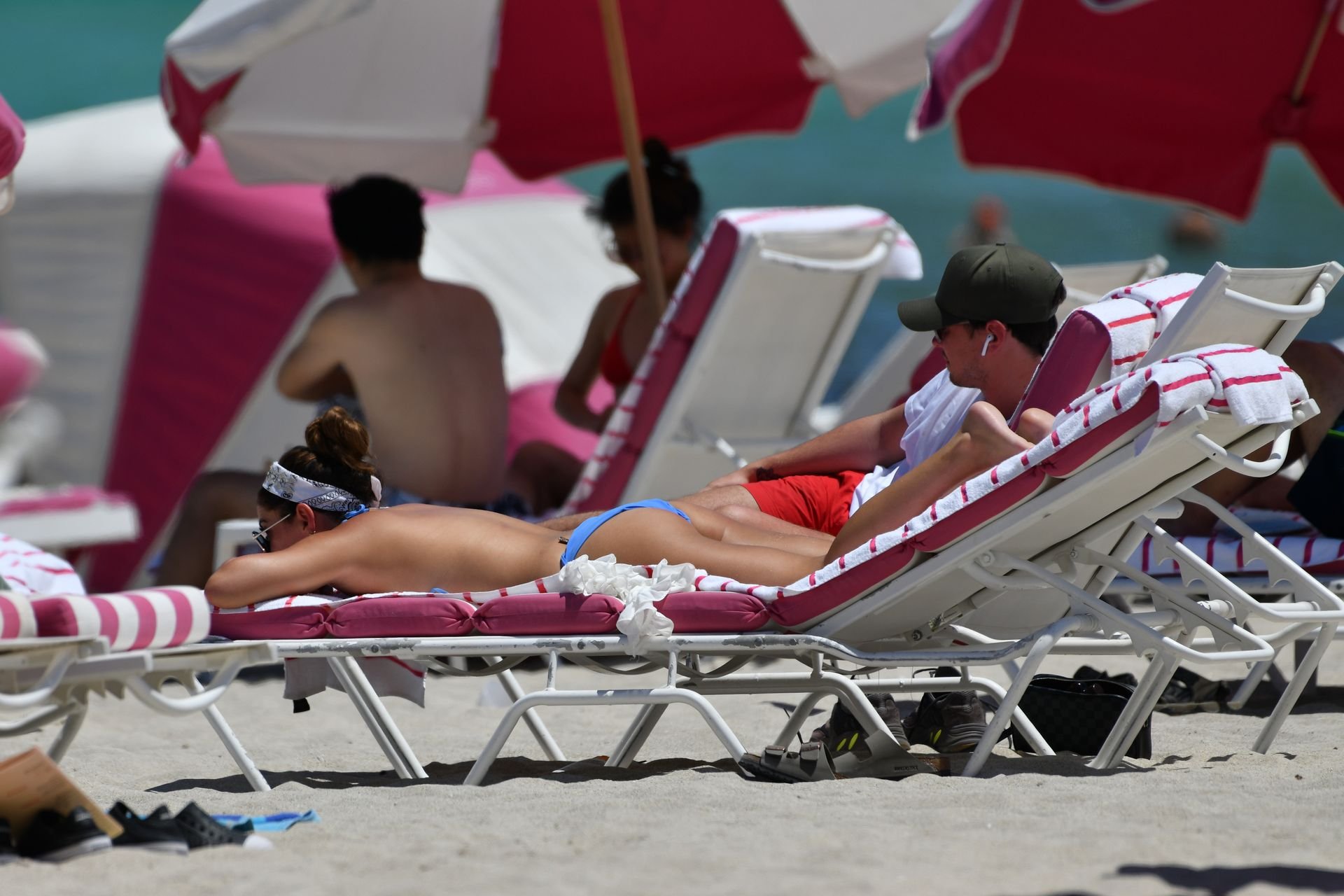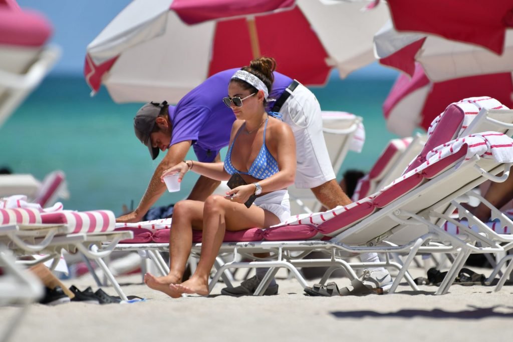 A estrela do TOWIE Courtney Green e seu namorado Callum Bushby exibem seus corpos de praia em Miami Beach, 06/06/2019.