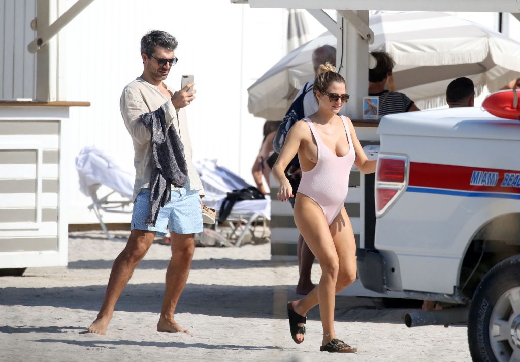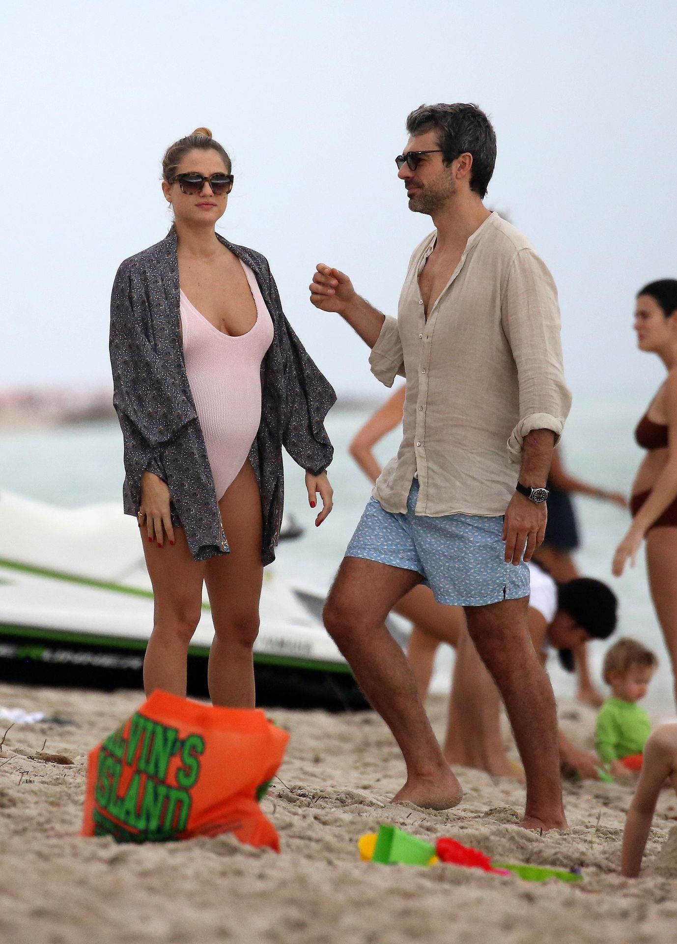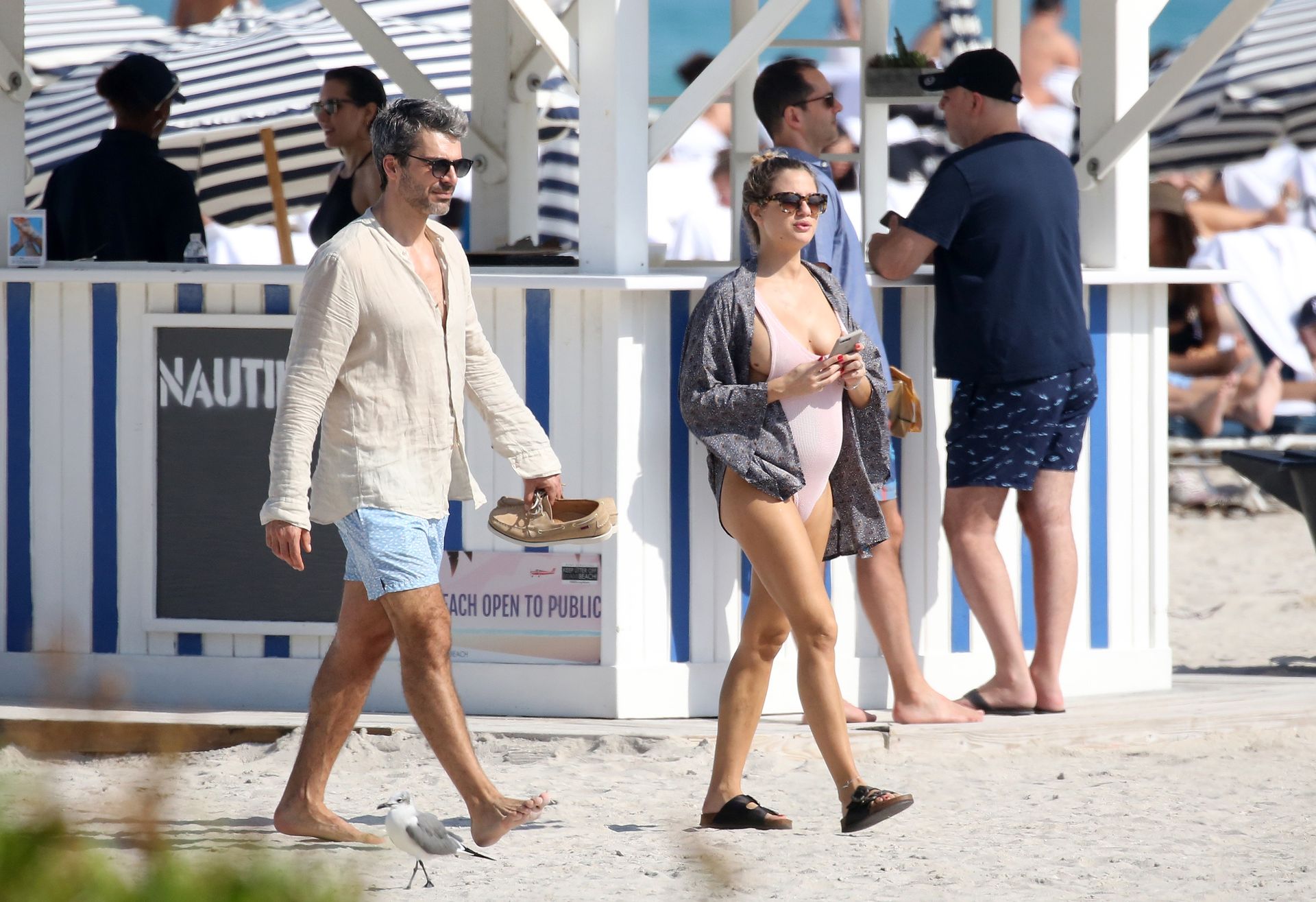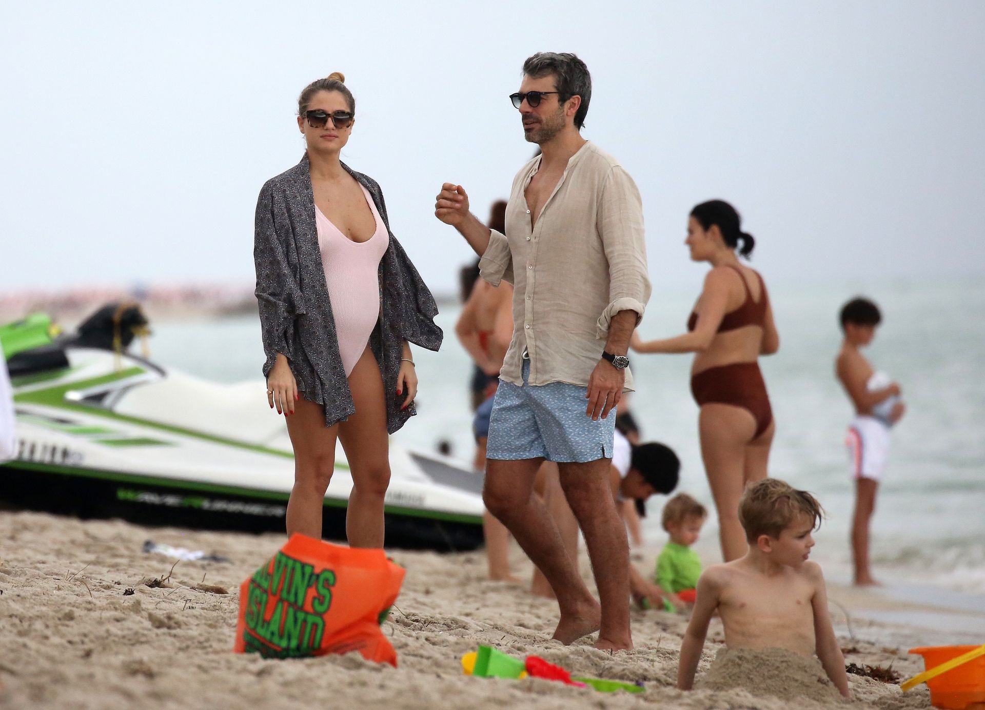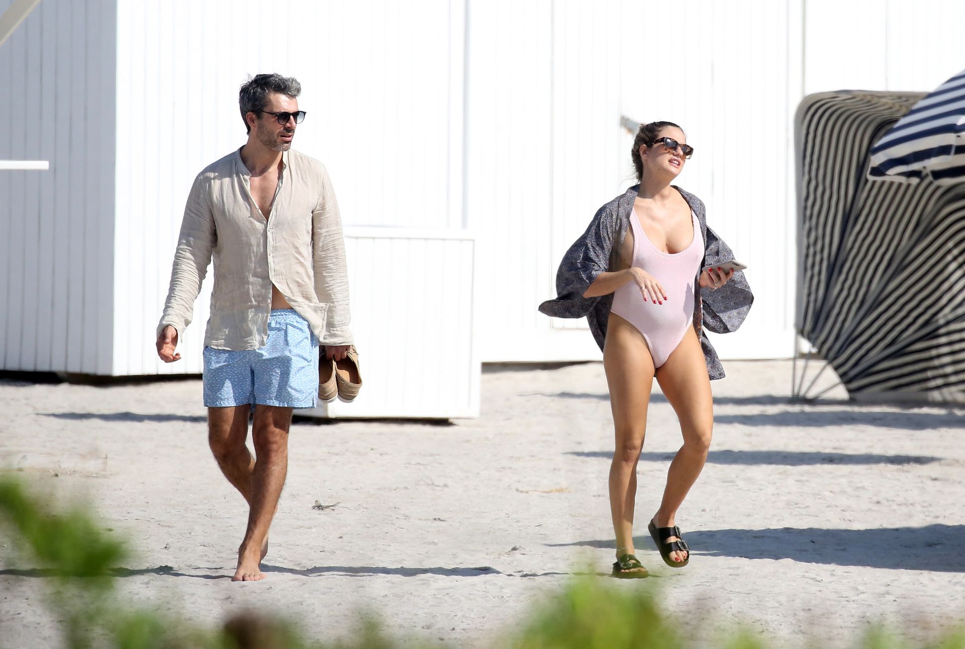 A atriz Cristina Marino exibe sua barriga de grávida e todas as suas novas curvas em um maiô muito revelador enquanto aproveita a praia com Luca Argentero em Miami no dia da véspera de Ano Novo, 31/12/2019.