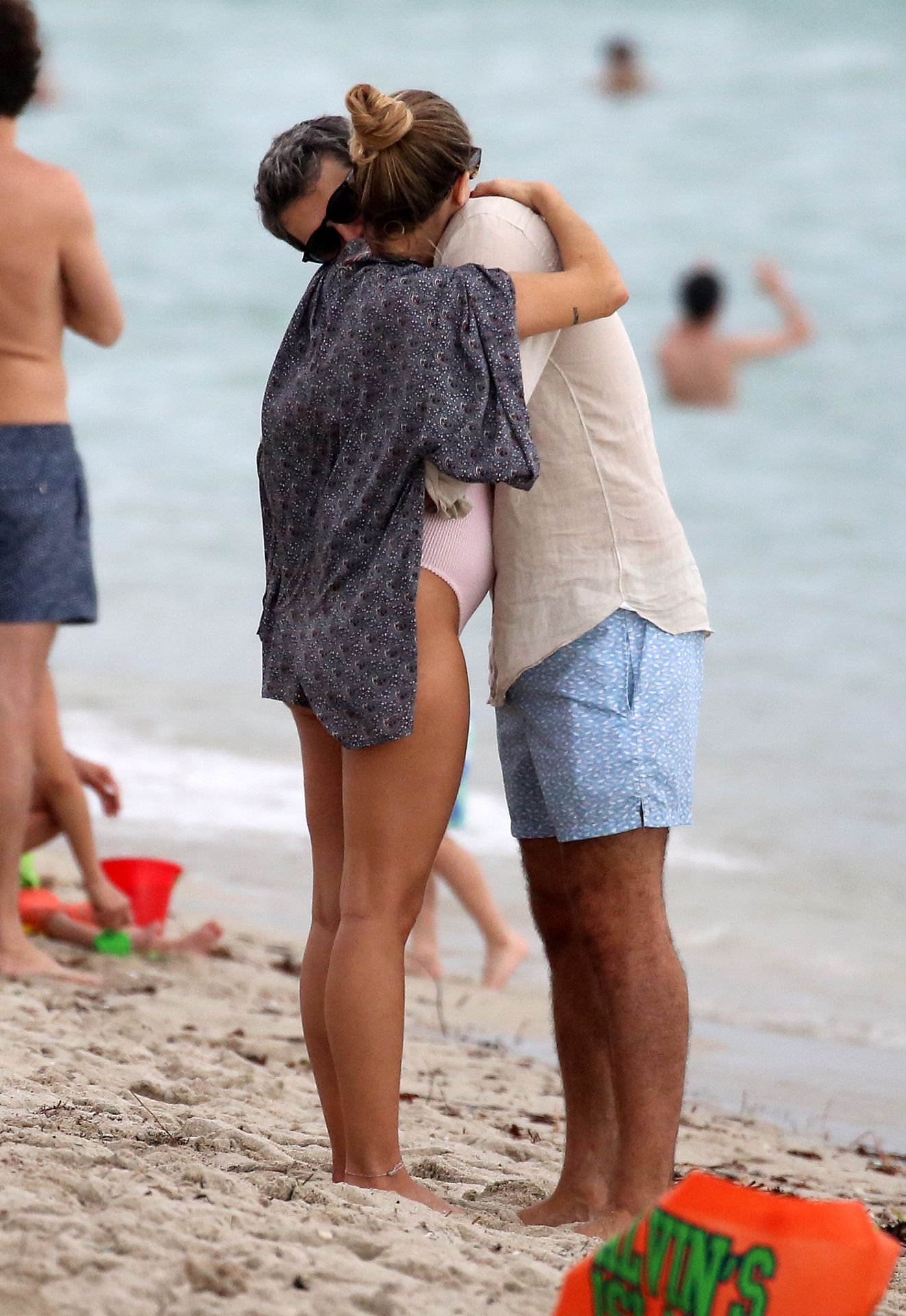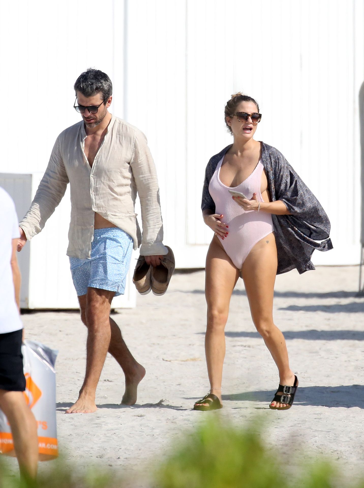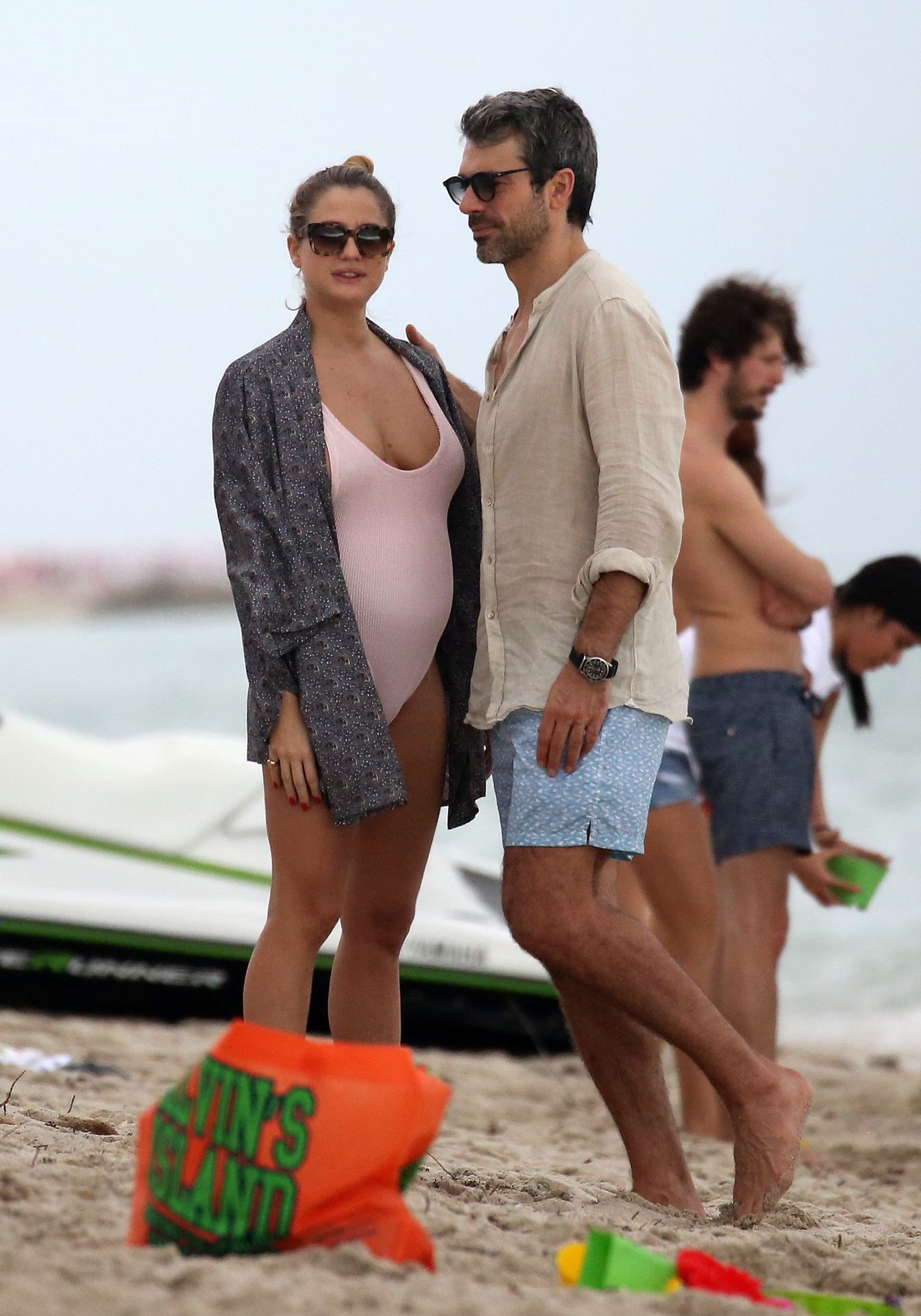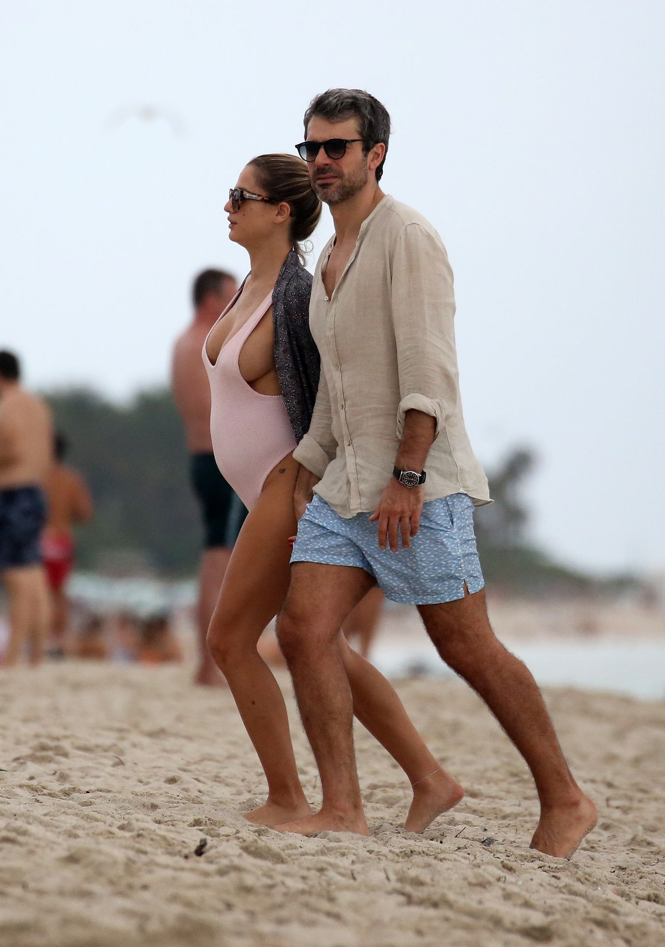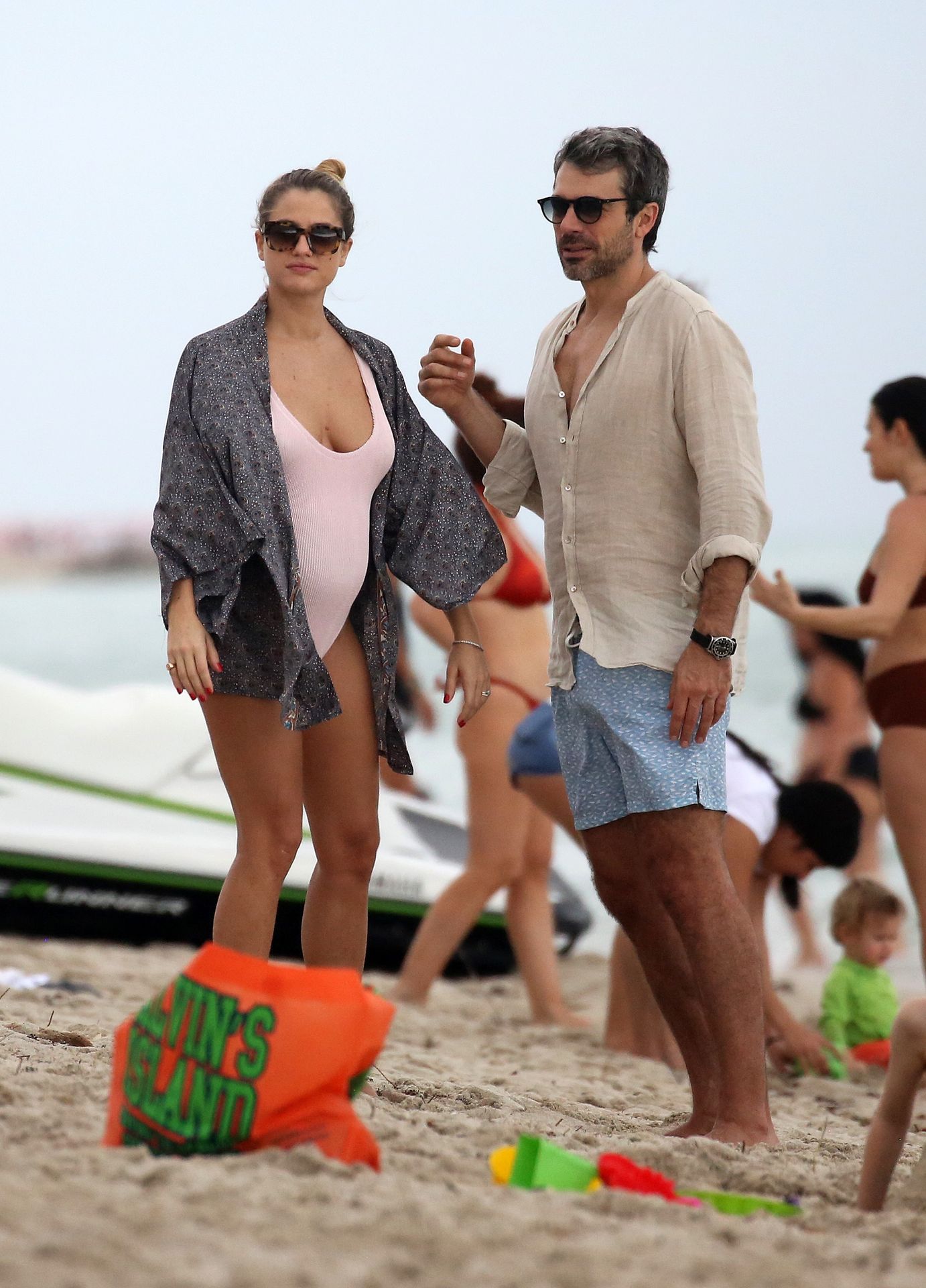 A atriz Cristina Marino exibe sua barriga de grávida e todas as suas novas curvas em um maiô muito revelador enquanto aproveita a praia com Luca Argentero em Miami no dia da véspera de Ano Novo, 31/12/2019.