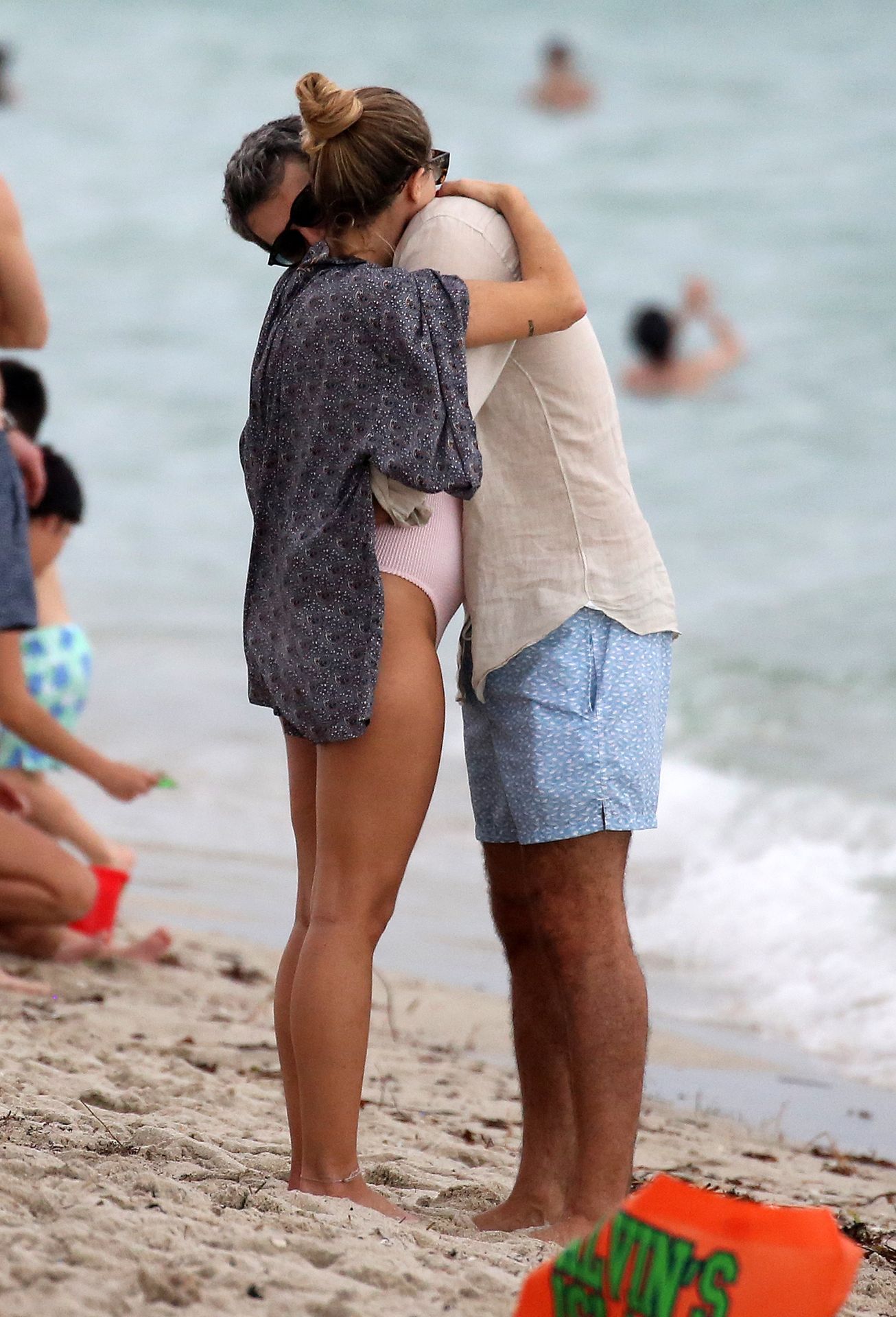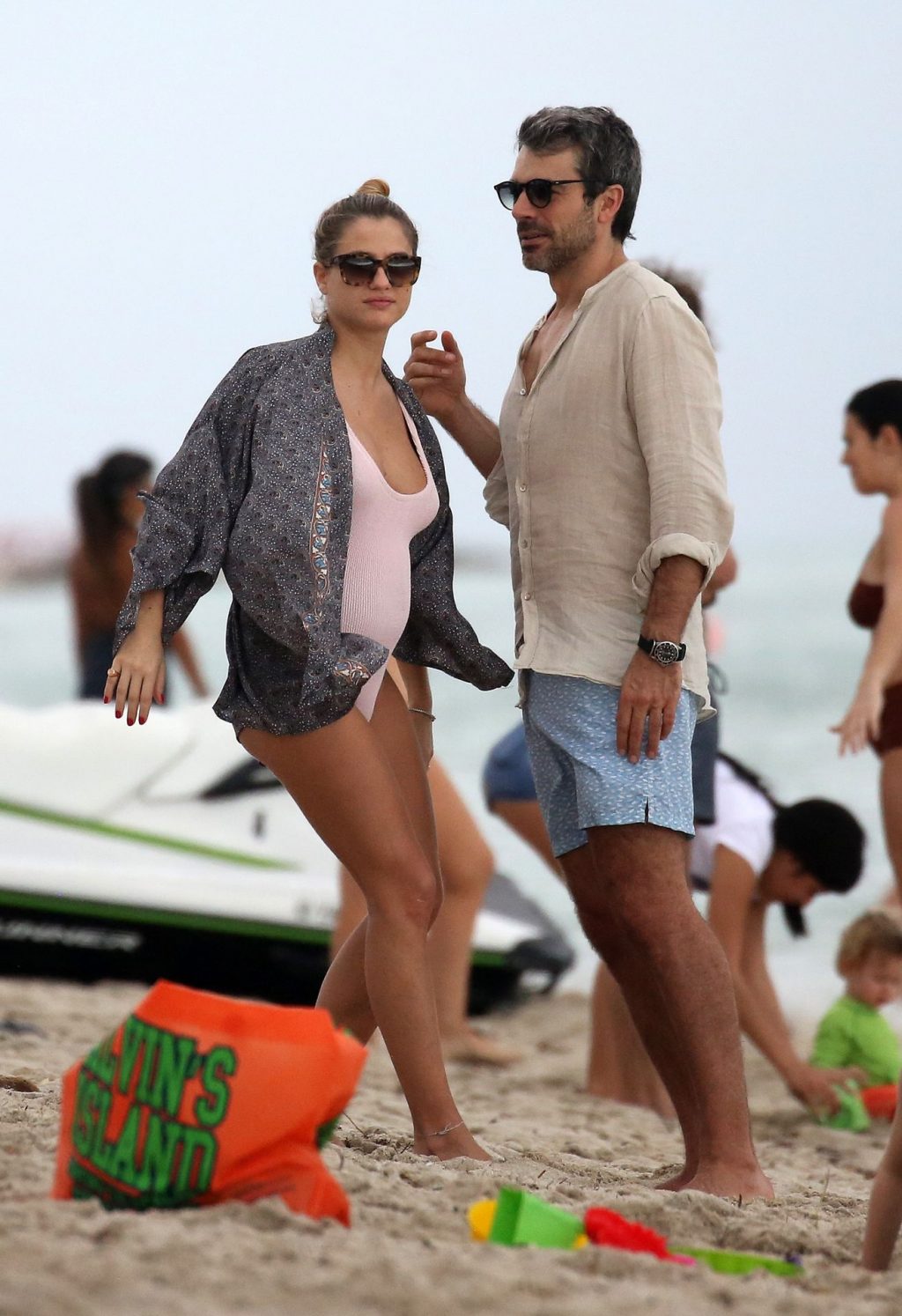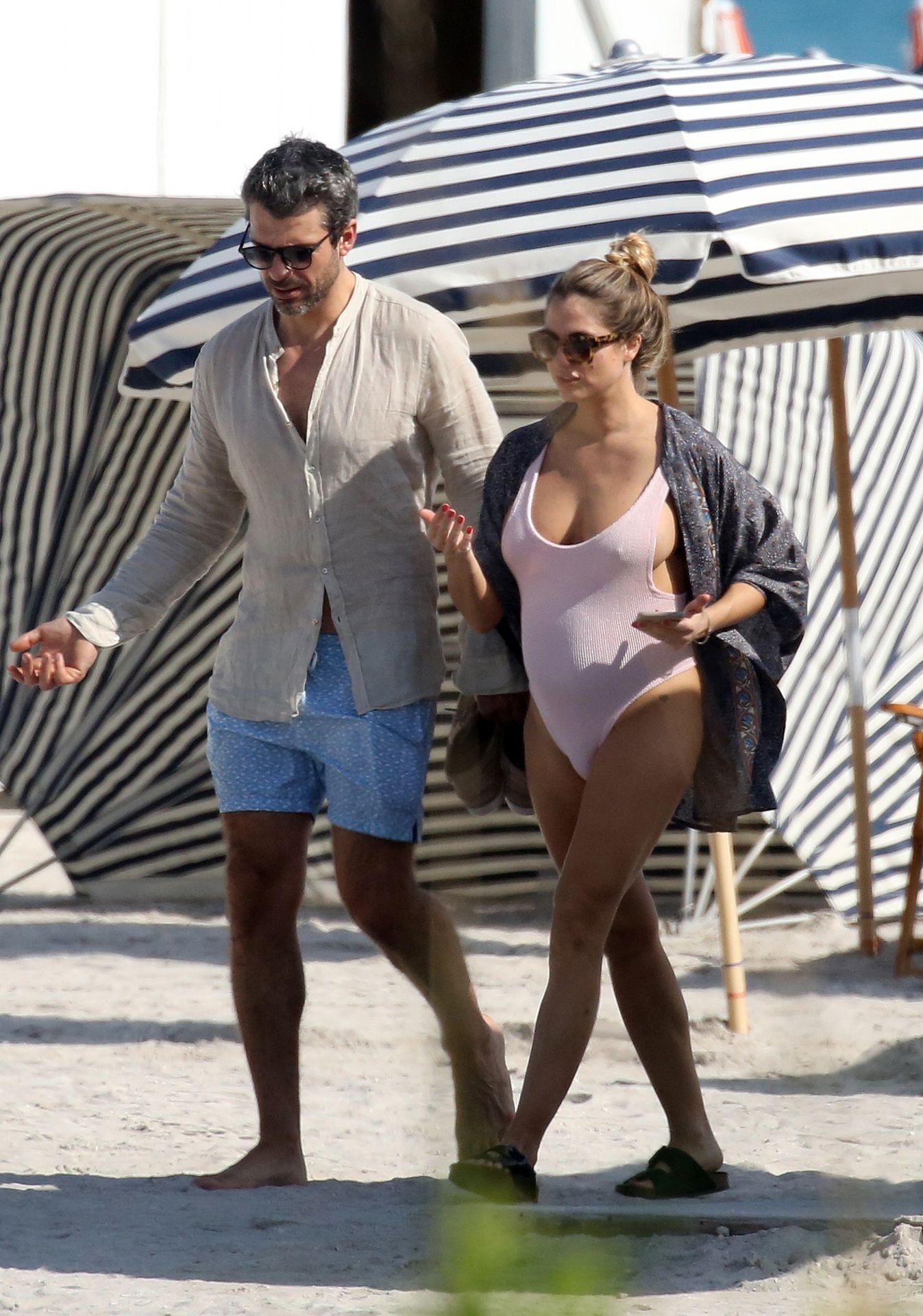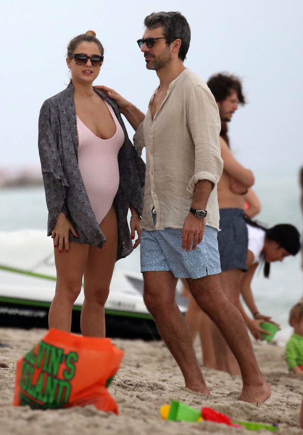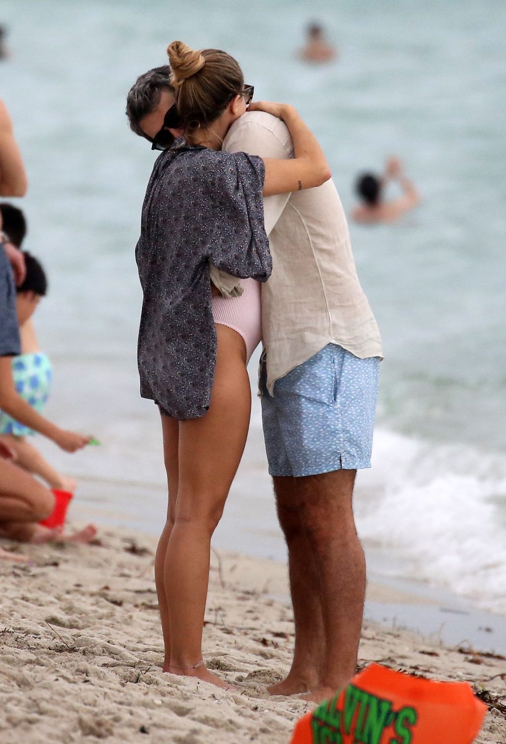 A atriz Cristina Marino exibe sua barriga de grávida e todas as suas novas curvas em um maiô muito revelador enquanto aproveita a praia com Luca Argentero em Miami no dia da véspera de Ano Novo, 31/12/2019.