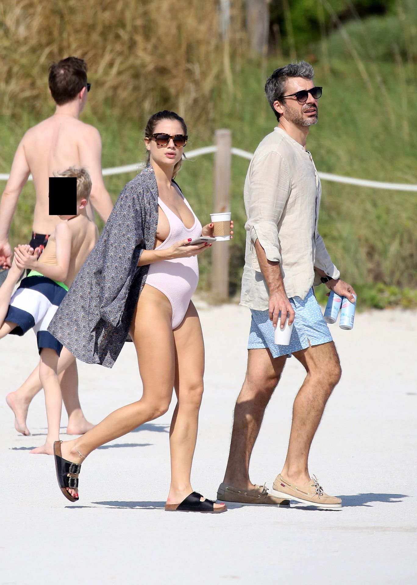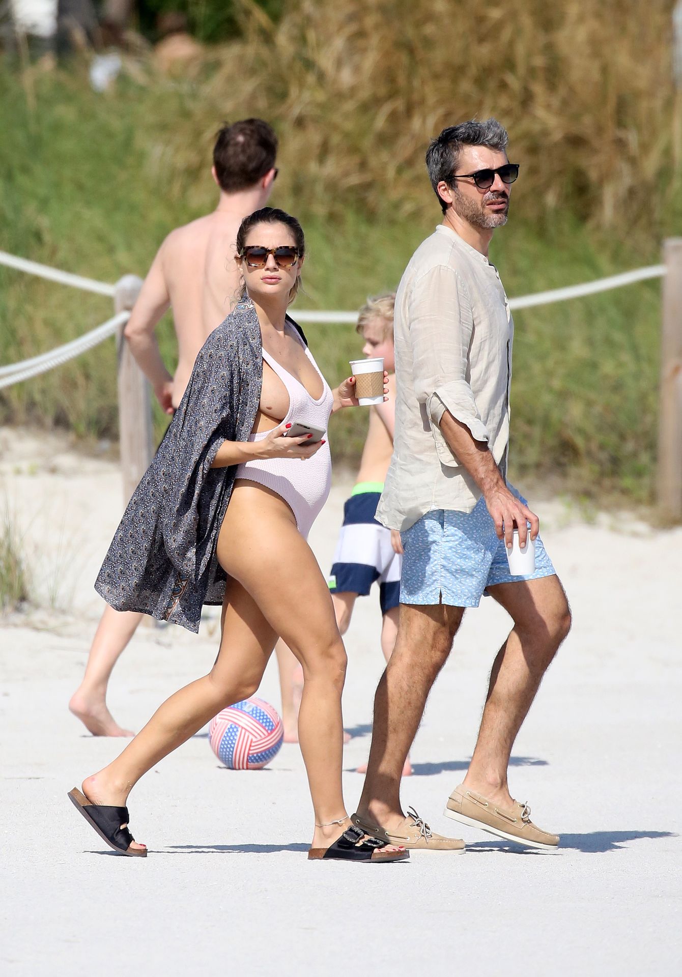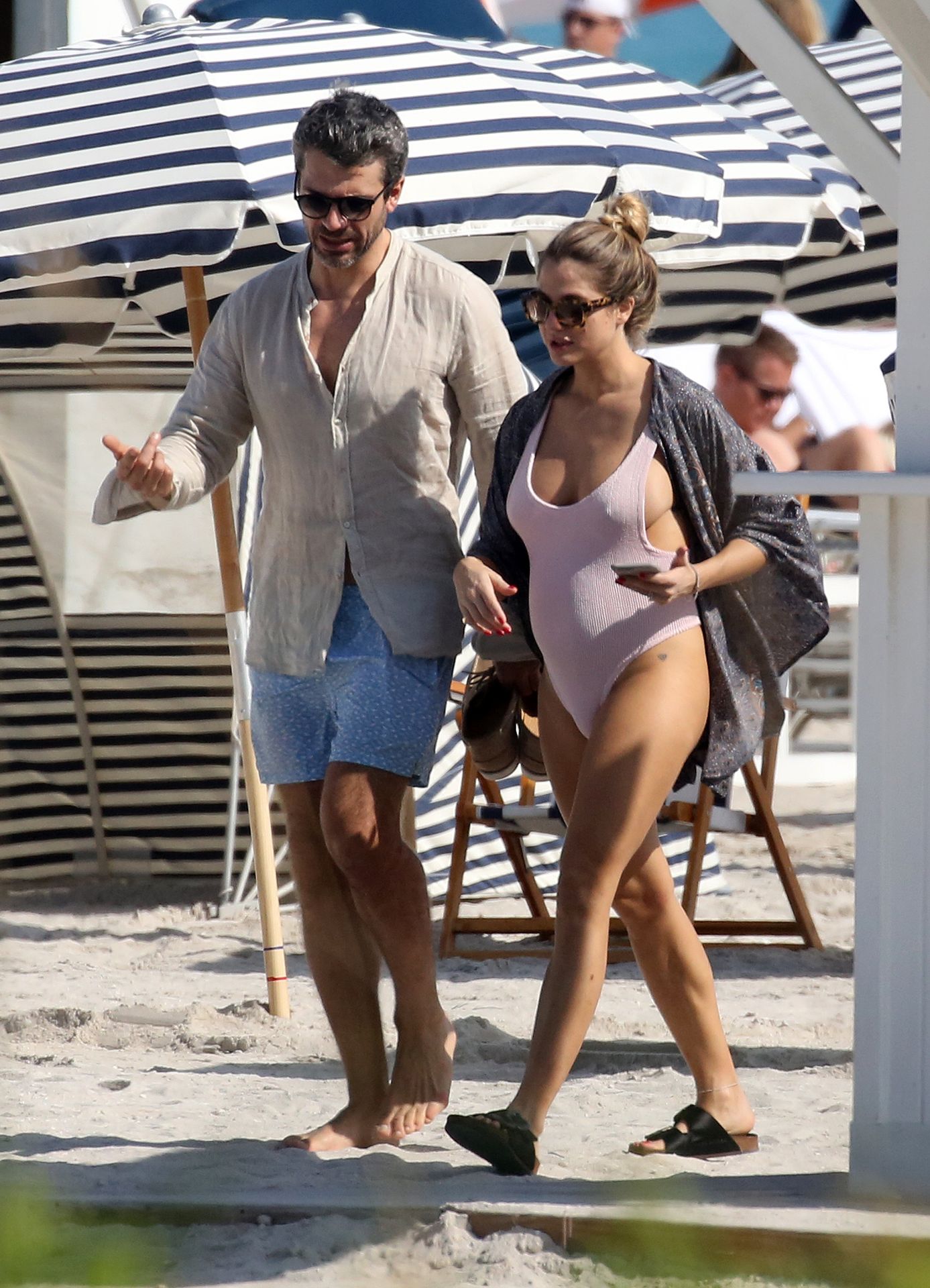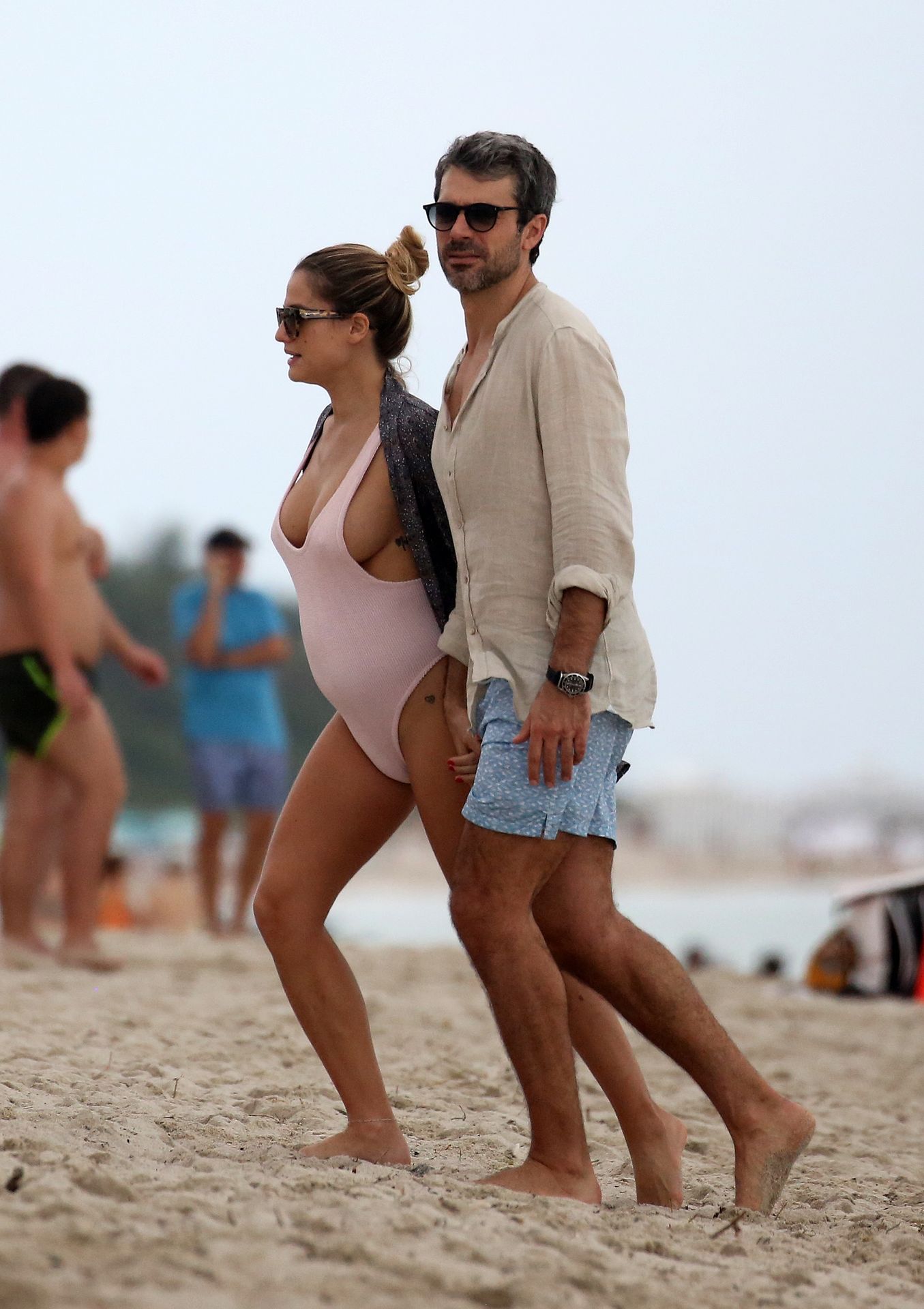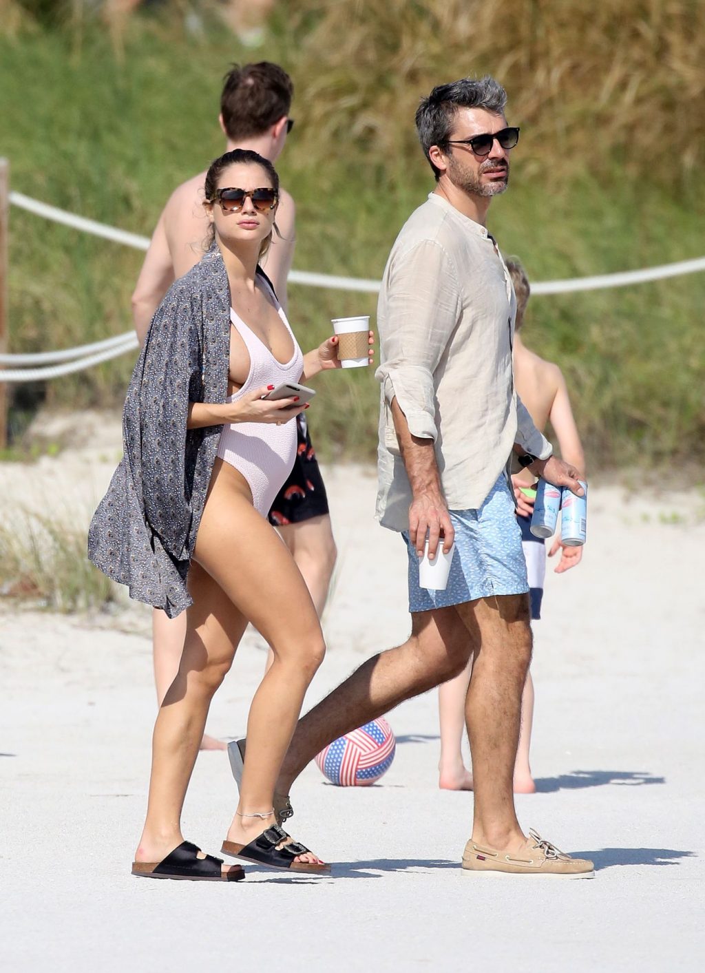 A atriz Cristina Marino exibe sua barriga de grávida e todas as suas novas curvas em um maiô muito revelador enquanto aproveita a praia com Luca Argentero em Miami no dia da véspera de Ano Novo, 31/12/2019.
