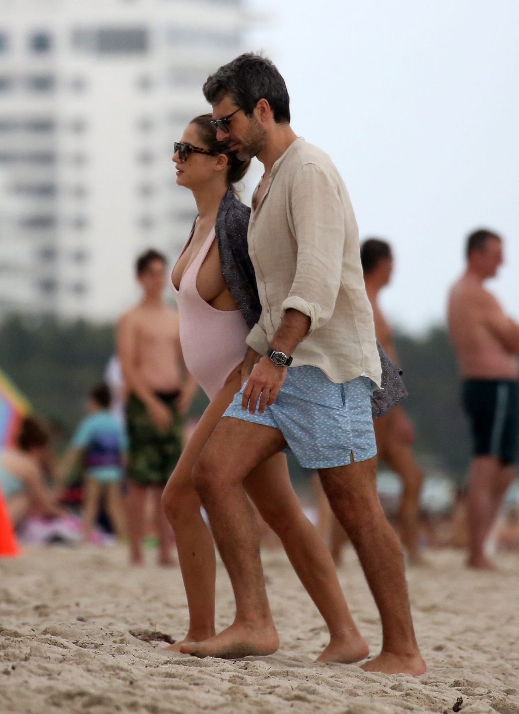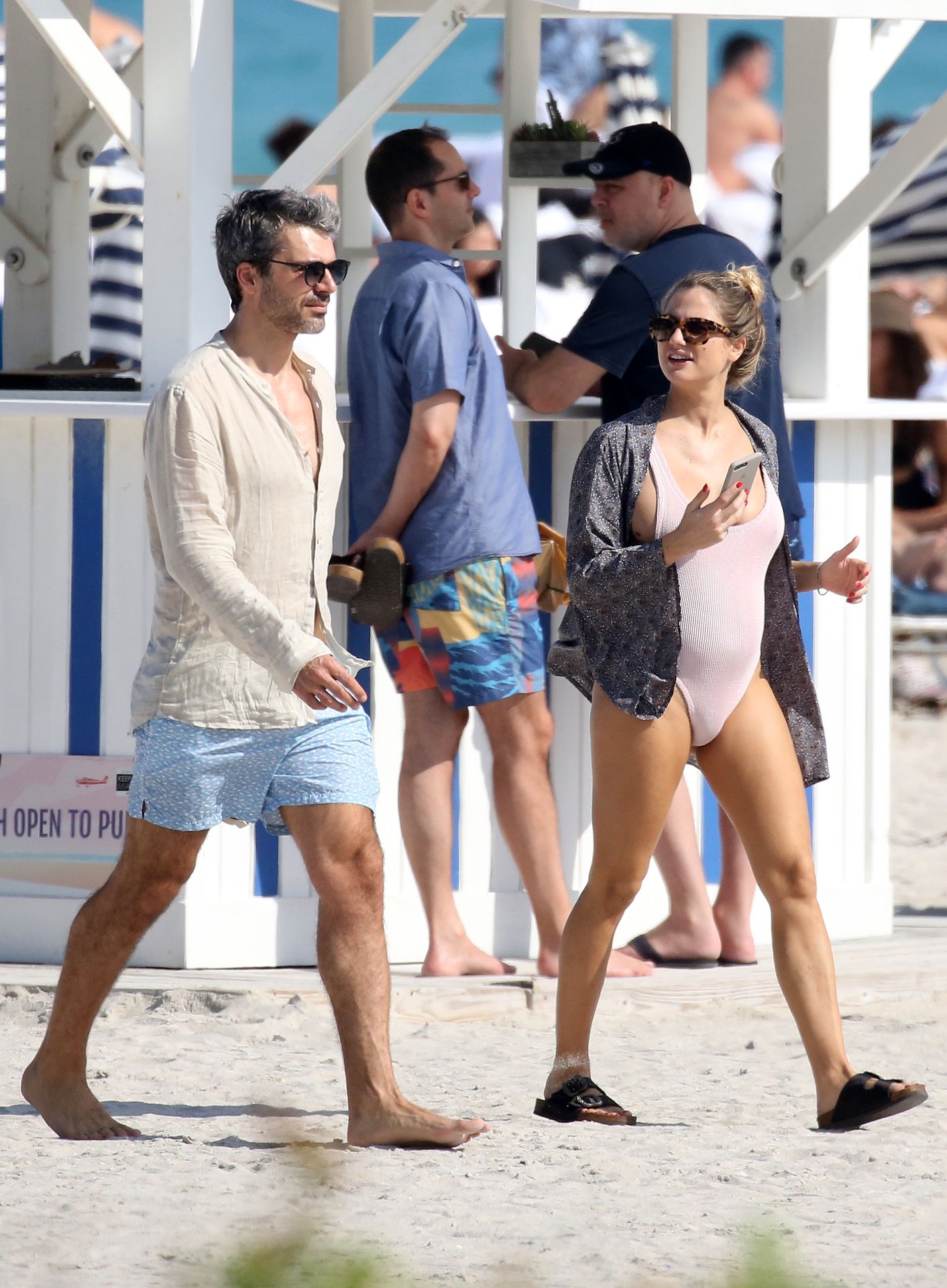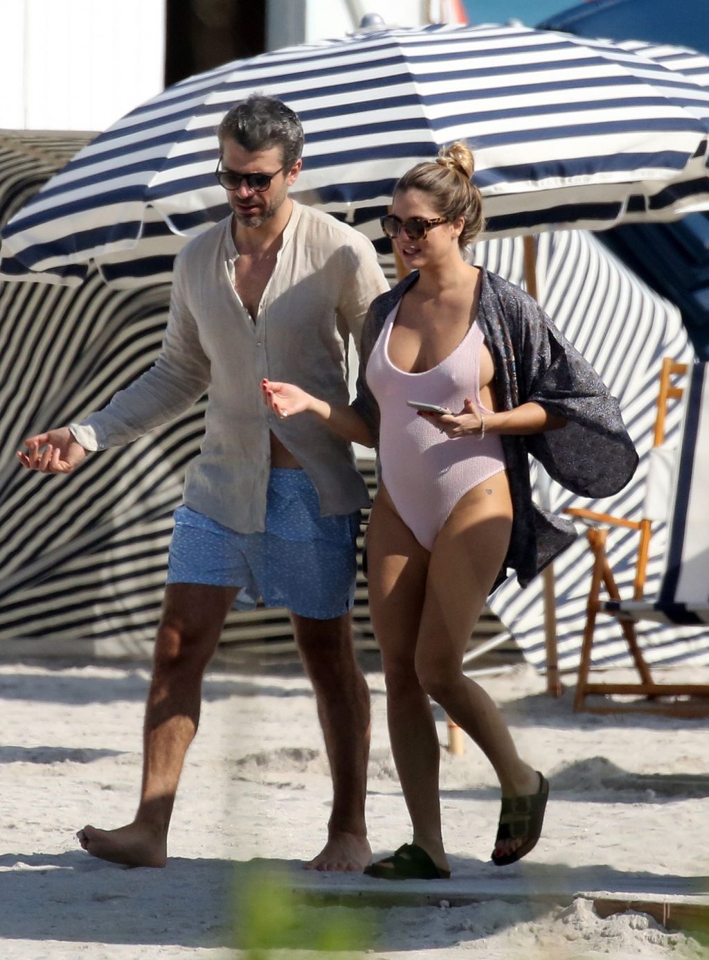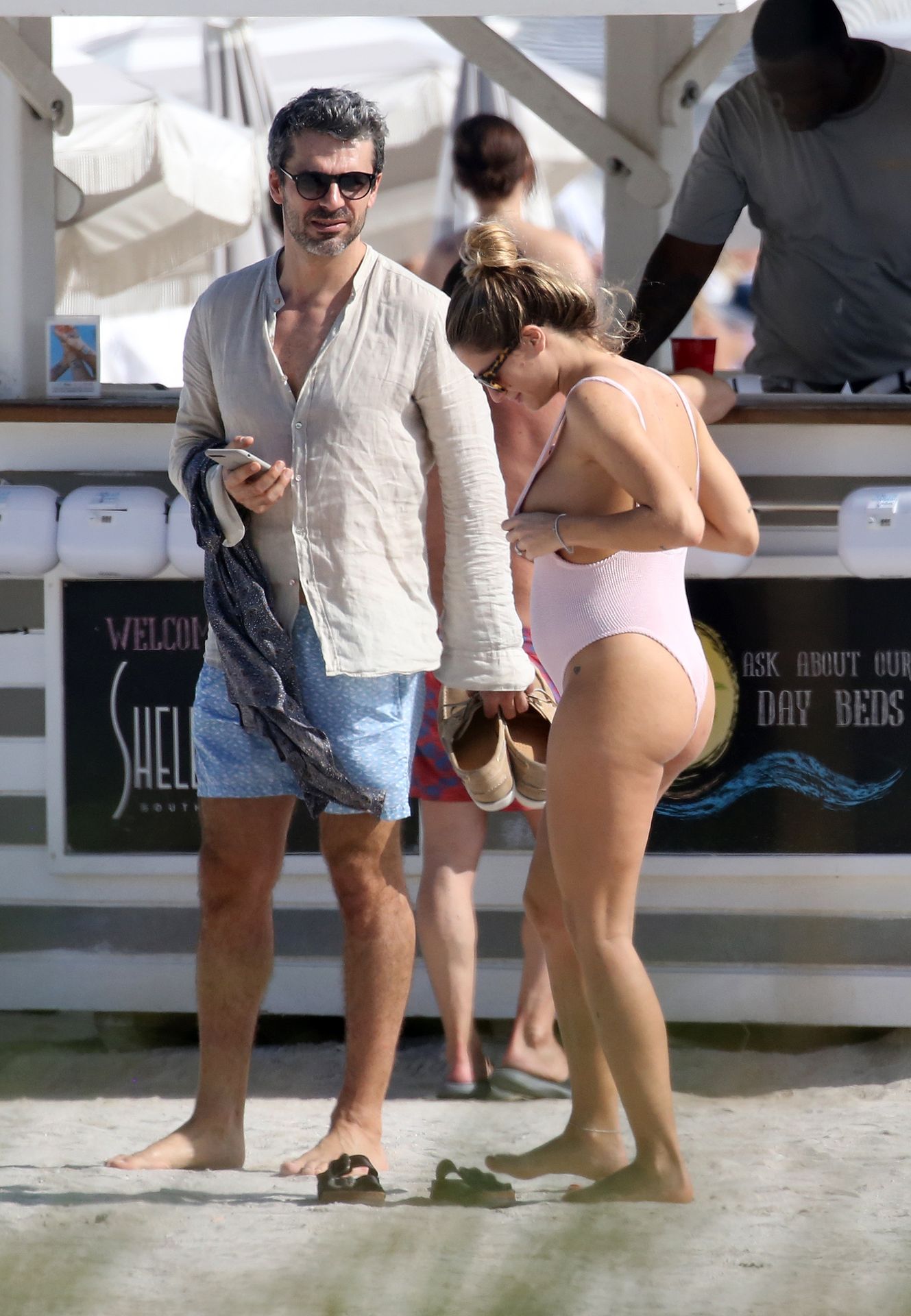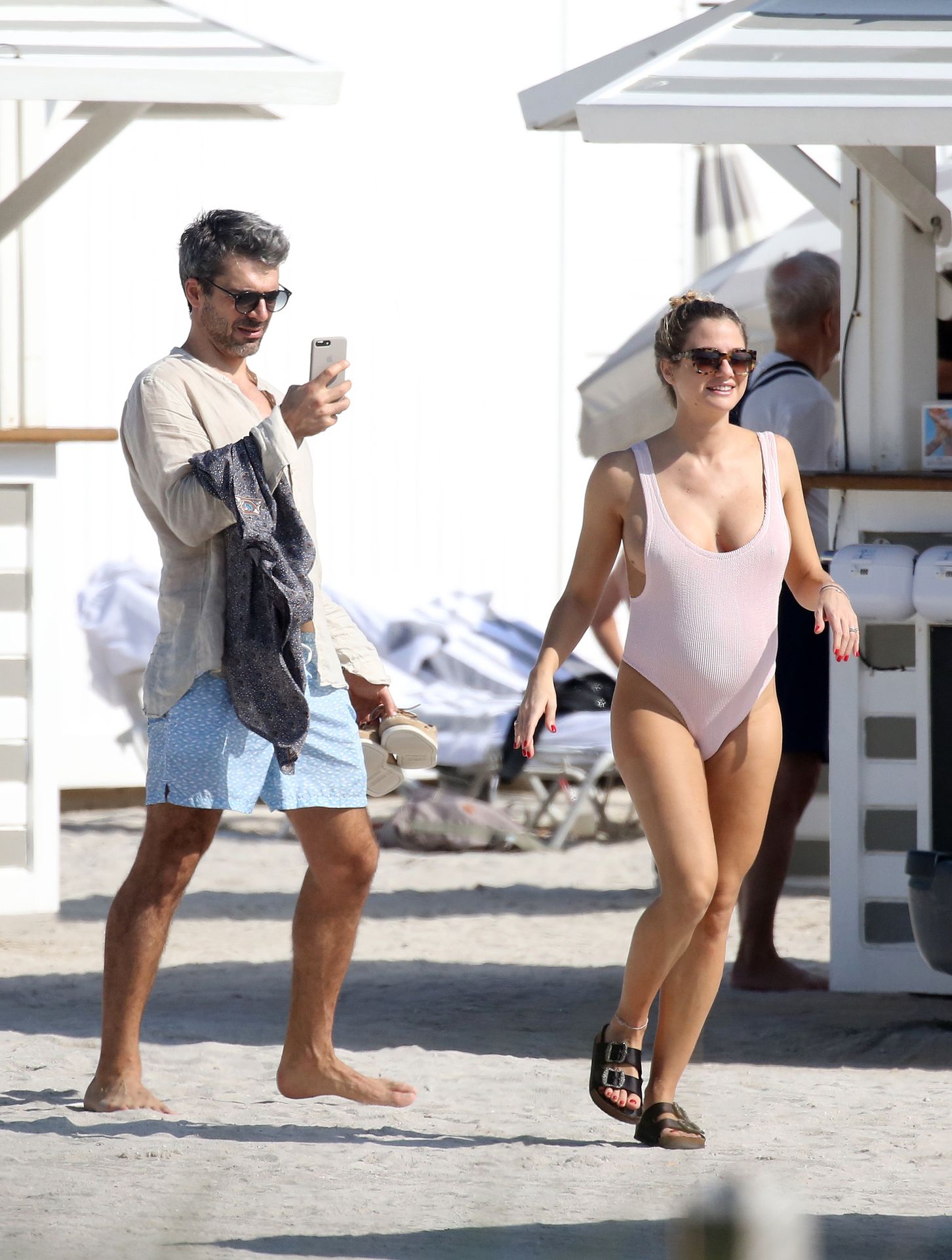 A atriz Cristina Marino exibe sua barriga de grávida e todas as suas novas curvas em um maiô muito revelador enquanto aproveita a praia com Luca Argentero em Miami no dia da véspera de Ano Novo, 31/12/2019.