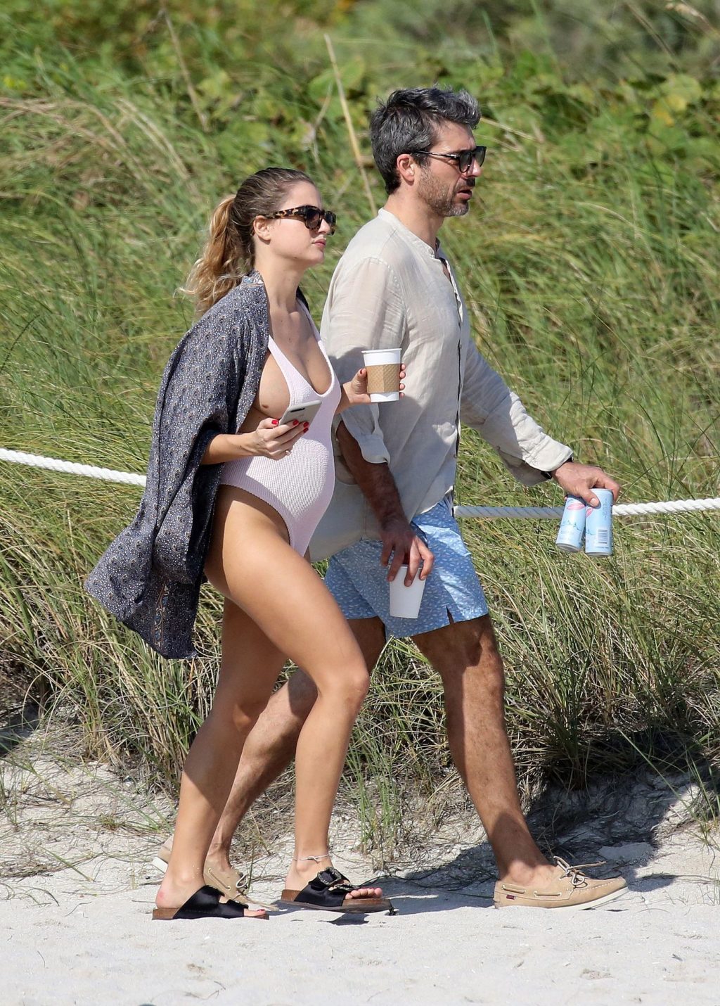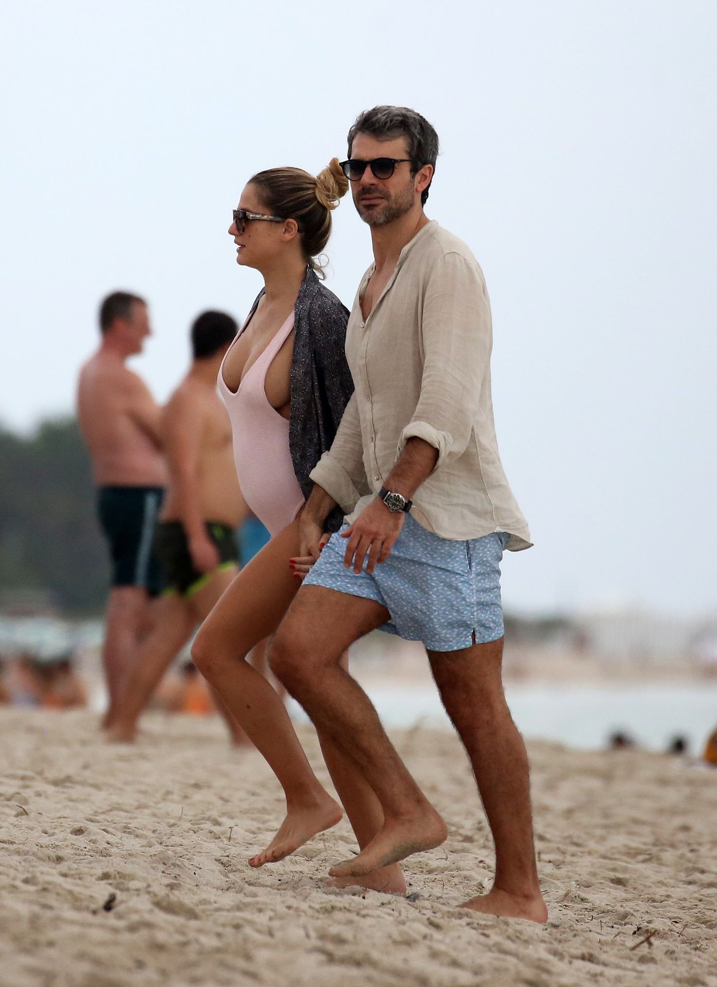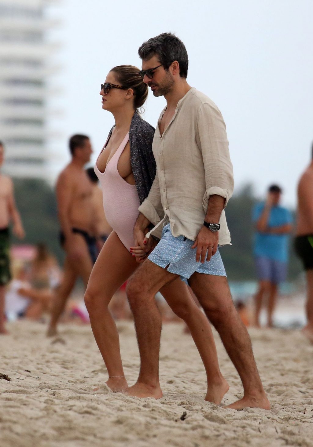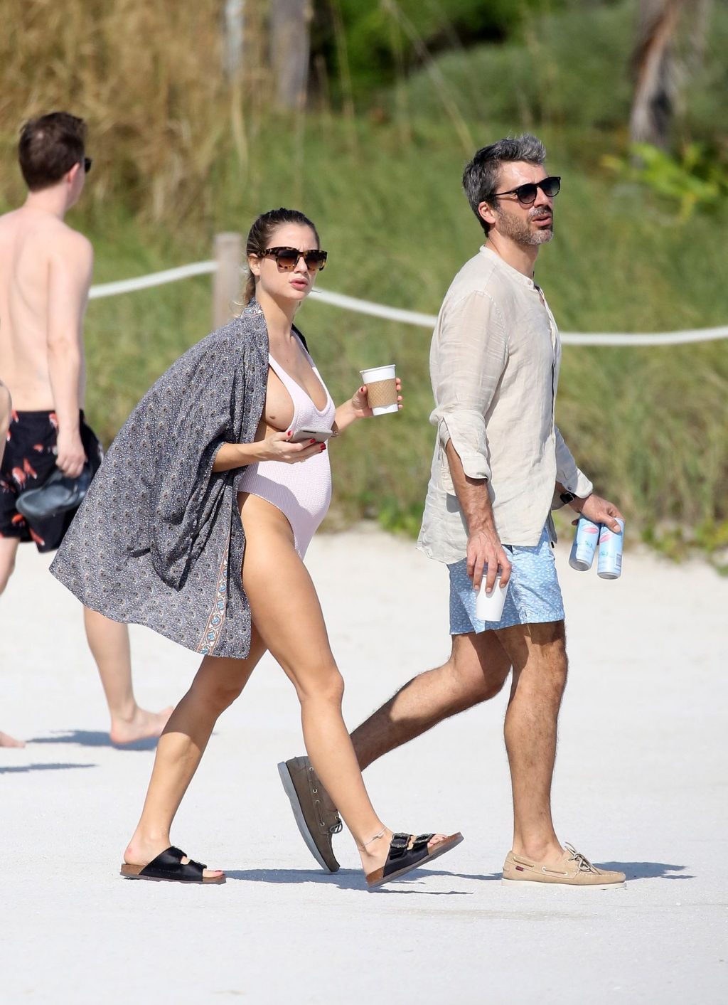 A atriz Cristina Marino exibe sua barriga de grávida e todas as suas novas curvas em um maiô muito revelador enquanto aproveita a praia com Luca Argentero em Miami no dia da véspera de Ano Novo, 31/12/2019.