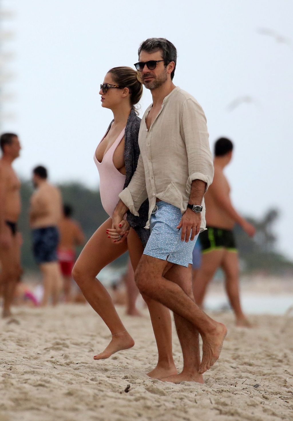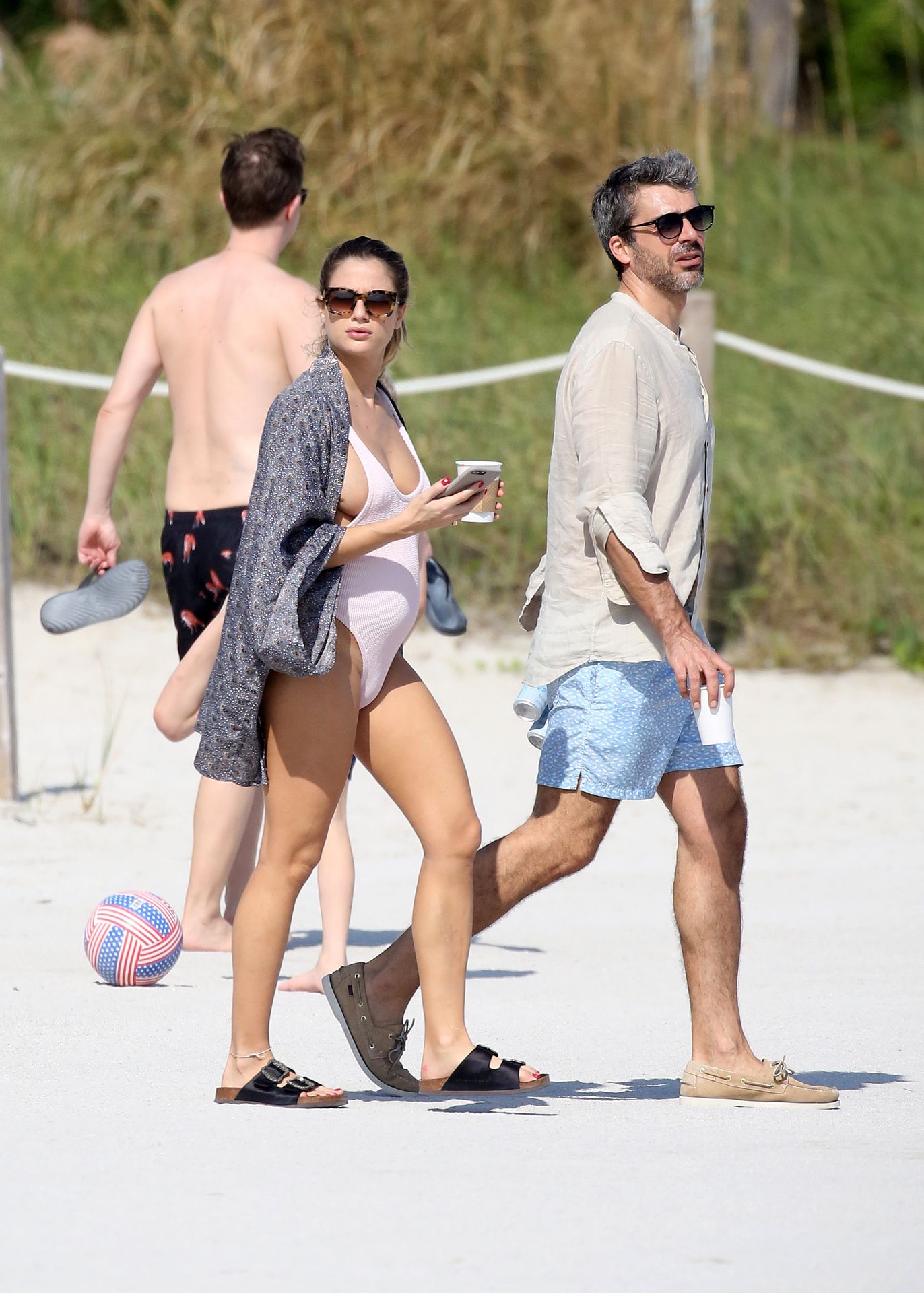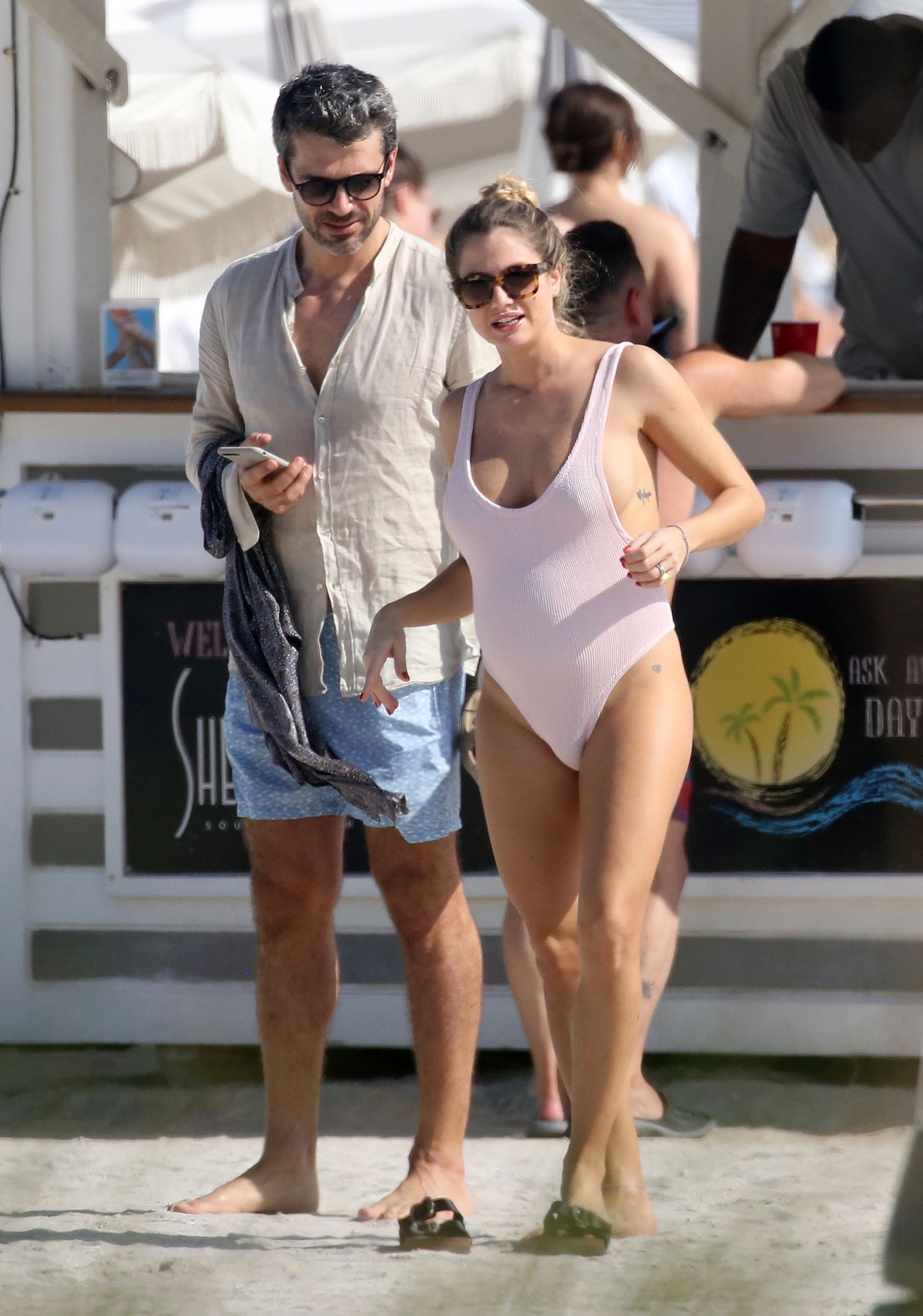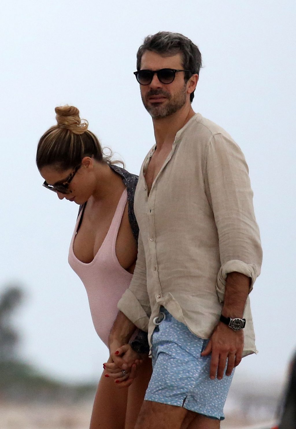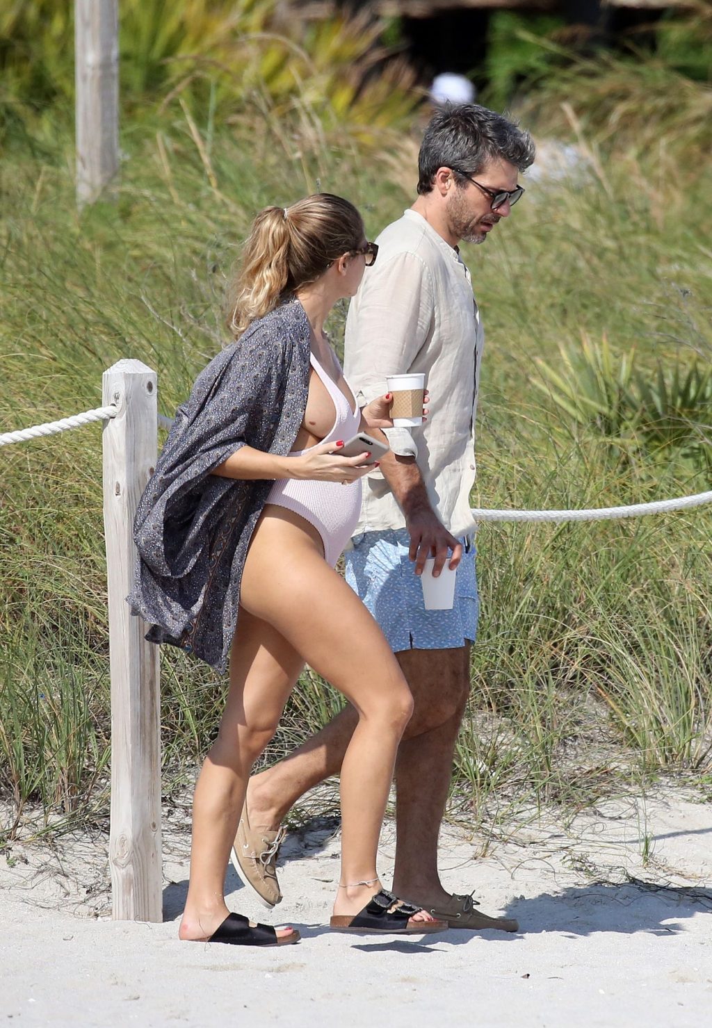 A atriz Cristina Marino exibe sua barriga de grávida e todas as suas novas curvas em um maiô muito revelador enquanto aproveita a praia com Luca Argentero em Miami no dia da véspera de Ano Novo, 31/12/2019.