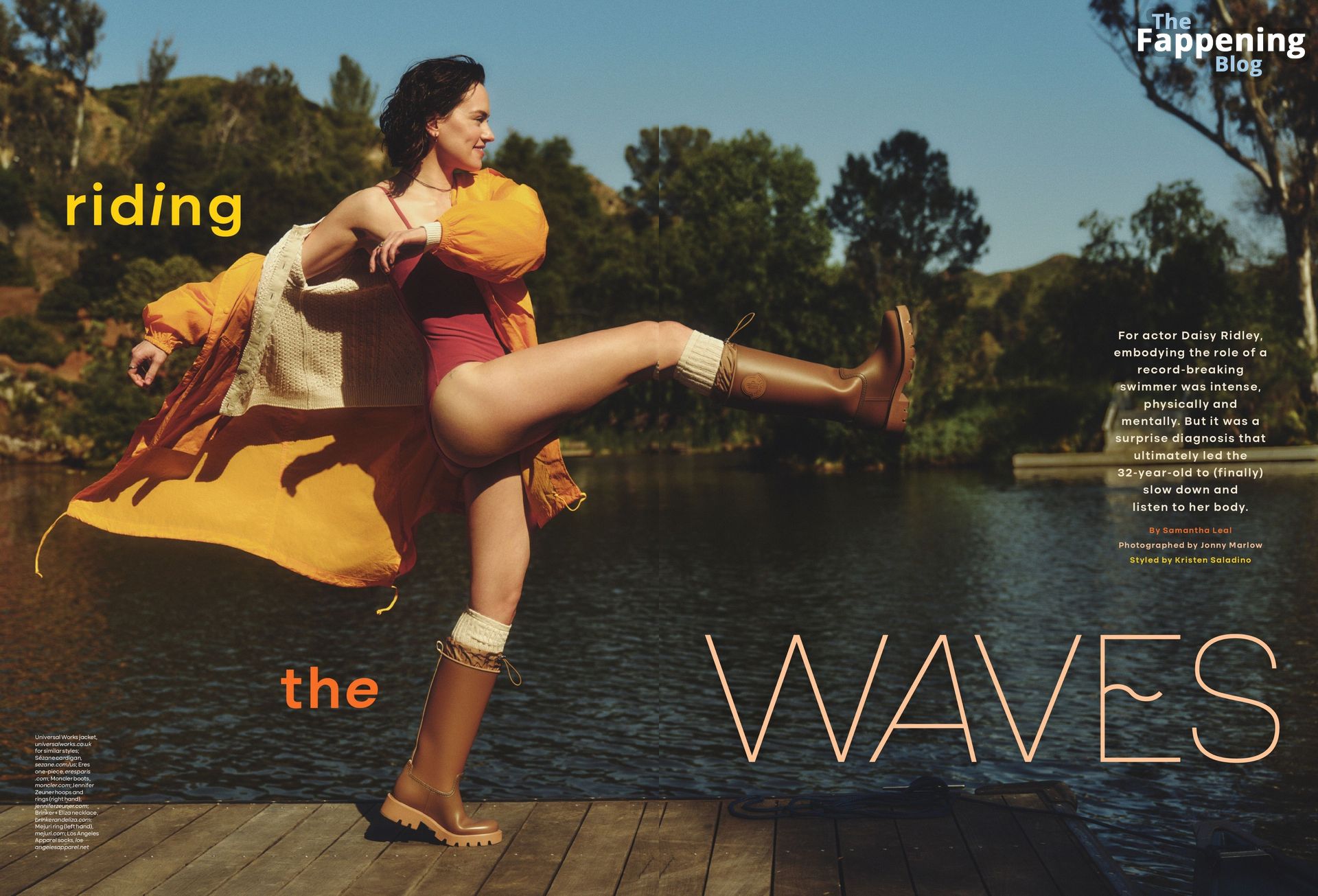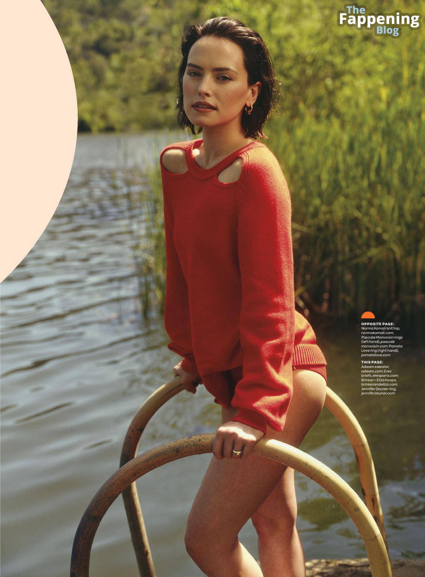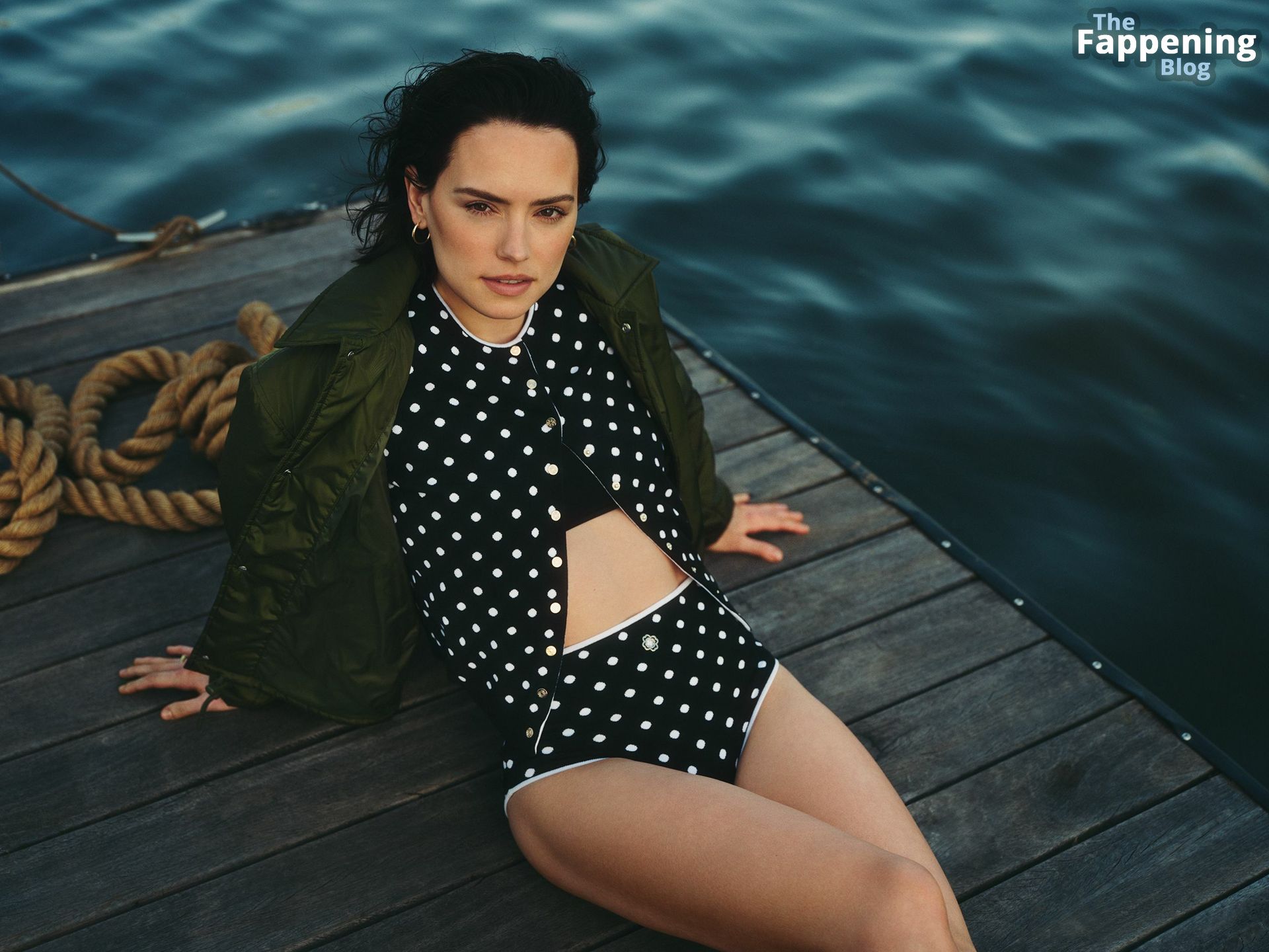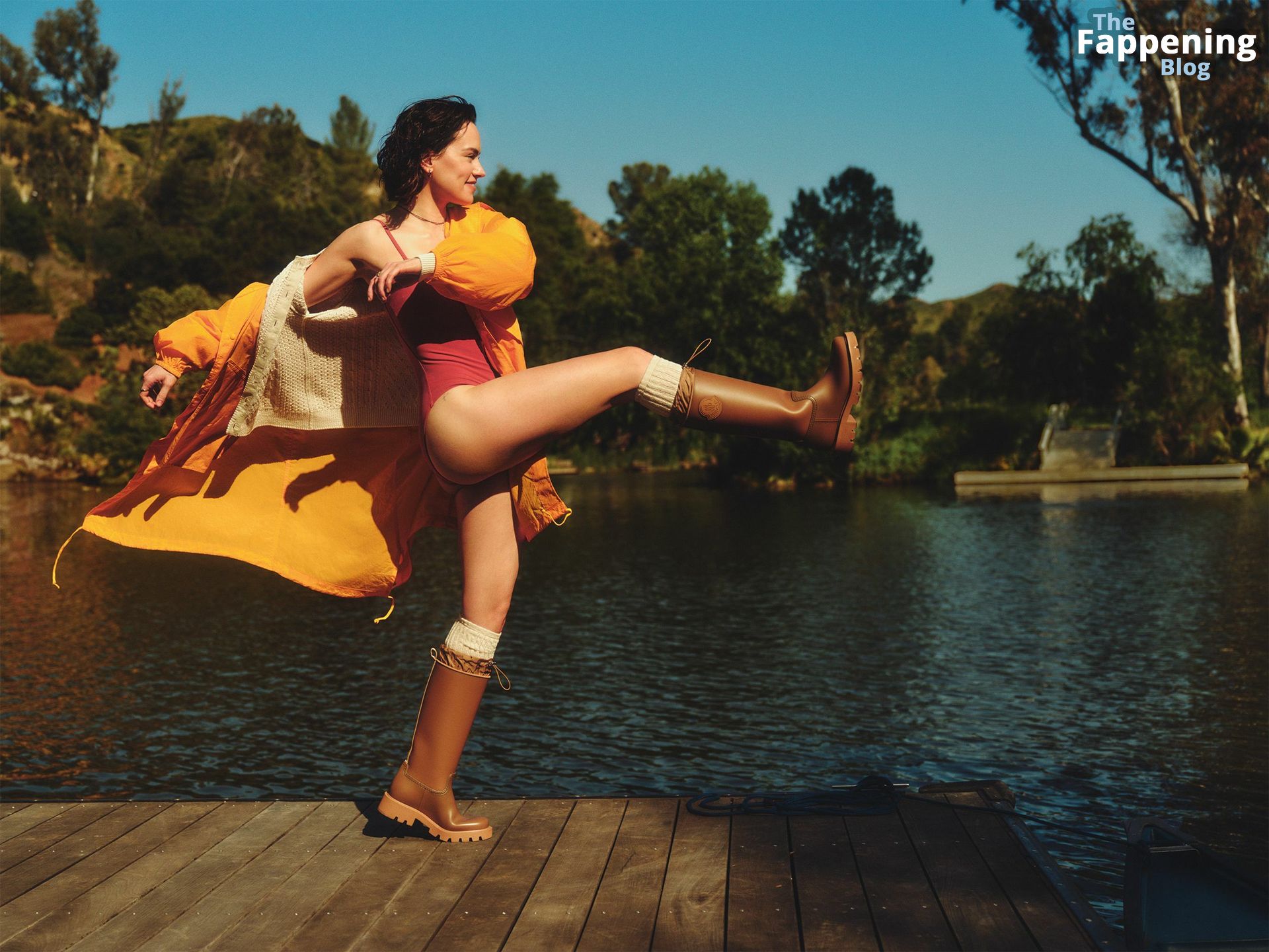No ensaio fotográfico, ambientado em um cenário deslumbrante à beira de um lago, Ridley aparece usando apenas uma calcinha, uma capa de chuva laranja vibrante e botas altas, dando ao seu visual um toque descontraído e ousado. Suas poses marcantes e o olhar confiante refletem a força que ela conquistou ao superar desafios recentes.