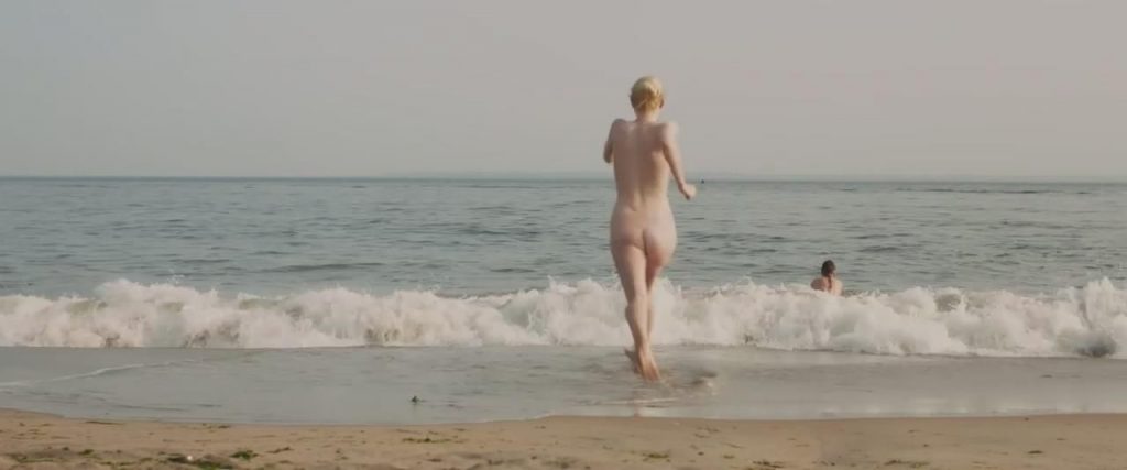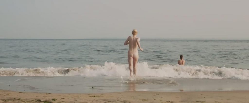 Dakota Fanning e Elizabeth Olsen na praia onde Elizabeth está topless enquanto esconde os seios e incentiva Dakota a ficar nua para um banho de mar pelada. Uma cena de Very Good Girls.