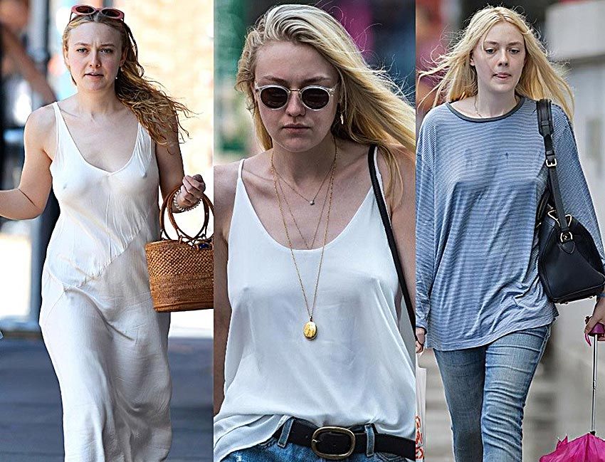 Essa garota simplesmente se recusa a usar sutiã. E não só isso, parece que todo o seu guarda-roupa é feito de camisas finas e transparentes. Elas expõem completamente os seios nus de Dakota Fanning e os mamilos duros sob o tecido fino.