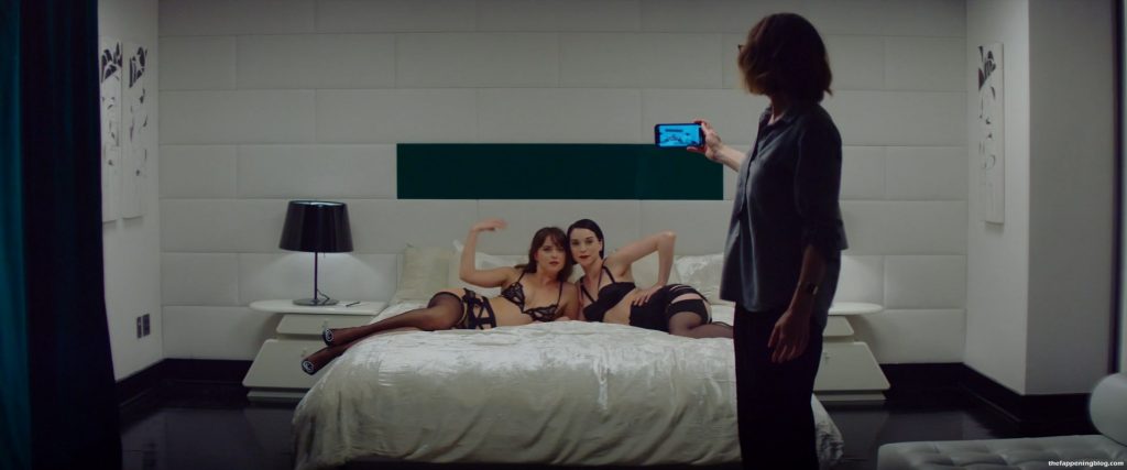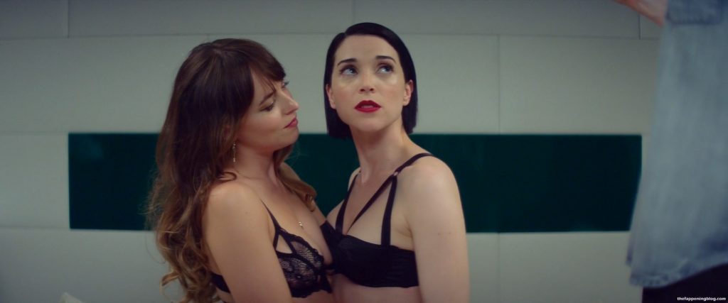 Dakota Johnson está deitada na cama com uma lingerie sexy enquanto é acompanhada pela musicista St. Vincent (também conhecida como Annie Clark), que está vestida de forma semelhante com lingerie. As garotas então posam de forma sexy para alguém gravar um vídeo delas. Dakota e St. Vincent se ajoelham uma de frente para a outra, mostrando decote enquanto se pressionam. Finalmente, vemos as garotas deitadas de lado com as costas encostadas, Dakota revelando um adesivo de mamilo. Dakota está à esquerda com o cabelo mais longo.