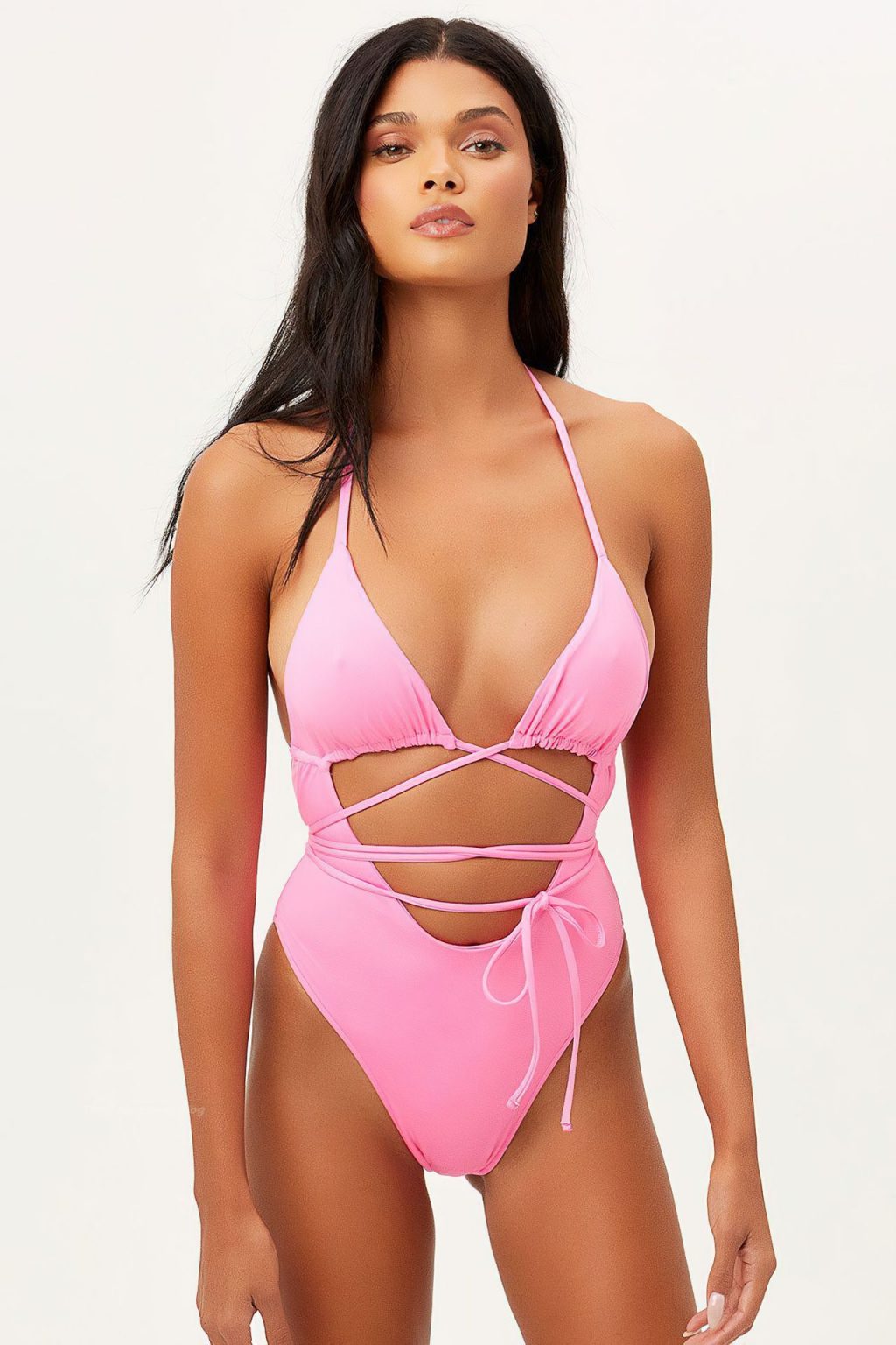 A morena brasileira Daniela Braga exibe sua magnífica silhueta usando biquínis sexy de duas peças em um ensaio promocional para a campanha da Frankie’s Bikinis (2021).