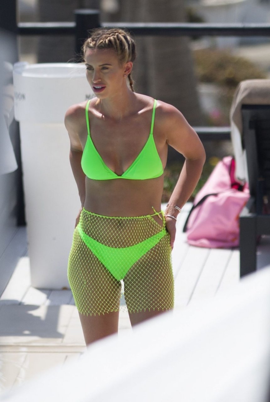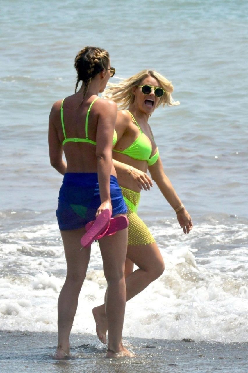 Ambas as mulheres estavam deslumbrantes exibindo seus corpos sensuais com seus biquínis pequenos verde-limão combinando enquanto se dirigiam para dar um mergulho no mar.