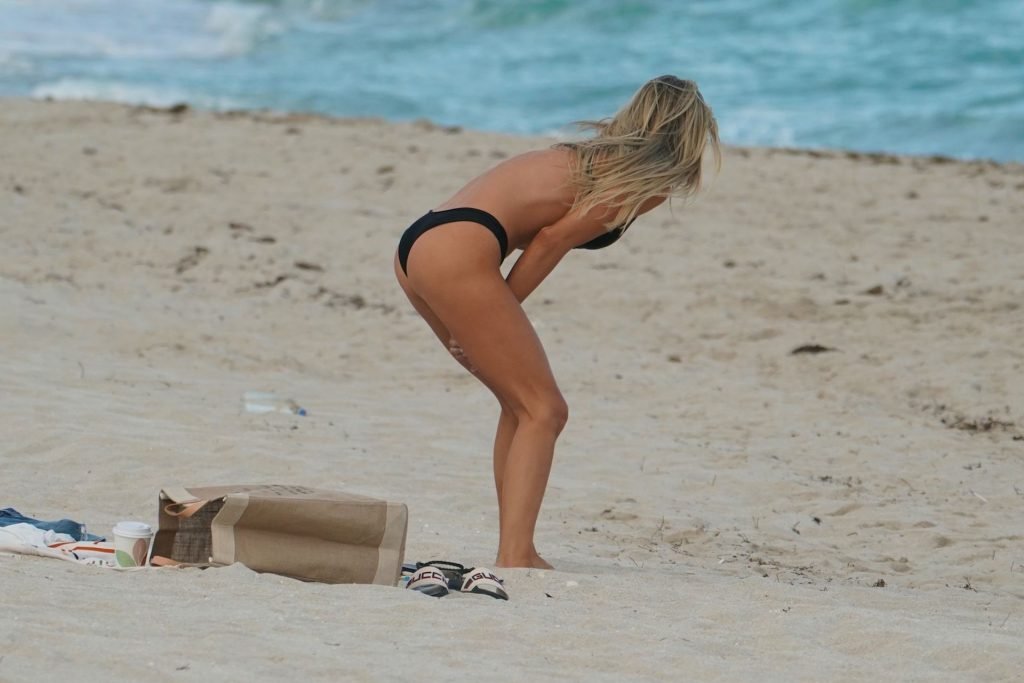 A modelo canadense Danielle Knudson foi vista usando um biquíni fio dental preto com sua amiga, a gata germano-croata Jelena Cikoja, na praia em Miami Beach, 12/08/2018.