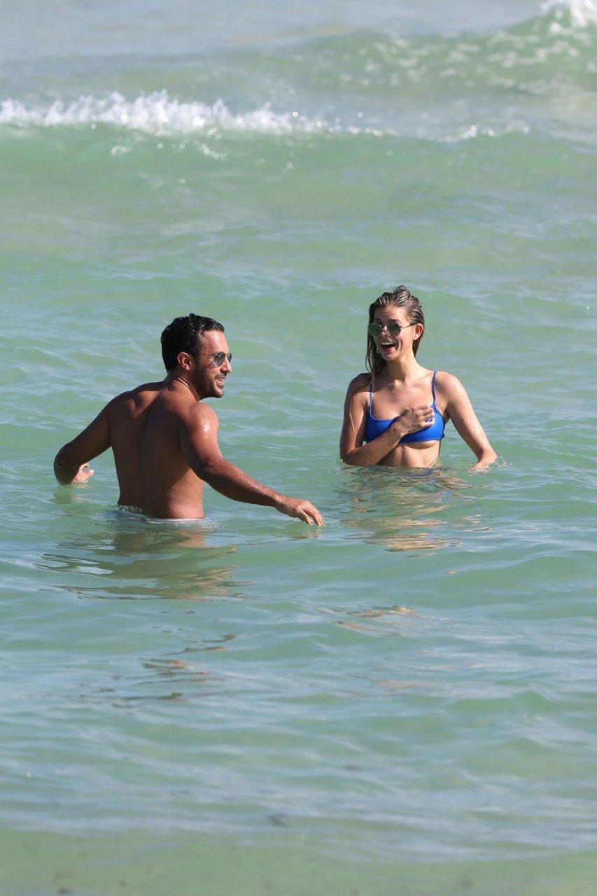 A modelo Danielle Knudson exibe sua figura deslumbrante em um biquíni azul na Miami Beach após não conseguir desfilar no show da Victoria’s Secret, 09/11/2018.