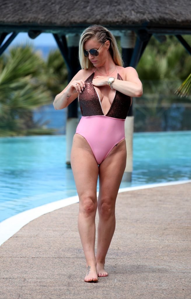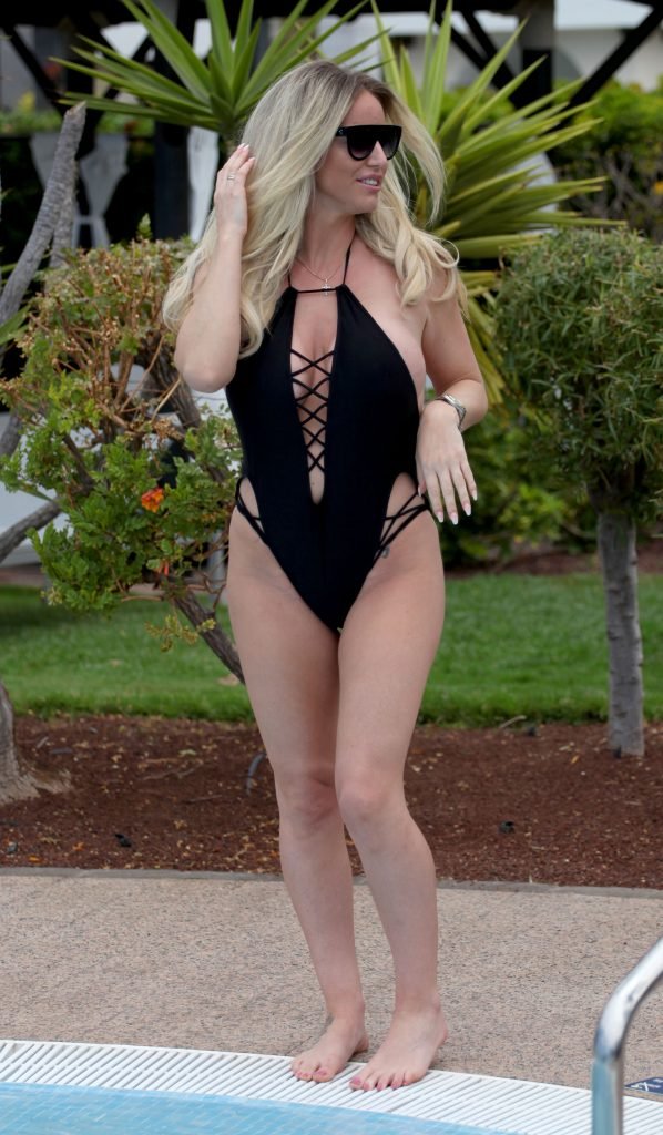 Danielle Mason exibe os resultados de sua recente perda de peso, enquanto luta com seu maiô enquanto toma sol na Espanha, 01/05/2018. A modelo glamour, atriz e apresentadora de TV Danielle teve dificuldade em conter seus atributos ao mostrar um mamilo enquanto ajustava seu maiô.