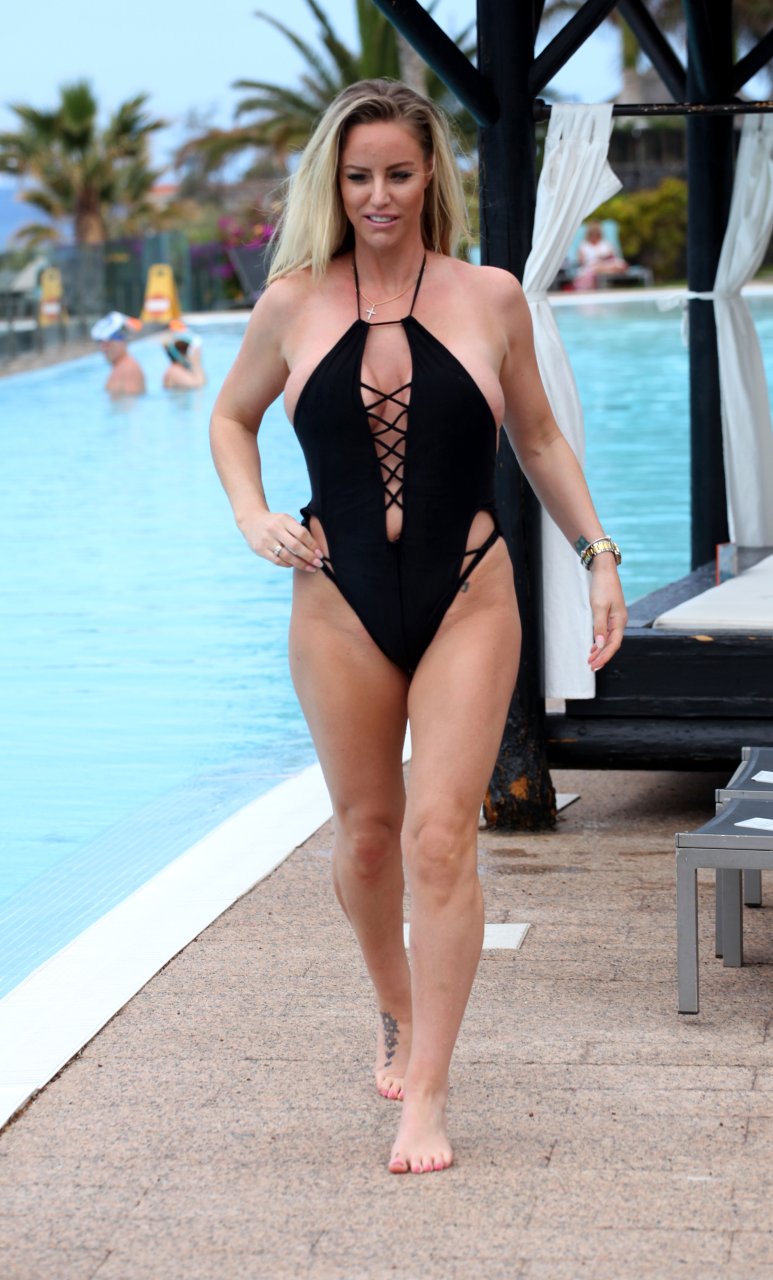 Danielle Mason exibe os resultados de sua recente perda de peso, enquanto luta com seu maiô enquanto toma sol na Espanha, 01/05/2018. A modelo glamour, atriz e apresentadora de TV Danielle teve dificuldade em conter seus atributos ao mostrar um mamilo enquanto ajustava seu maiô.