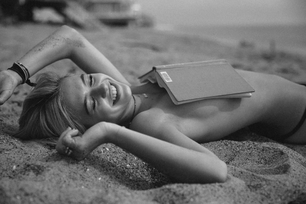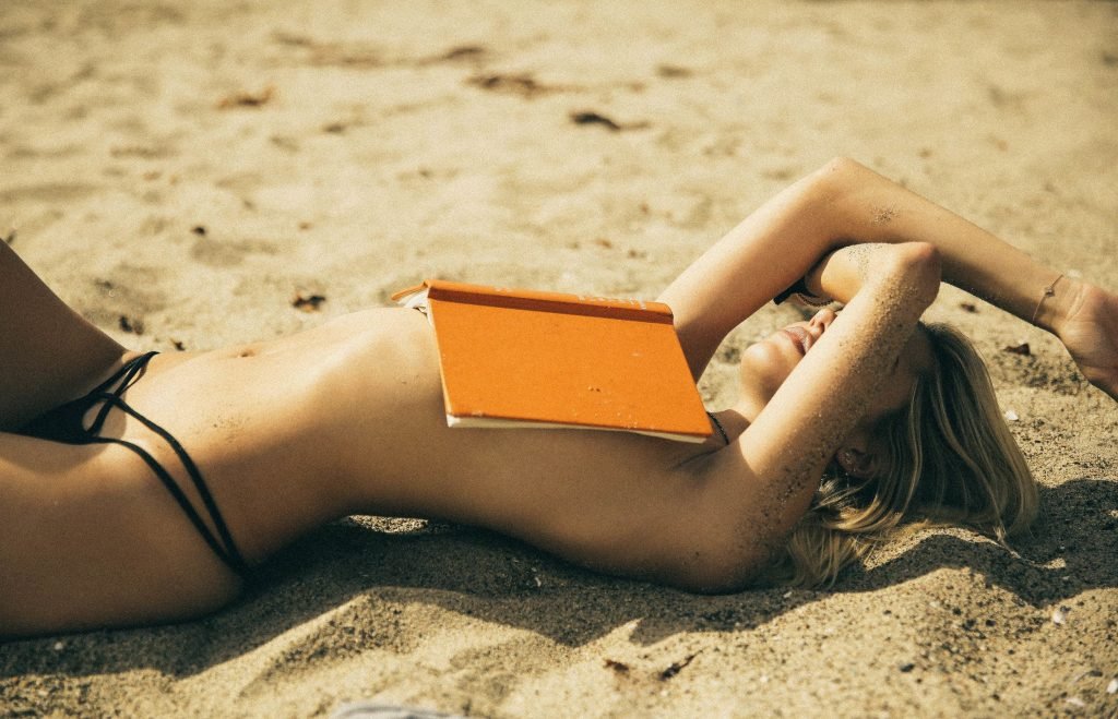 Ela sempre fica na praia com um braço sobre os seios? Deve ser cansativo. Ou coloca um top de biquíni ou deixa os mamilos respirarem.
