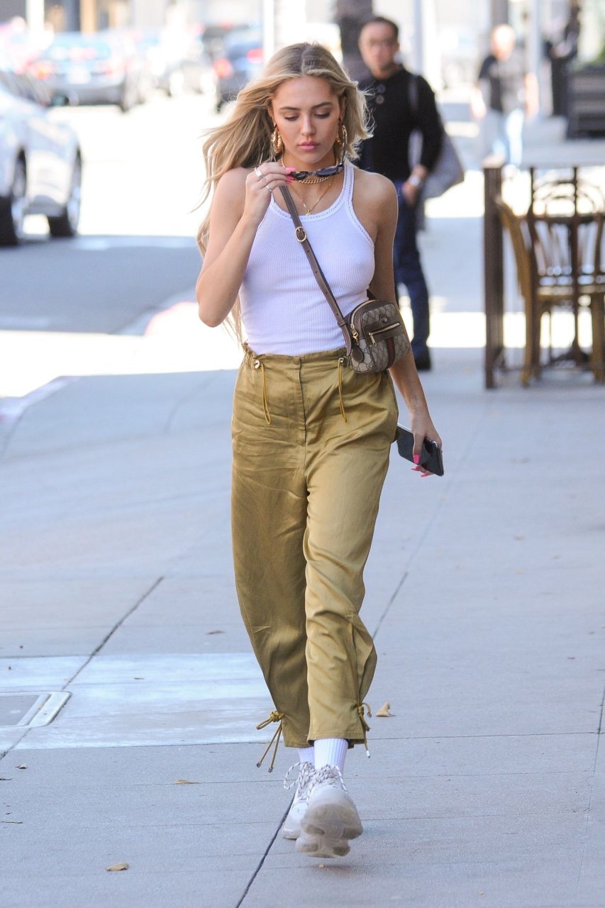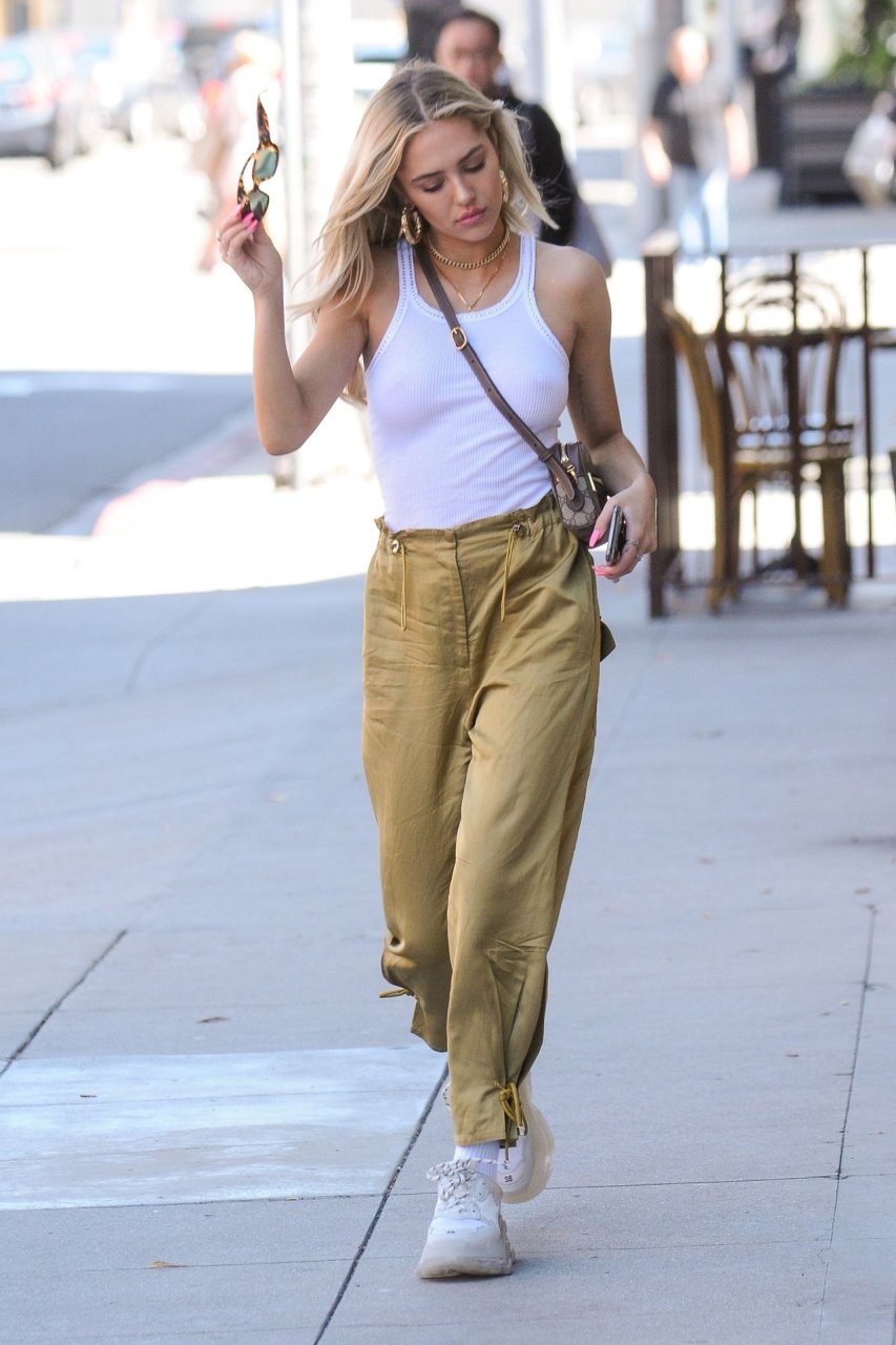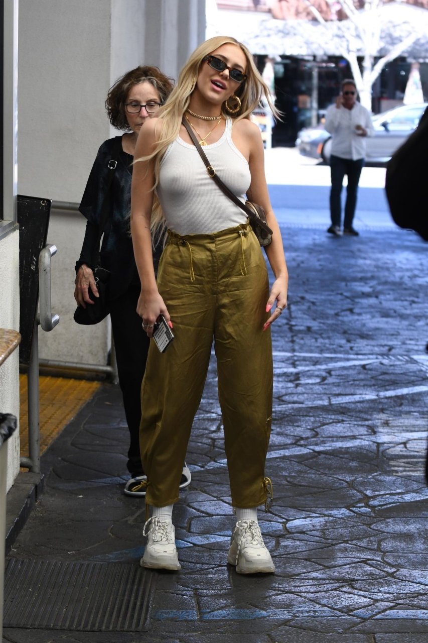 Delilah Hamlin visita salão de cuidados com a pele e almoça no E Baldiin em Beverly Hills, 18/04/2019. A estrela americana das redes sociais de 20 anos usava uma camiseta branca sem sutiã. Ela é uma membro VIP do clube No Bra!